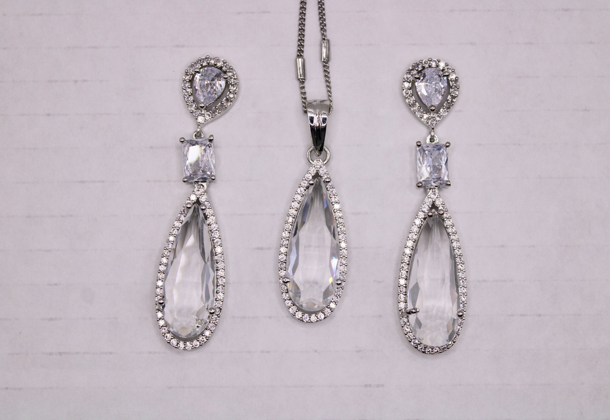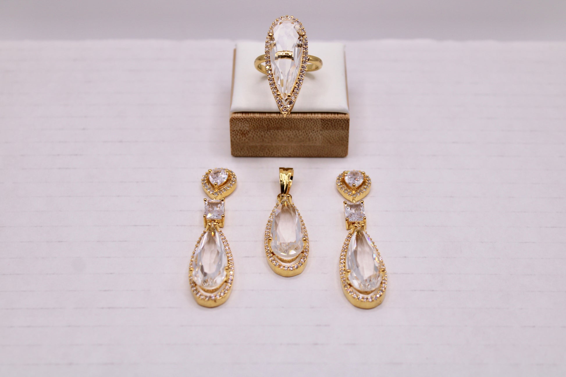 This dazzling pendant set is complete with pear-cut cubic zirconia throughout, and it includes matching earrings as well as a ring. Available in two variations.