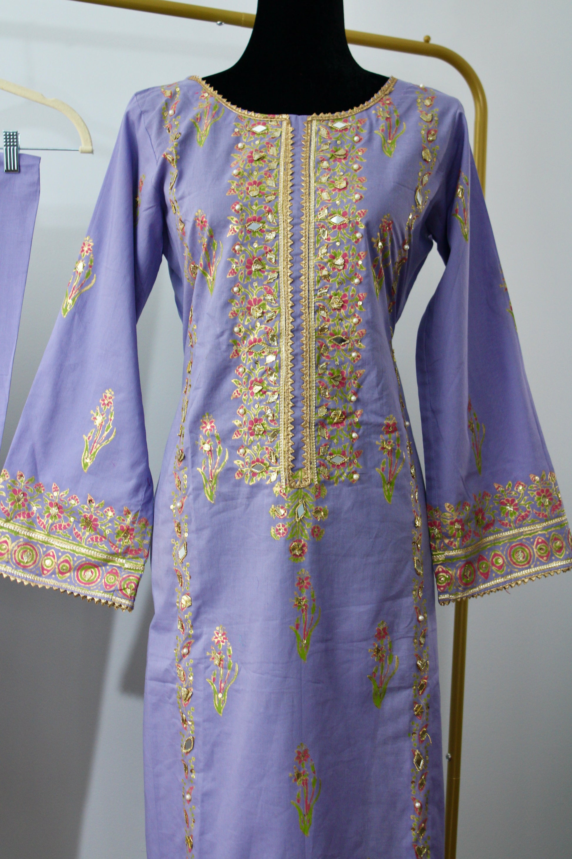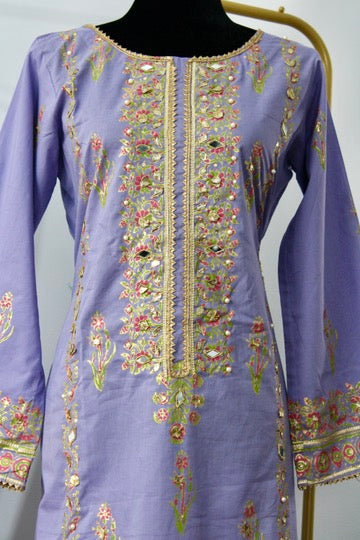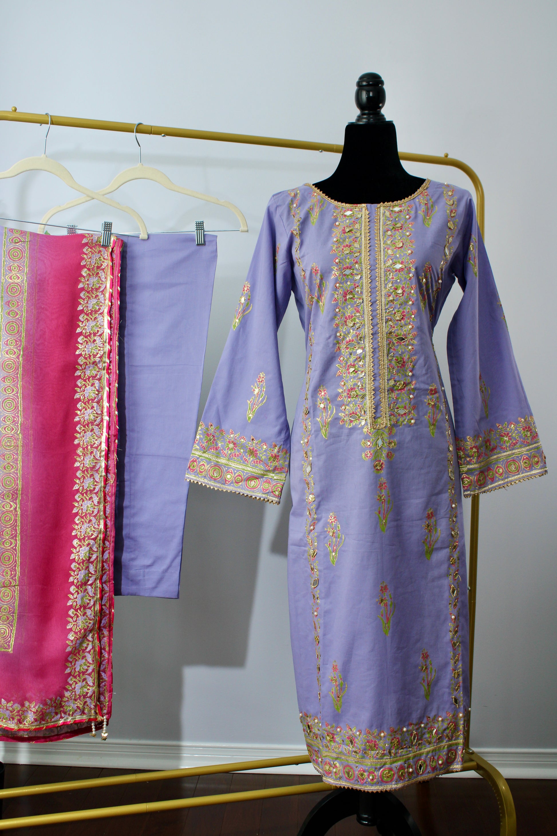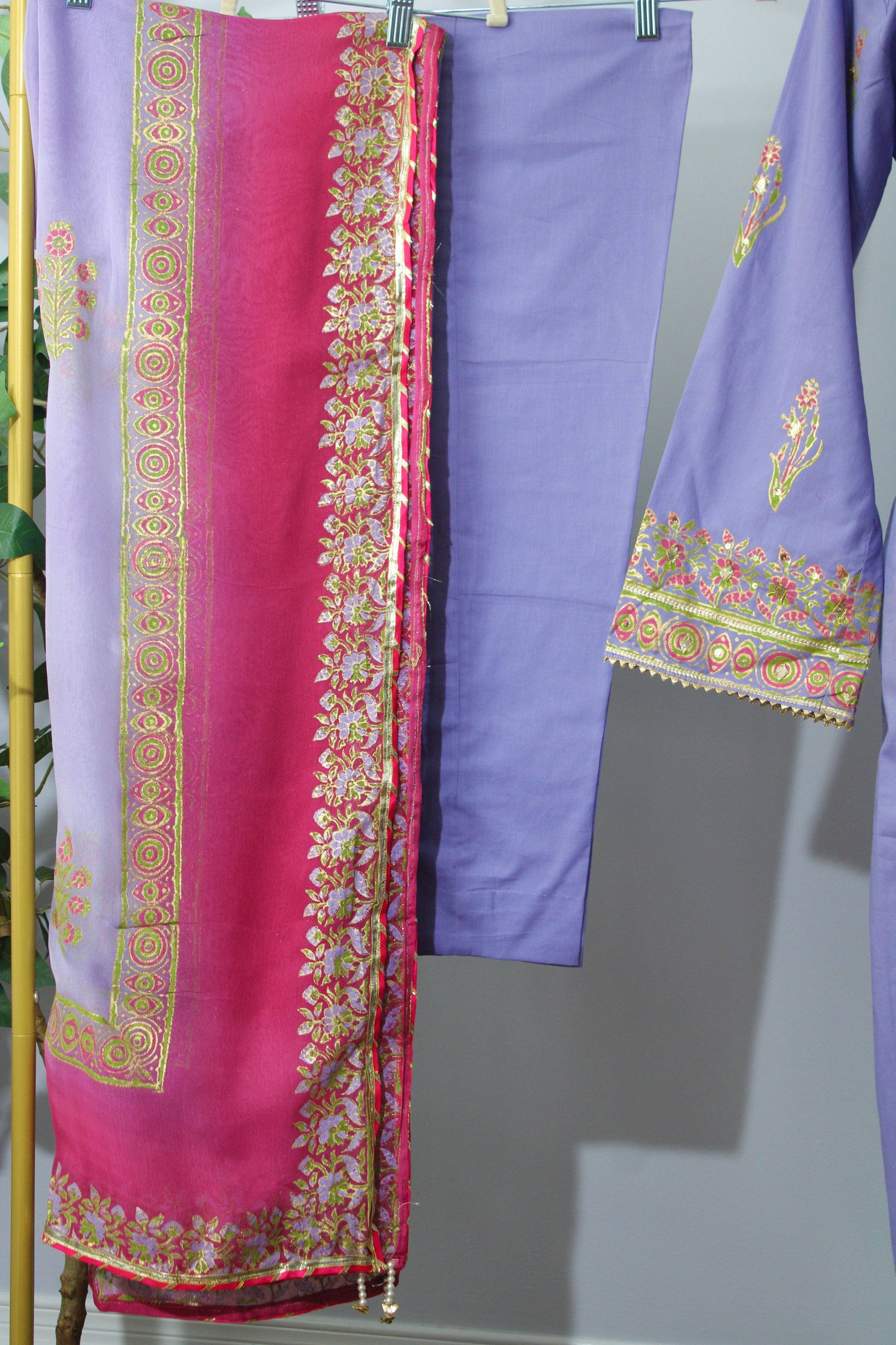 This gorgeous three piece suit is stitched and ready to wear. The top is block printed lawn, with hand sewn embellishments including mirrors, pearls, sequins and gota. The suit includes matching lawn cigarette pants and a stunning double shaded georgette dupatta complete with gota pati and tassel.