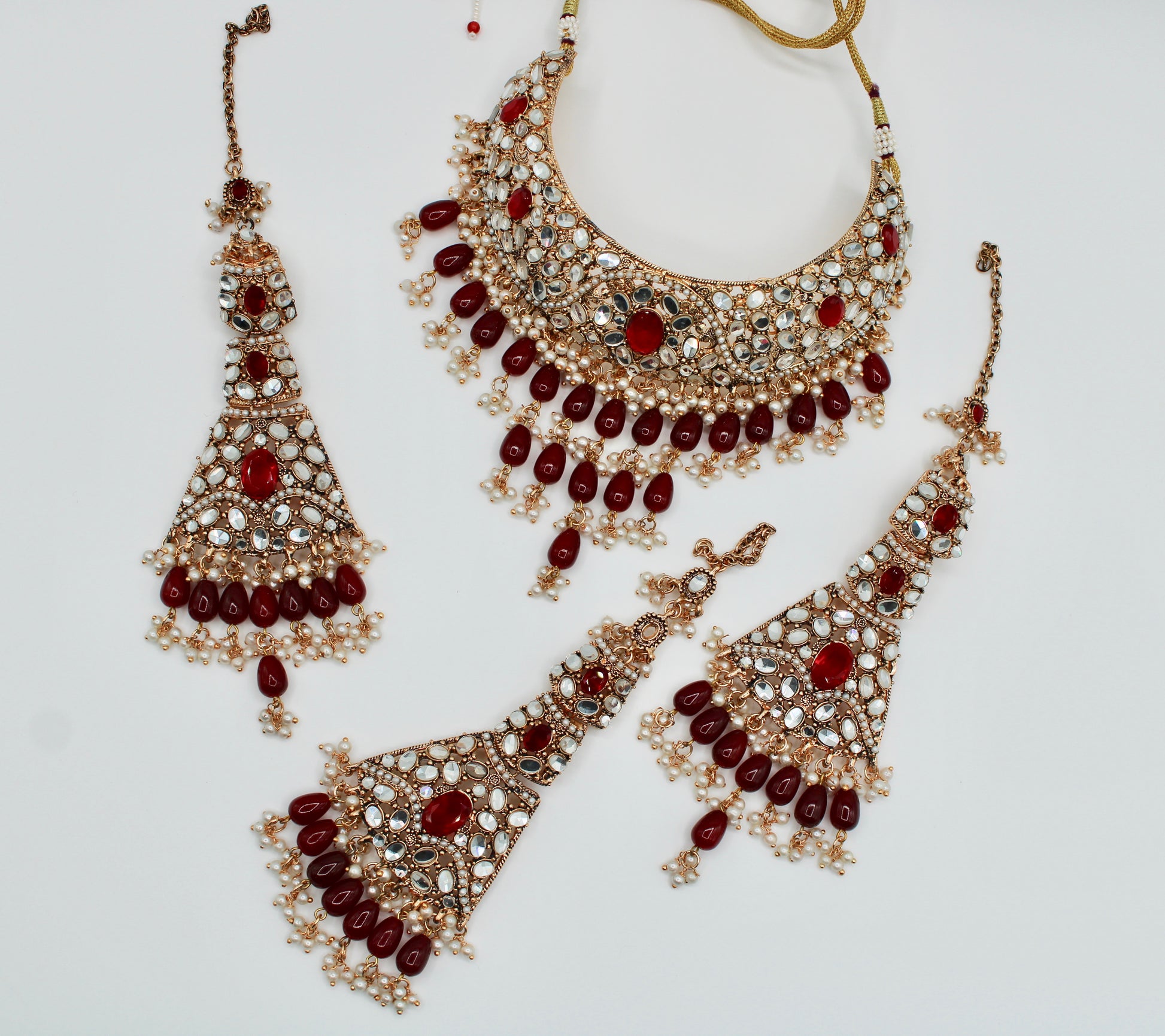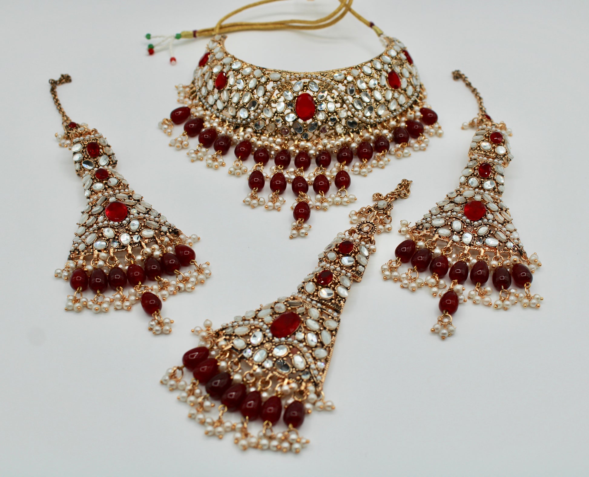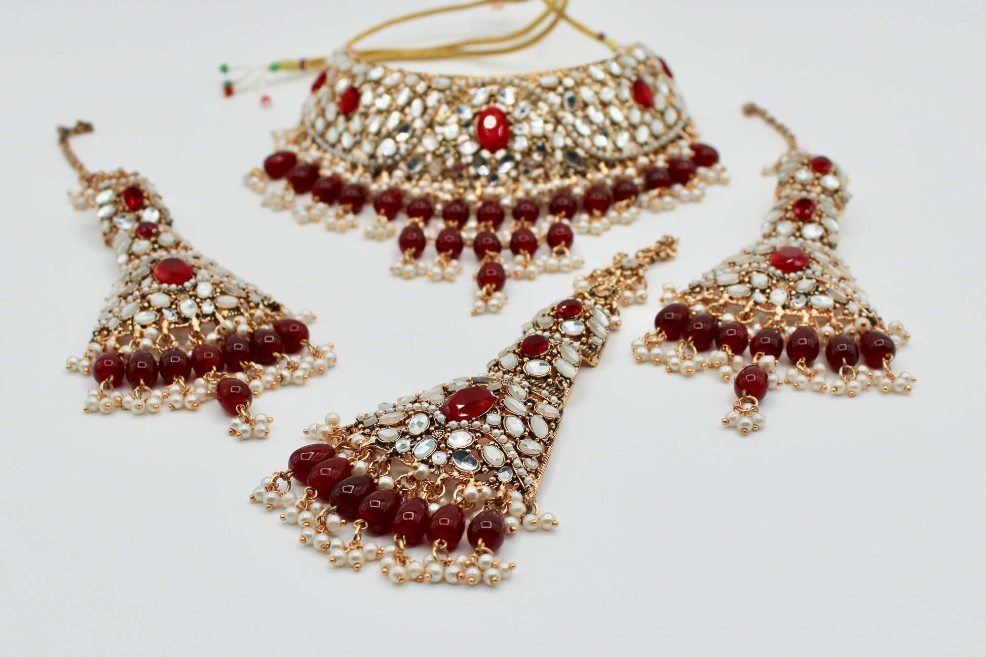 This stunning bridal choker set is fully detailed with sheesha-kundan, pearls, rhinestones, pearls and bead detailing. It includes a heavy teeka and matching earrings. Made of brass to increase product lifetime.