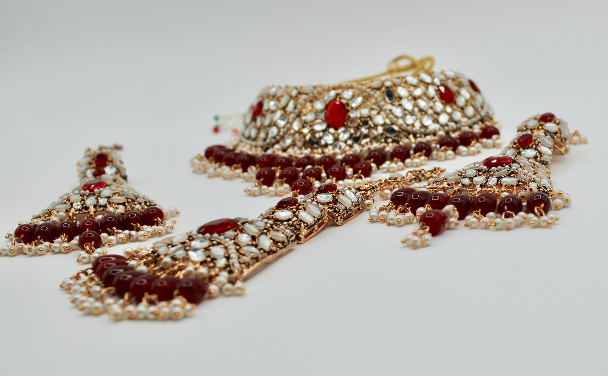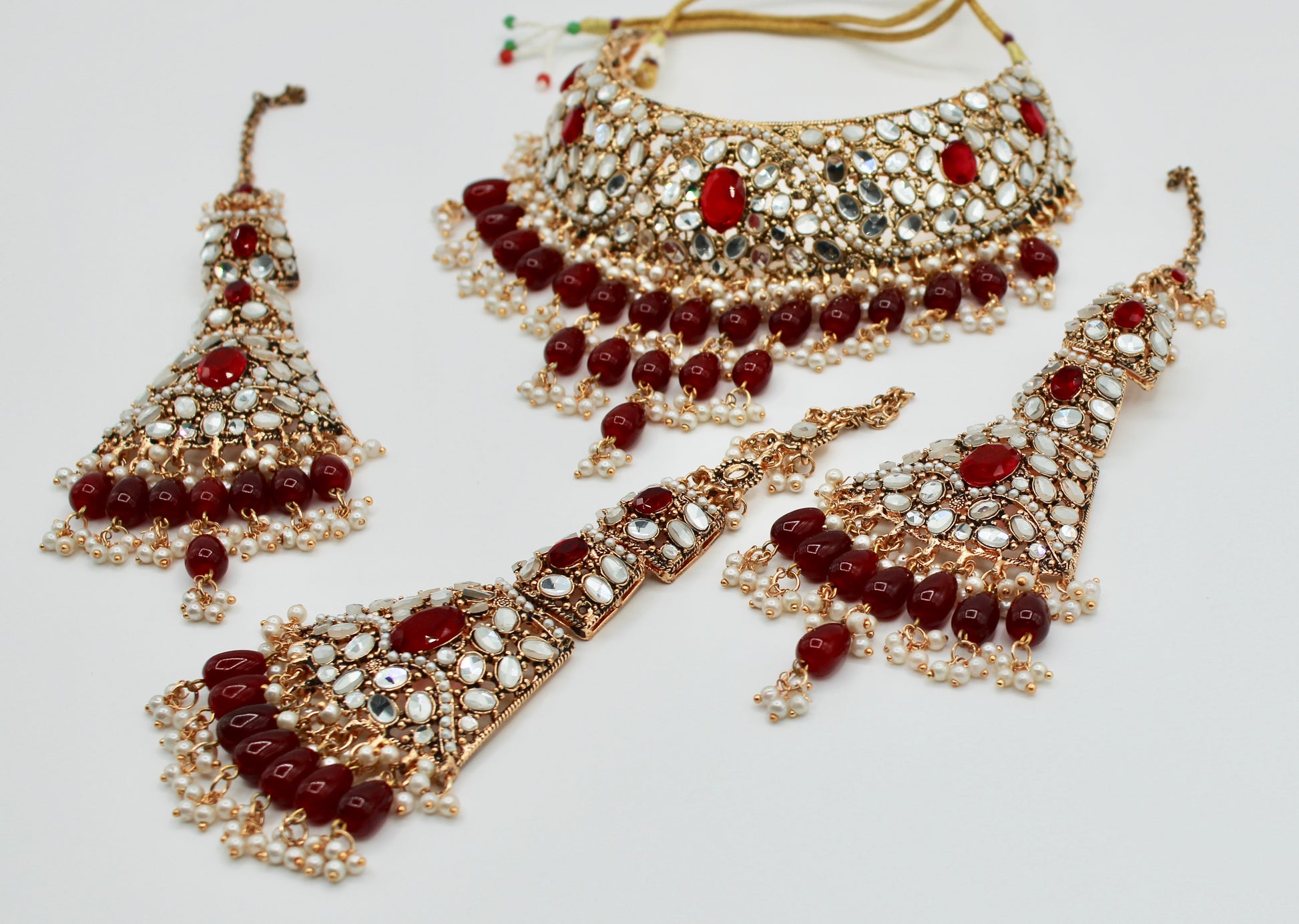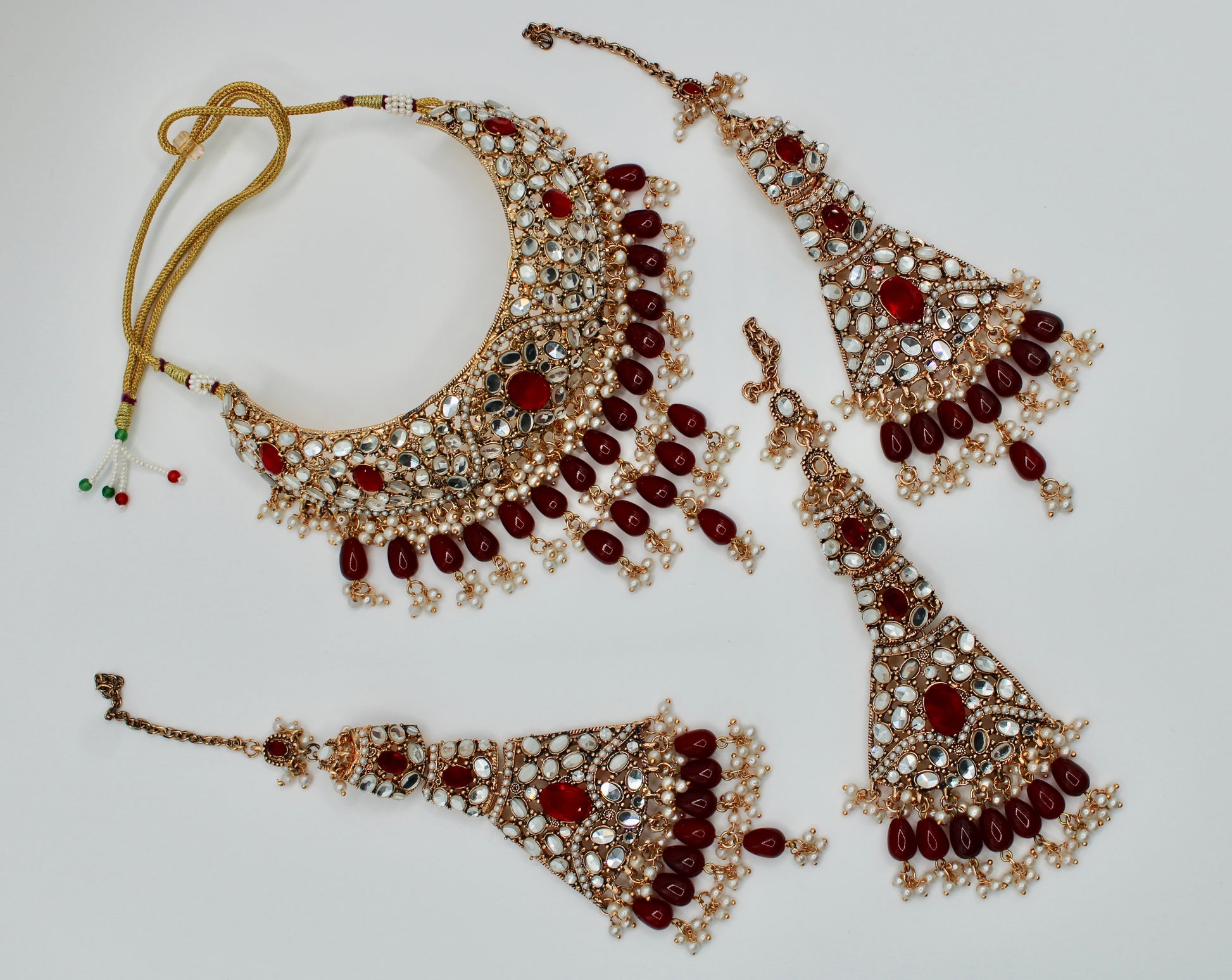 This stunning bridal choker set is fully detailed with sheesha-kundan, pearls, rhinestones, pearls and bead detailing. It includes a heavy teeka and matching earrings. Made of brass to increase product lifetime.