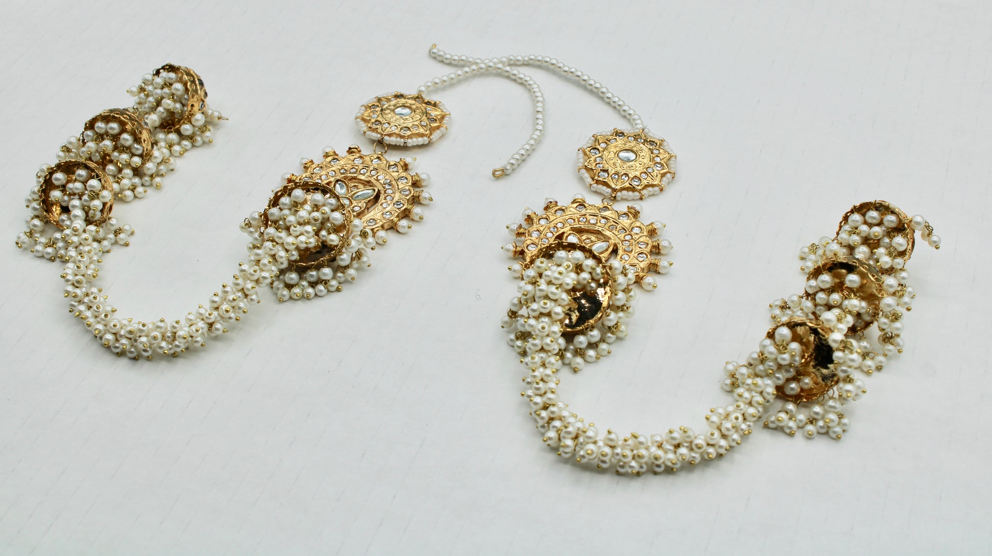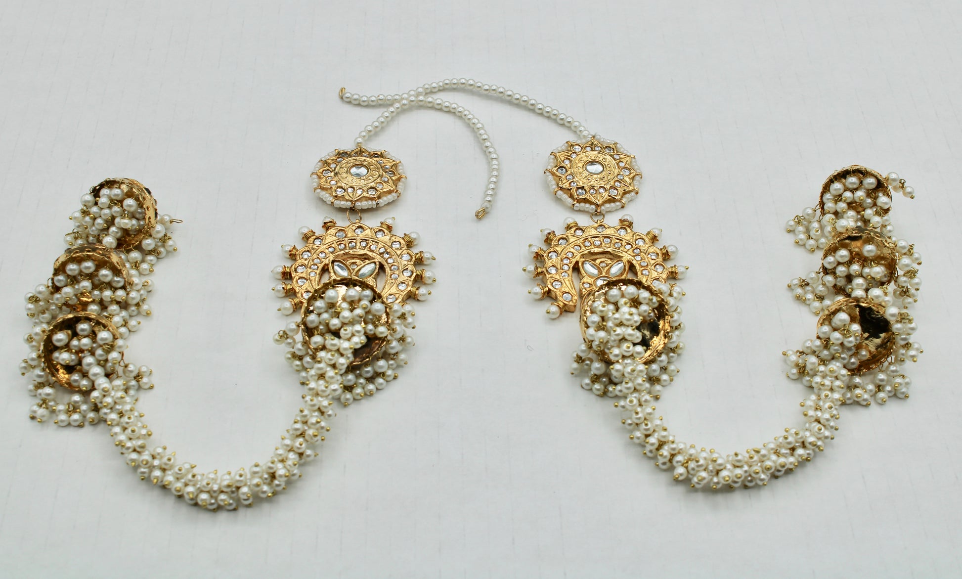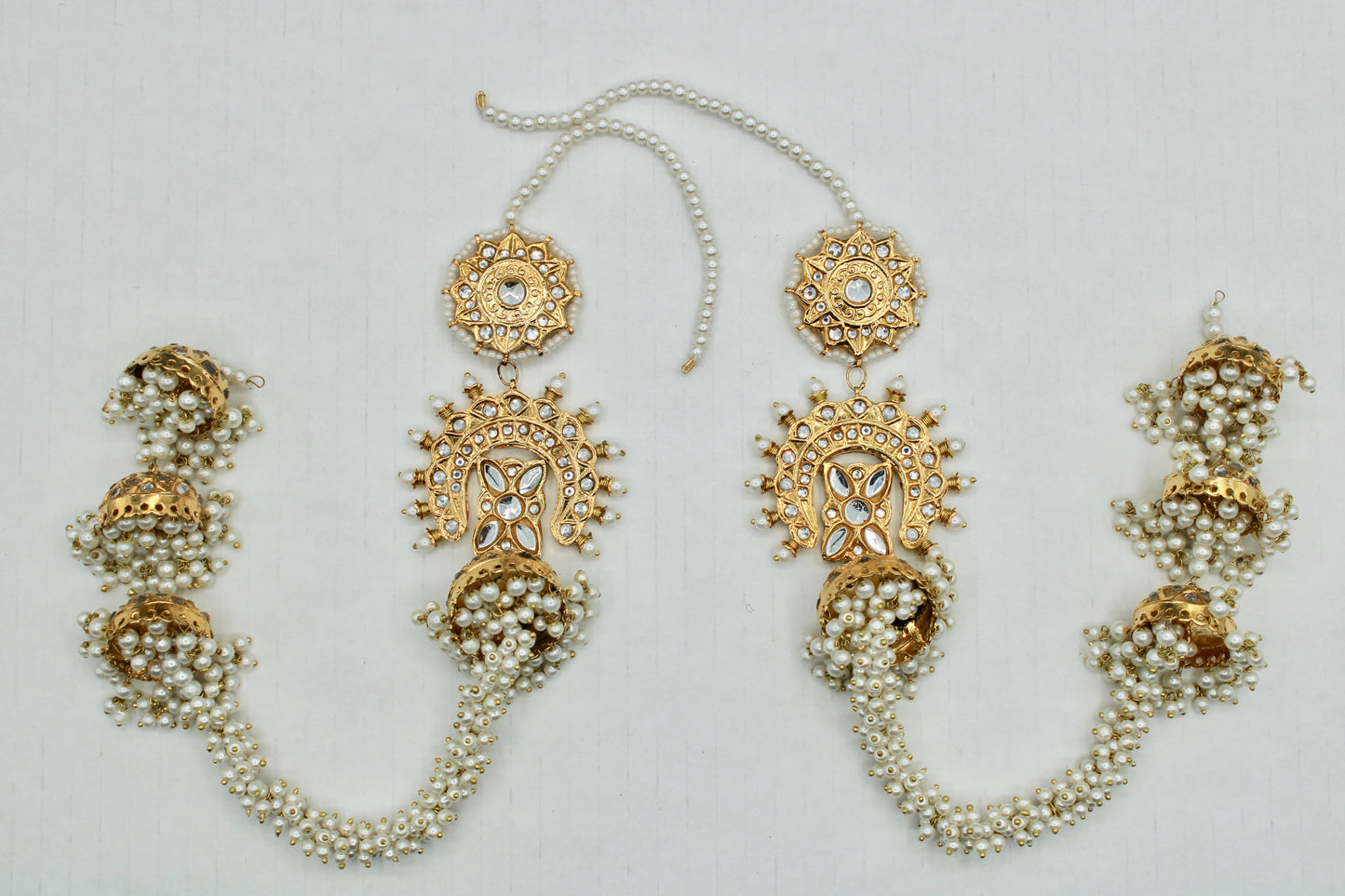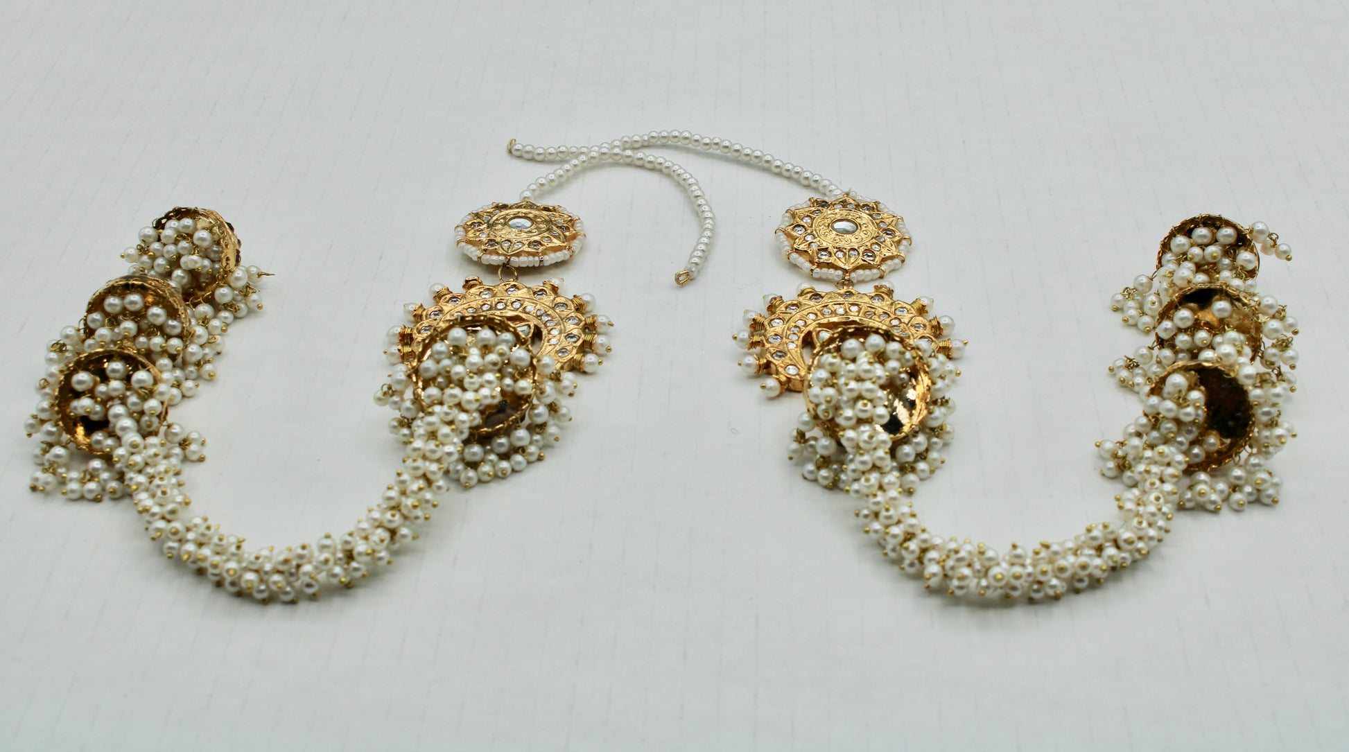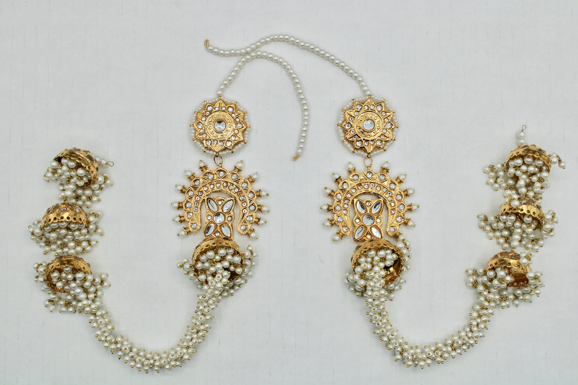 These stunning Pakistani thappa kundan earrings are complete with gajra jhumki detailing and pearl saharas. These earrings are gold-plated and truly a statement piece.