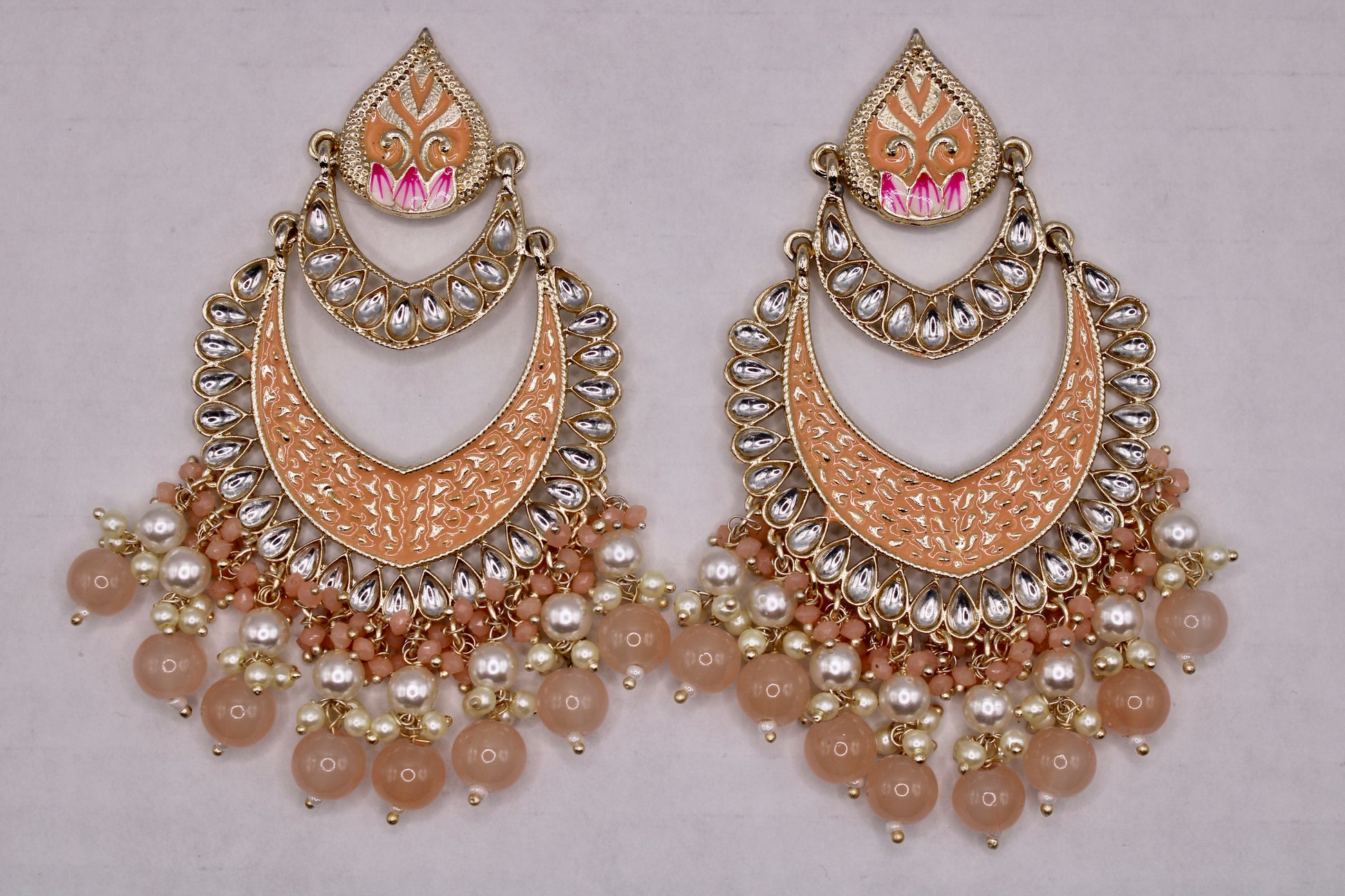 These stunning chaand bali earrings are detailed in faux kundan and completed with hanging pearls. Perfect for a dramatic look.