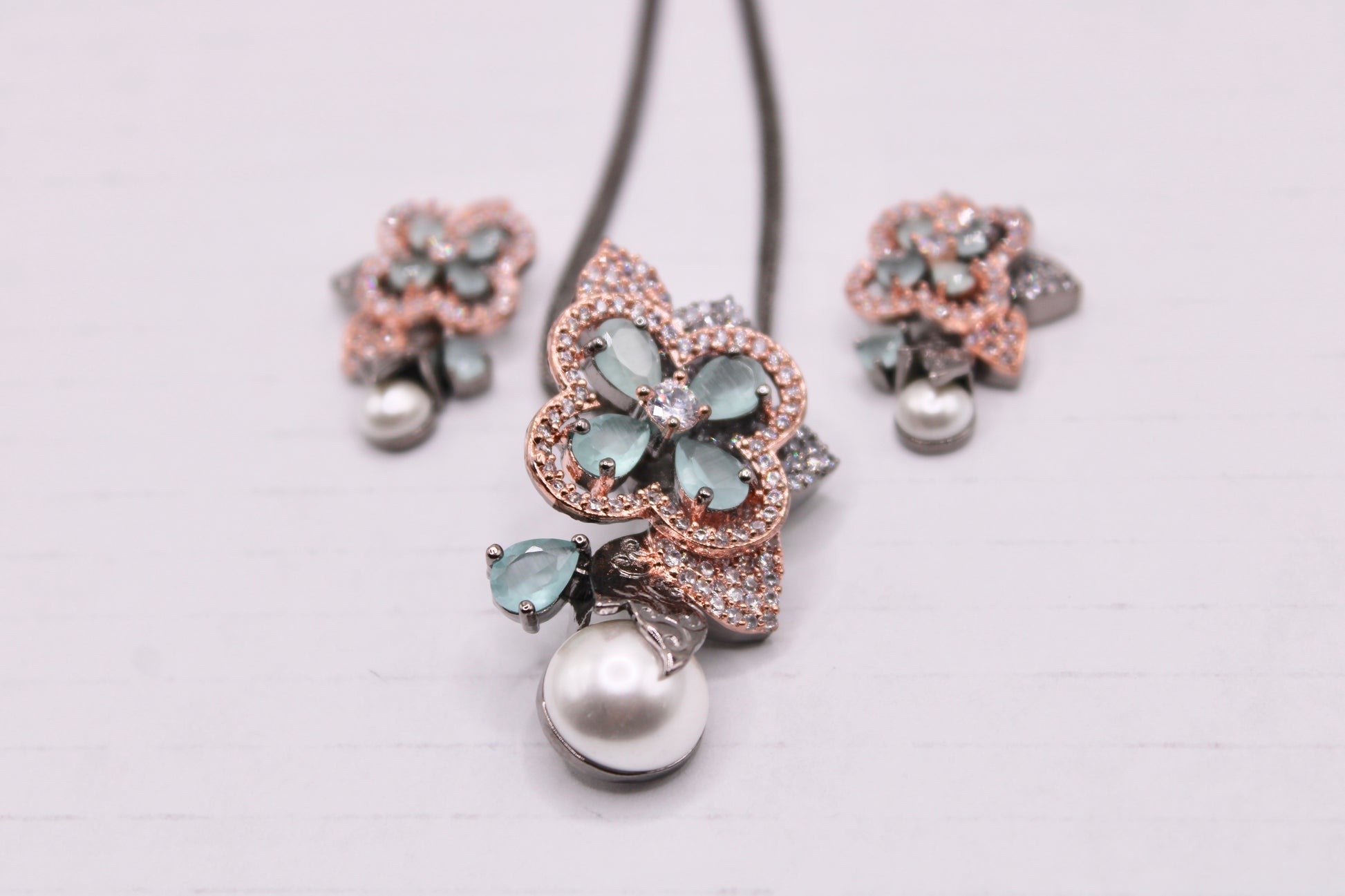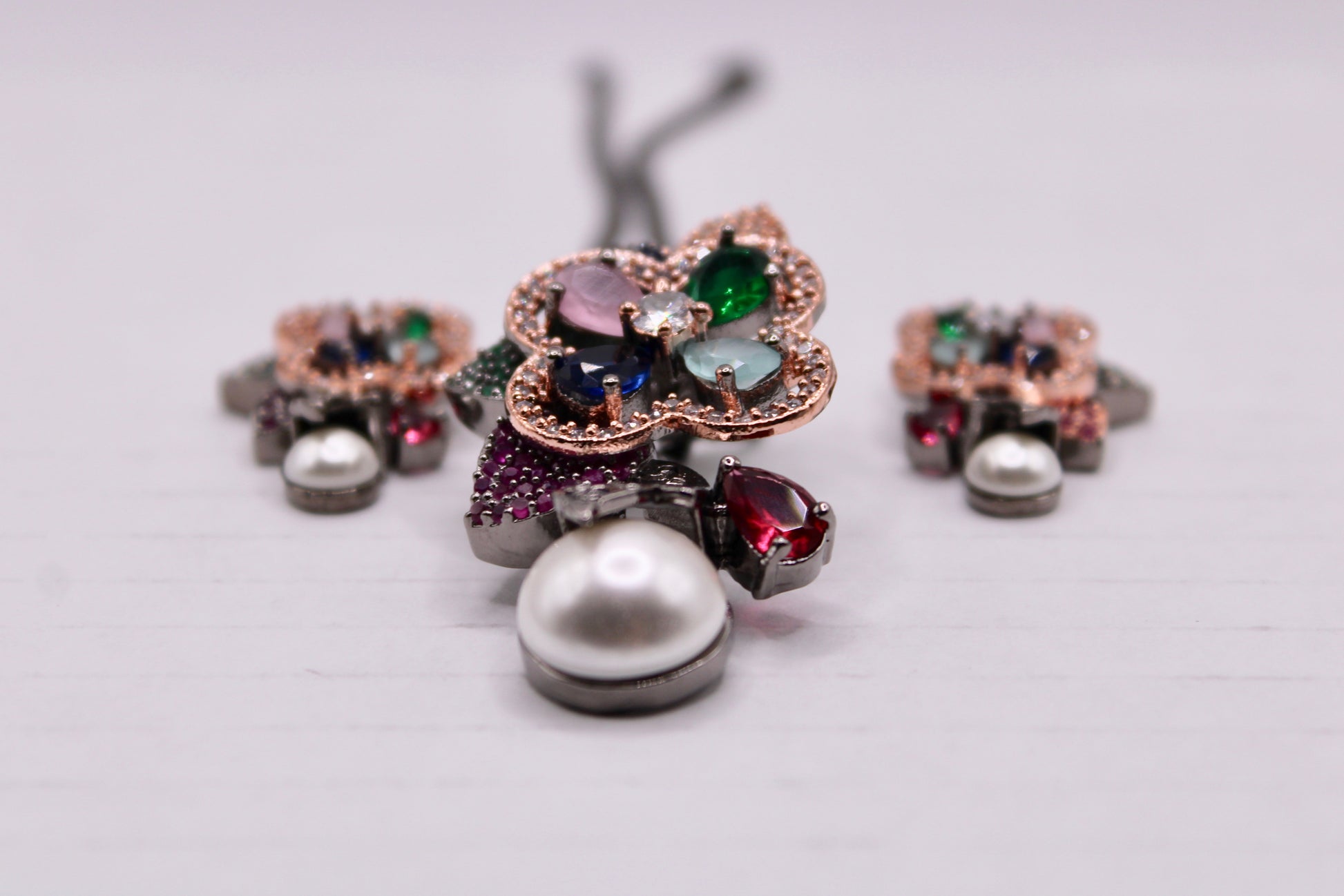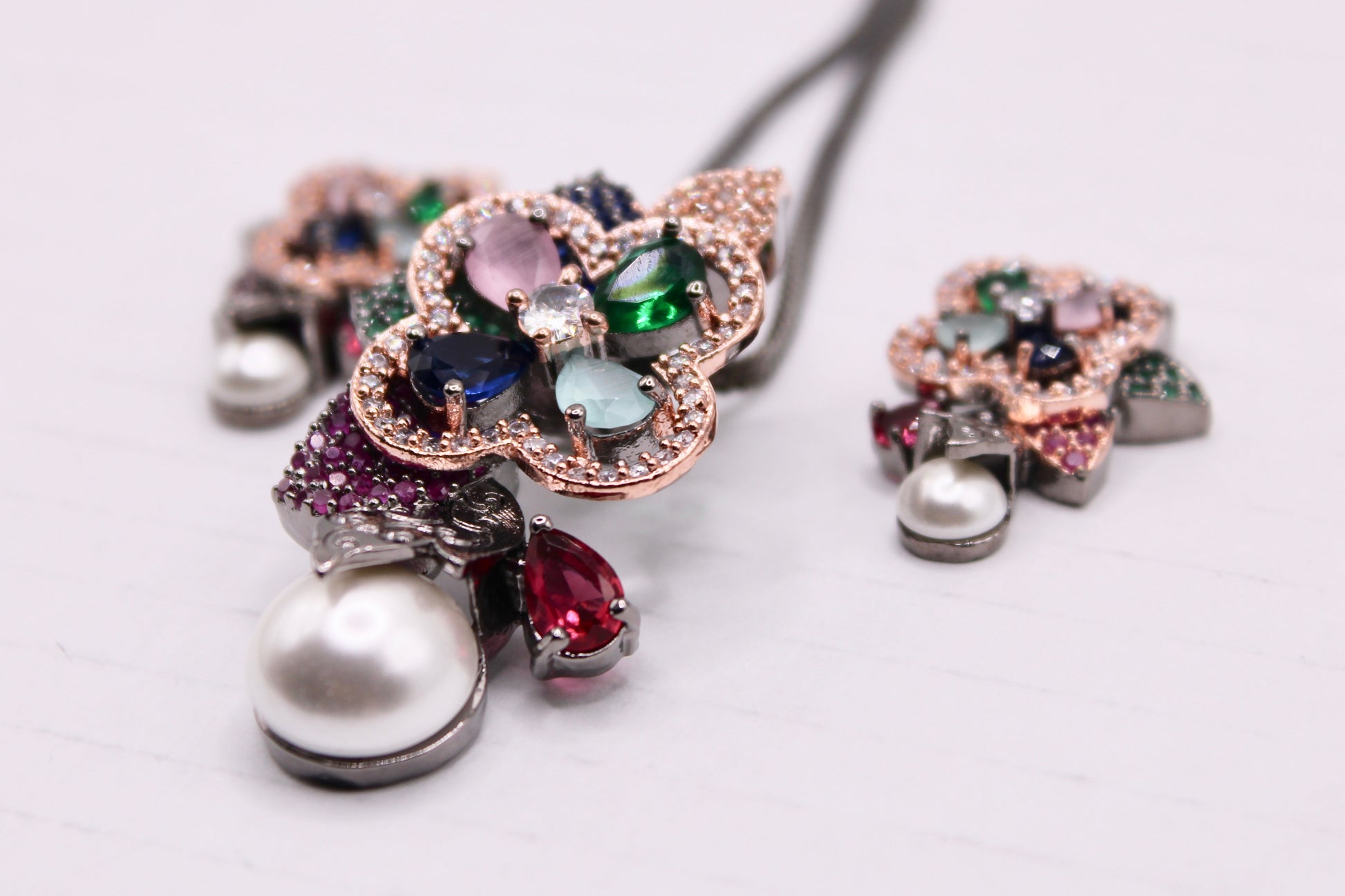 This beautiful fusion pendant set was carefully chosen for you. This Victorian design is complete with matching studs and a chain. Available in green, multicolour, and silver. Made of brass to increase product lifetime.