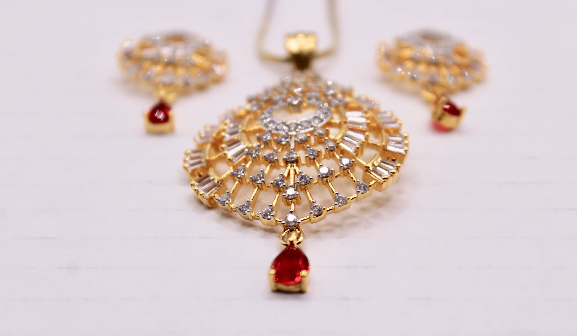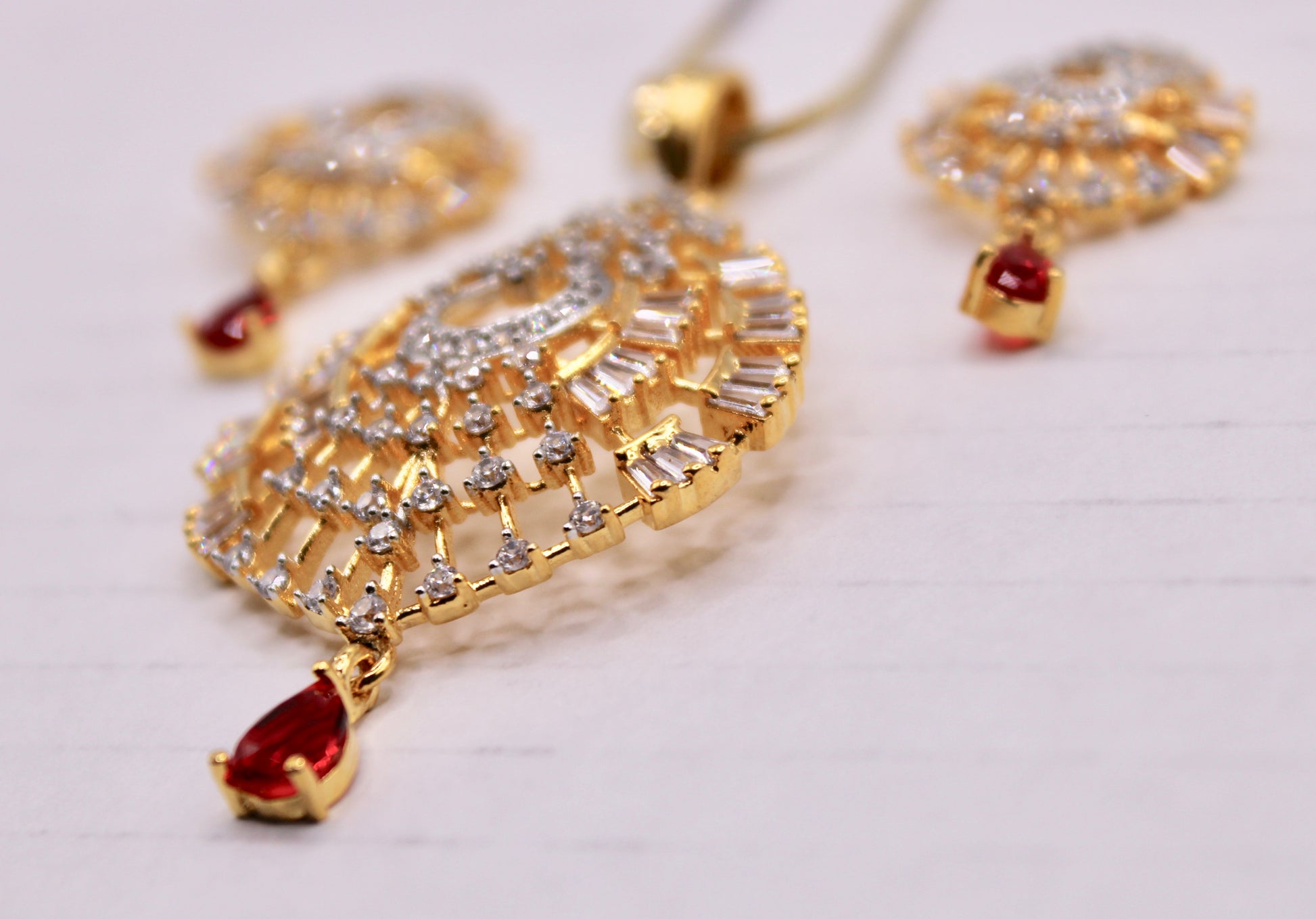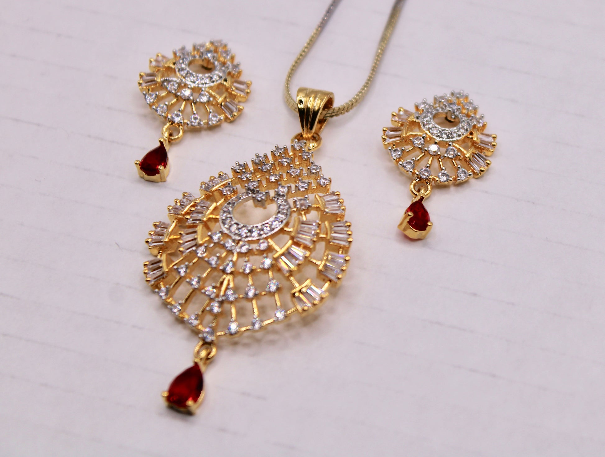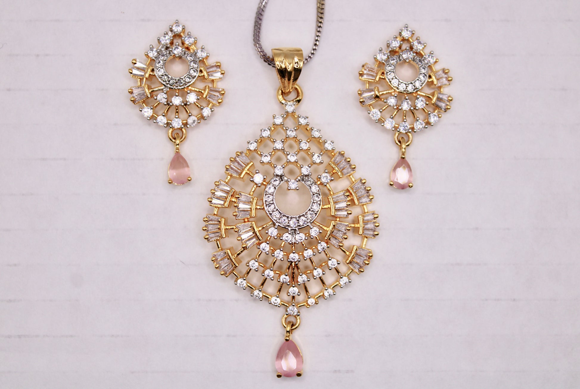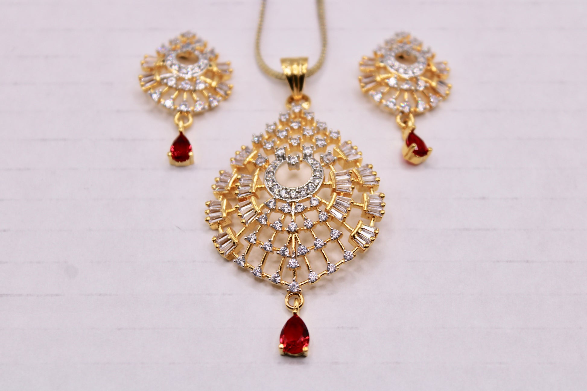 This artfully designed pendant set is soft pink and red cubic zirconia, this splendid pendant set is a must have. This set comes with matching studs and a chain. Made of brass to increase product lifetime.