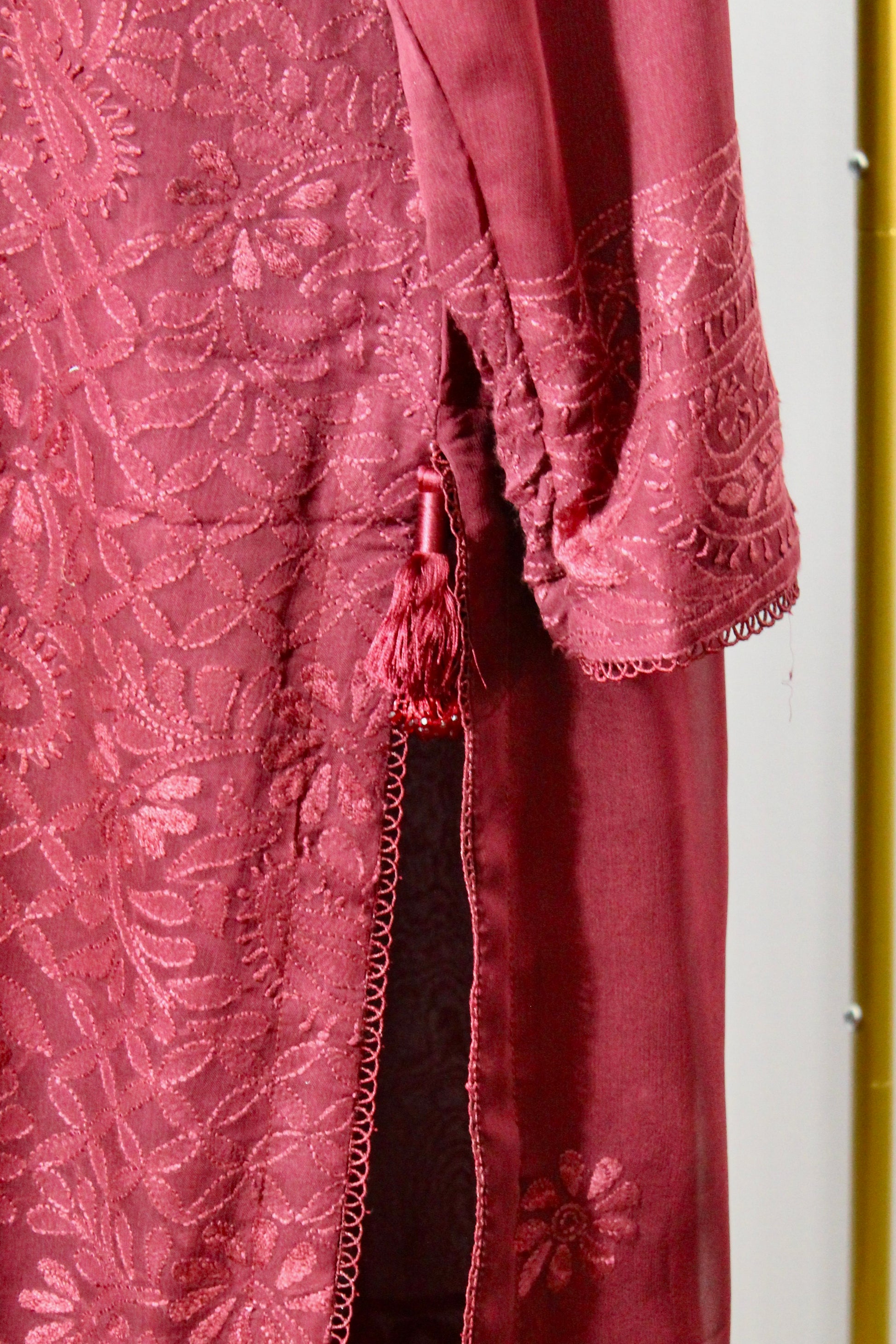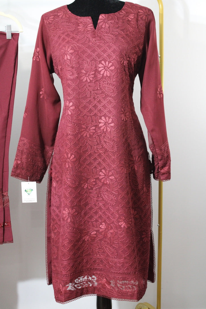 This radiant three piece suit is stitched and ready to wear. It features a semi pure chiffon kameez, with hand-made shadow work detailing and embellishments, and a matching tassel-detailed dupatta. This suit is complete with Russian grip cigarette pants with lace. It is the perfect suit for all age groups and can be easily dressed up or down.