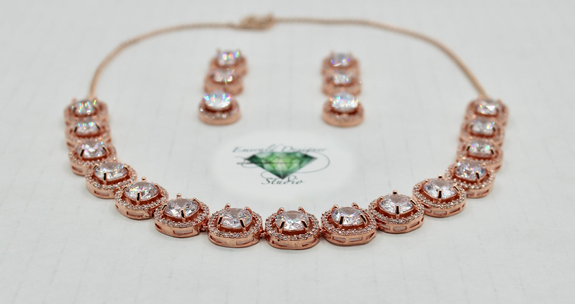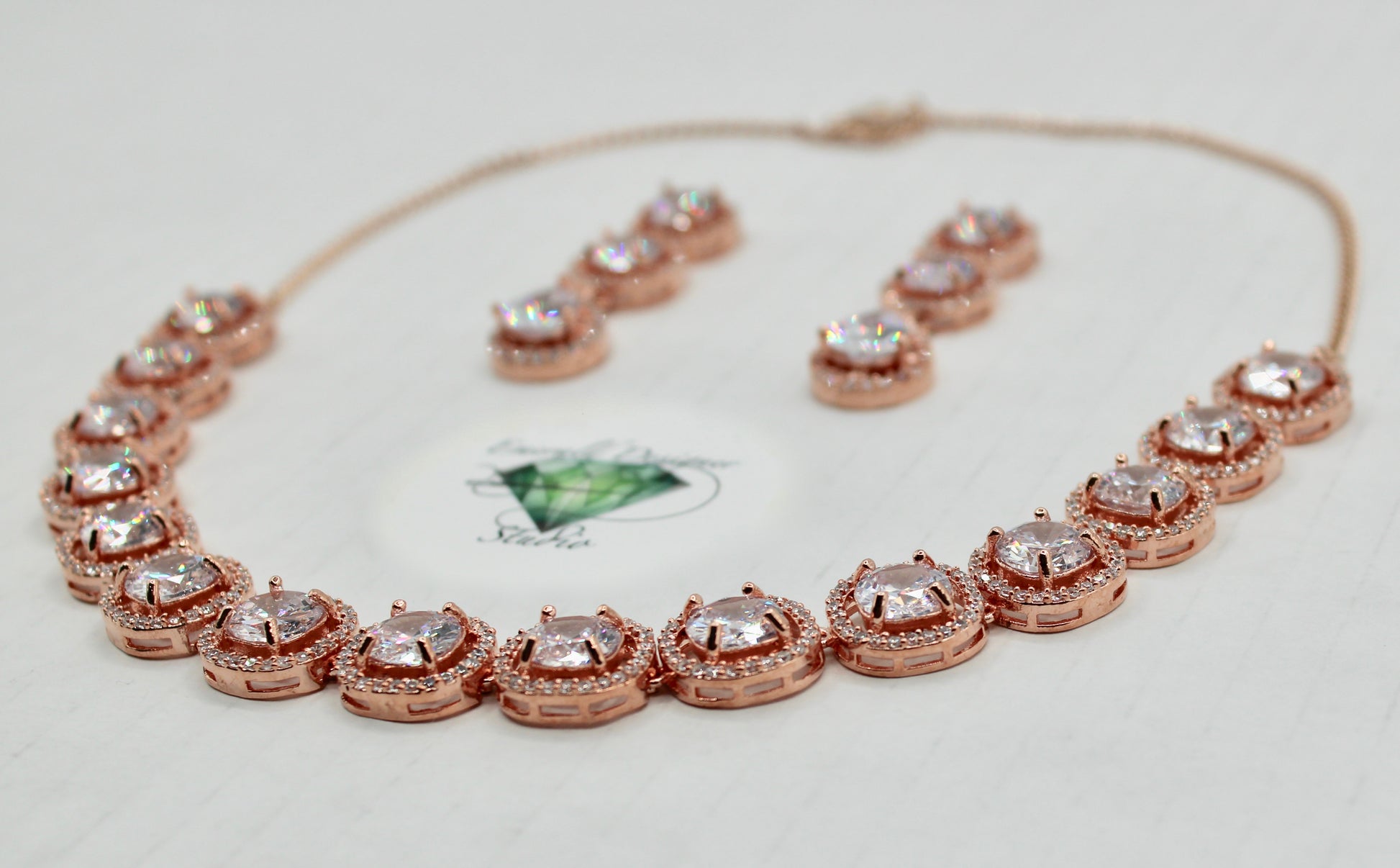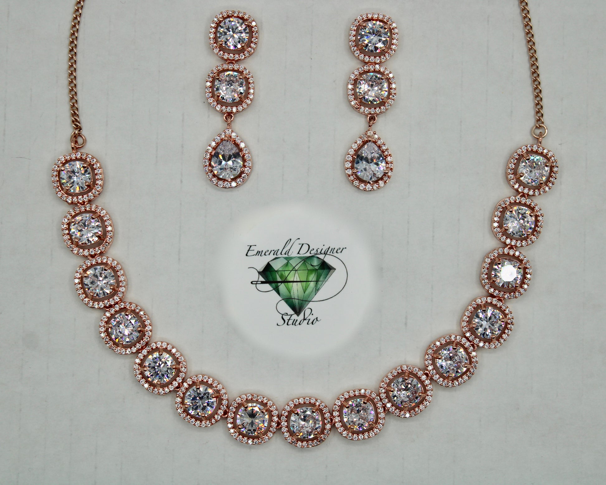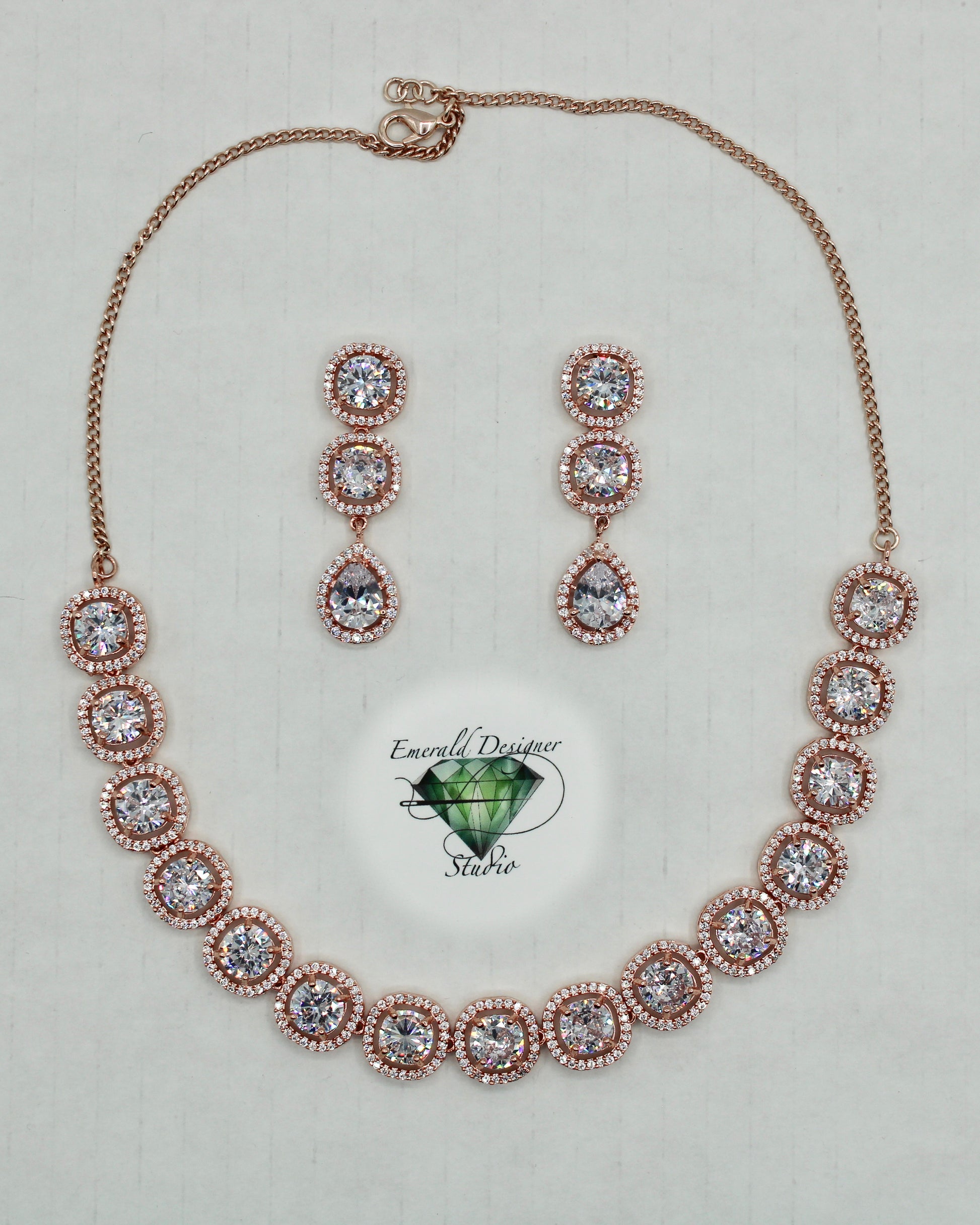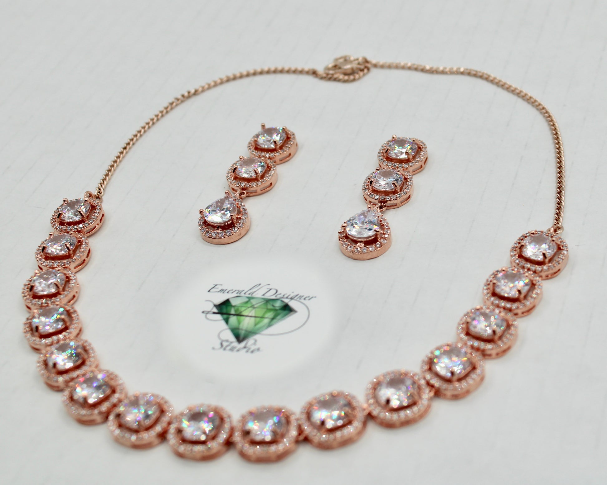This beautiful rose gold necklace set consists of A.D,cubic zirconia and comes with tear drop earrings. Made of brass to increase product lifetime.
