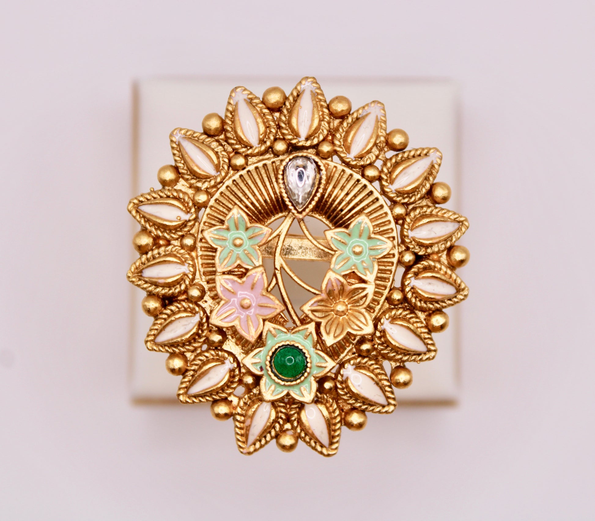 This traditional Rajwadi ring features a beautiful hand-painted design. This ring is adjustable and sure to elevate any outfit. Available in three variations.