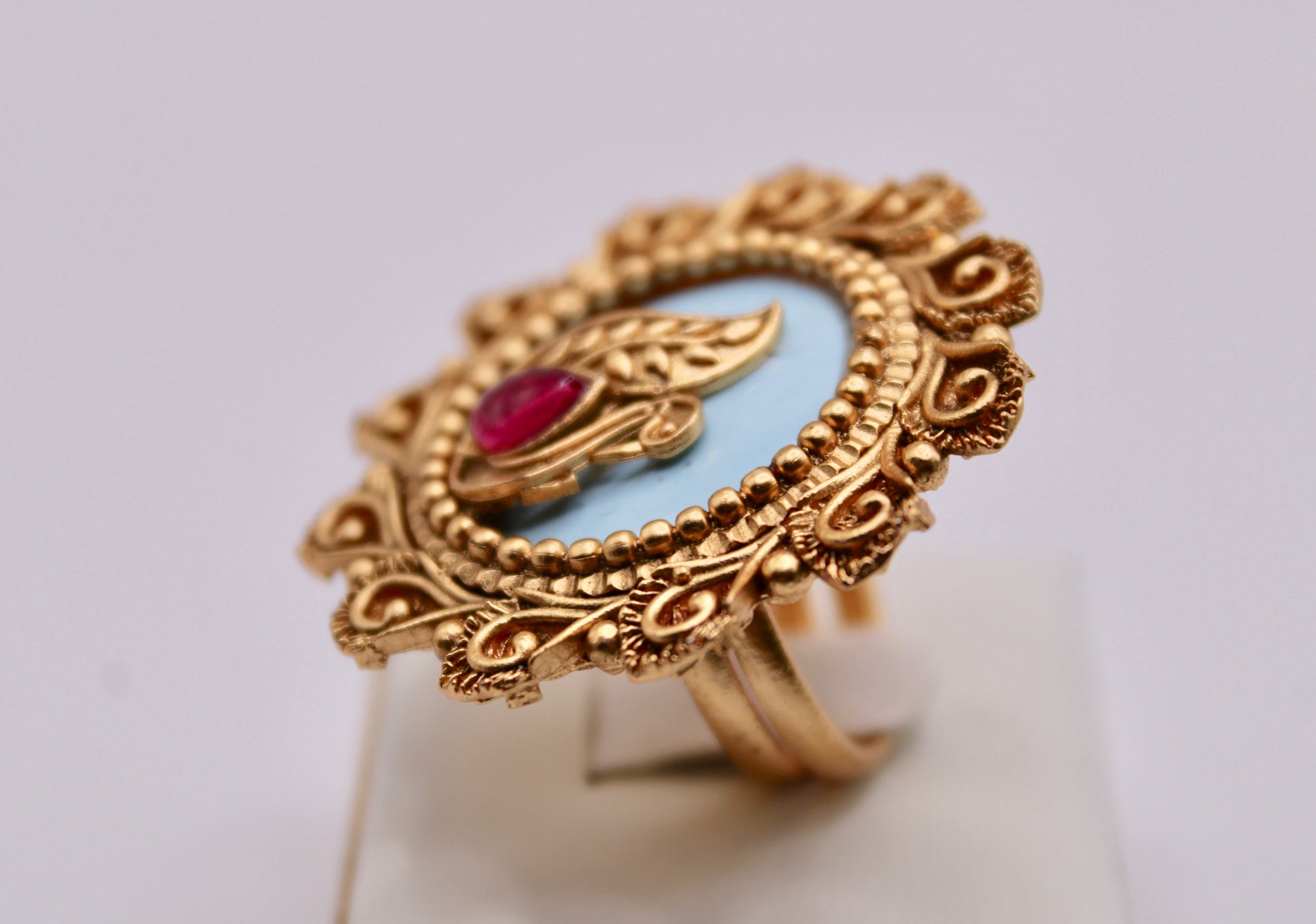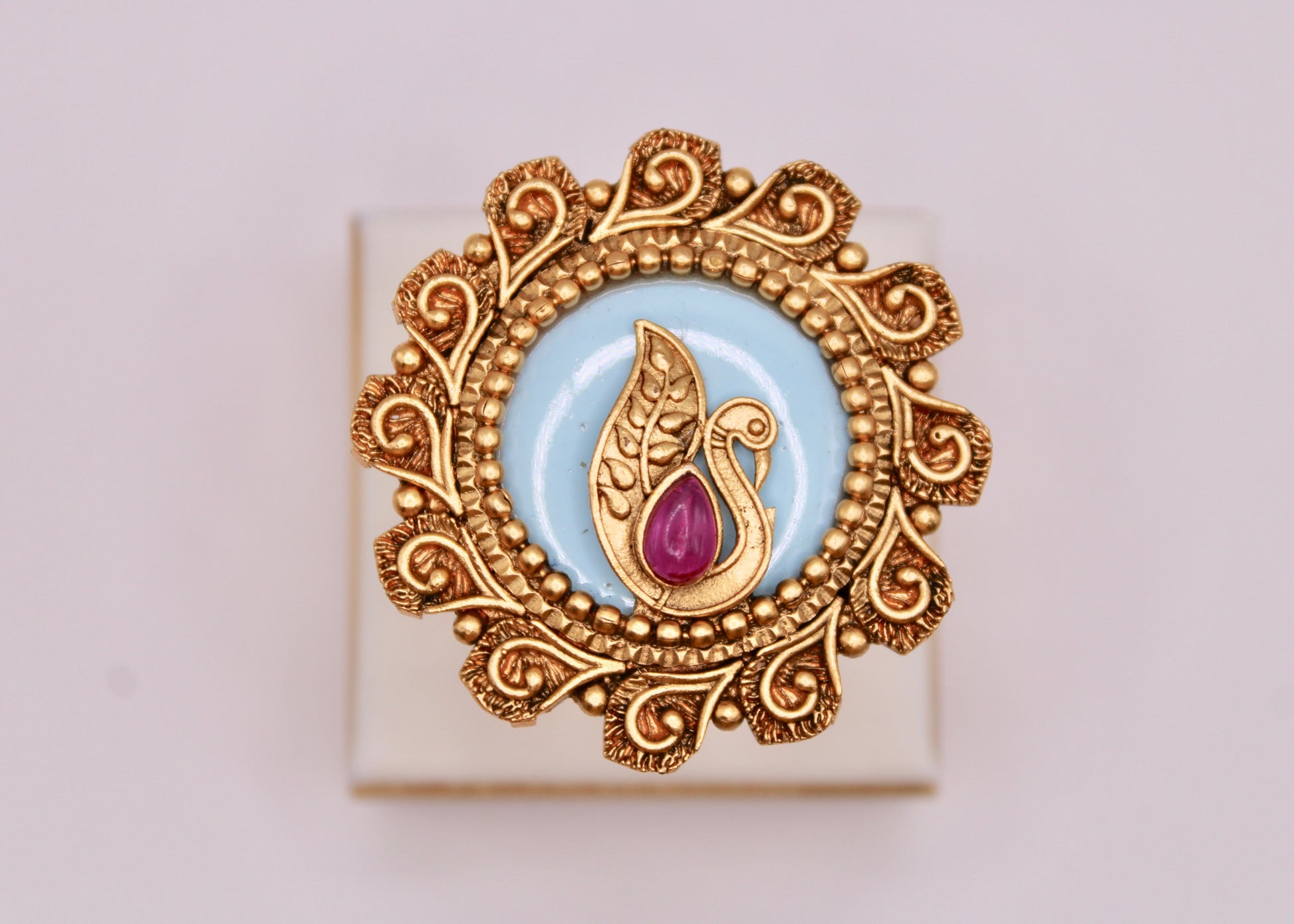This traditional Rajwadi ring features a dazzling kundan design. This ring is adjustable and sure to elevate any outfit.
