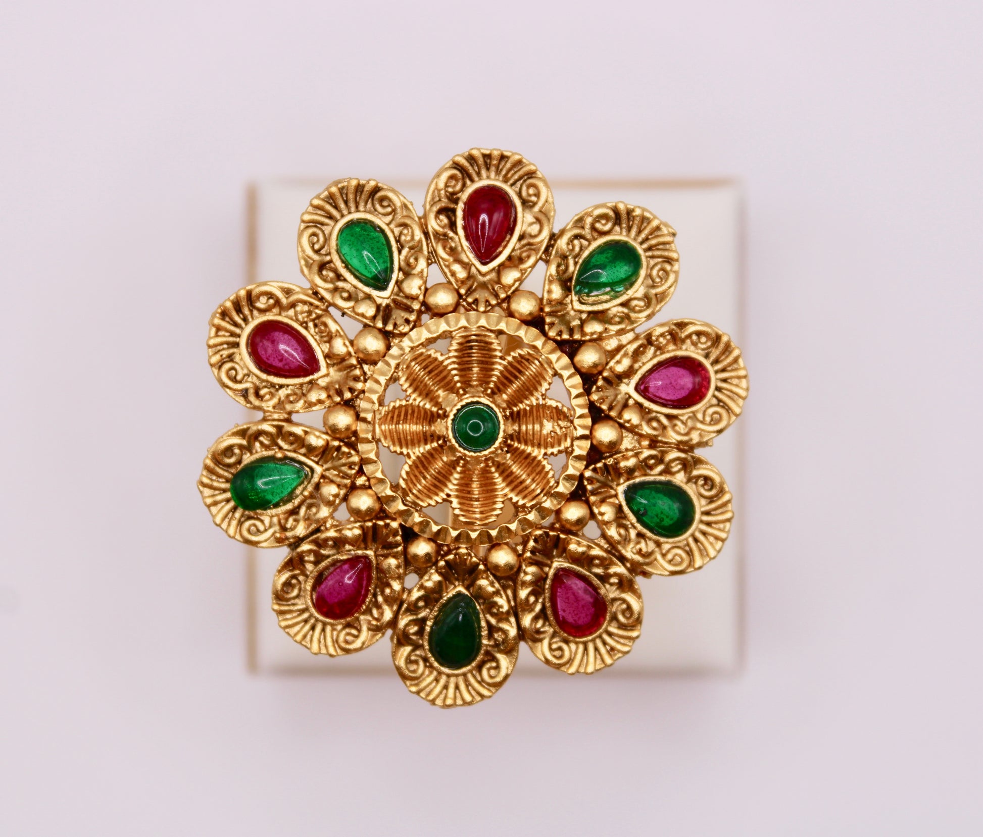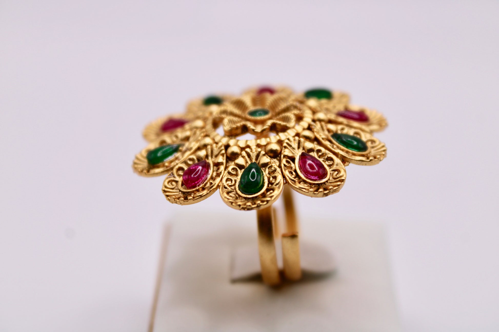 This traditional Rajwadi ring features a dazzling kundan design. This ring is adjustable and sure to elevate any outfit.