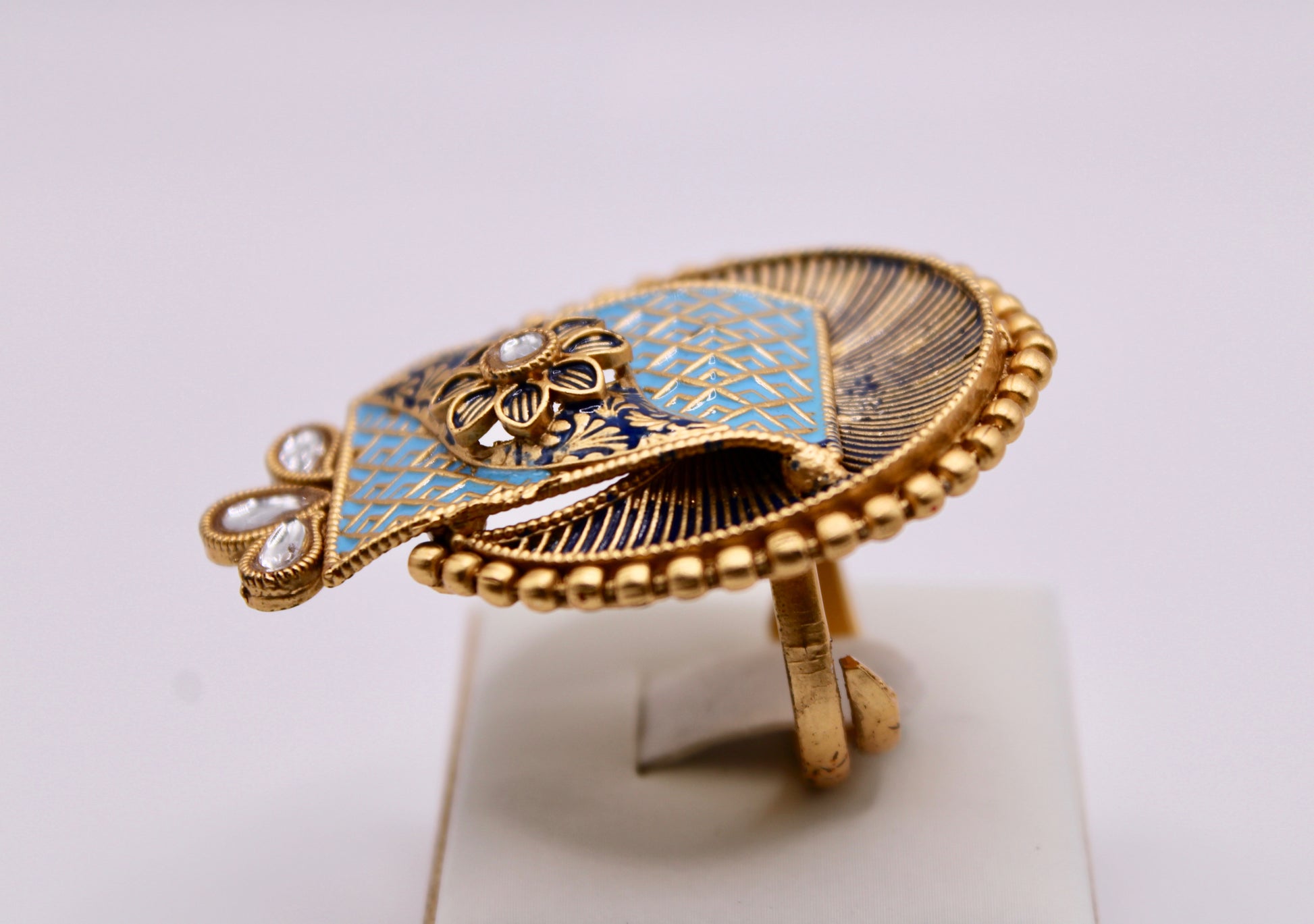 This traditional Rajwadi ring features a beautiful meena and kundan design. This ring is adjustable and sure to elevate any outfit.