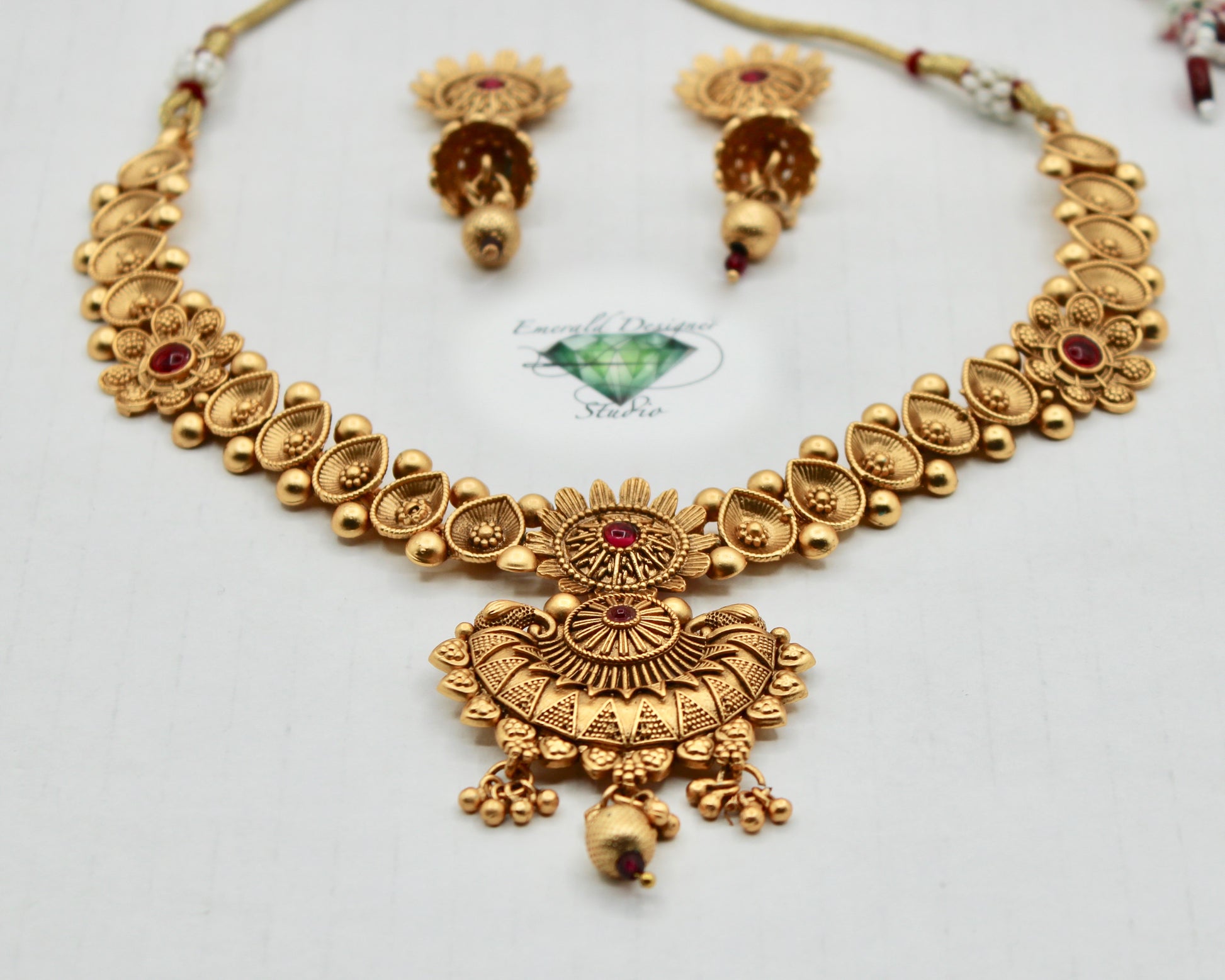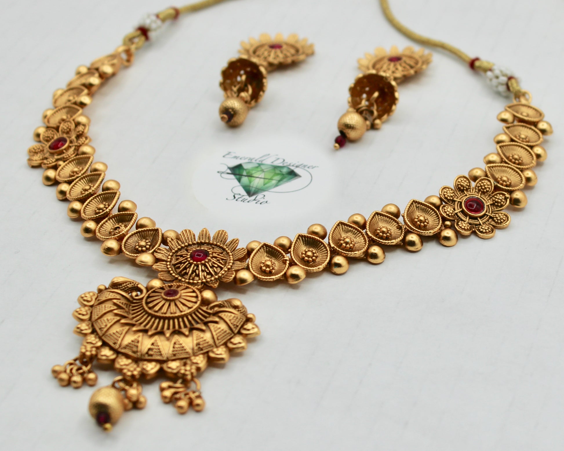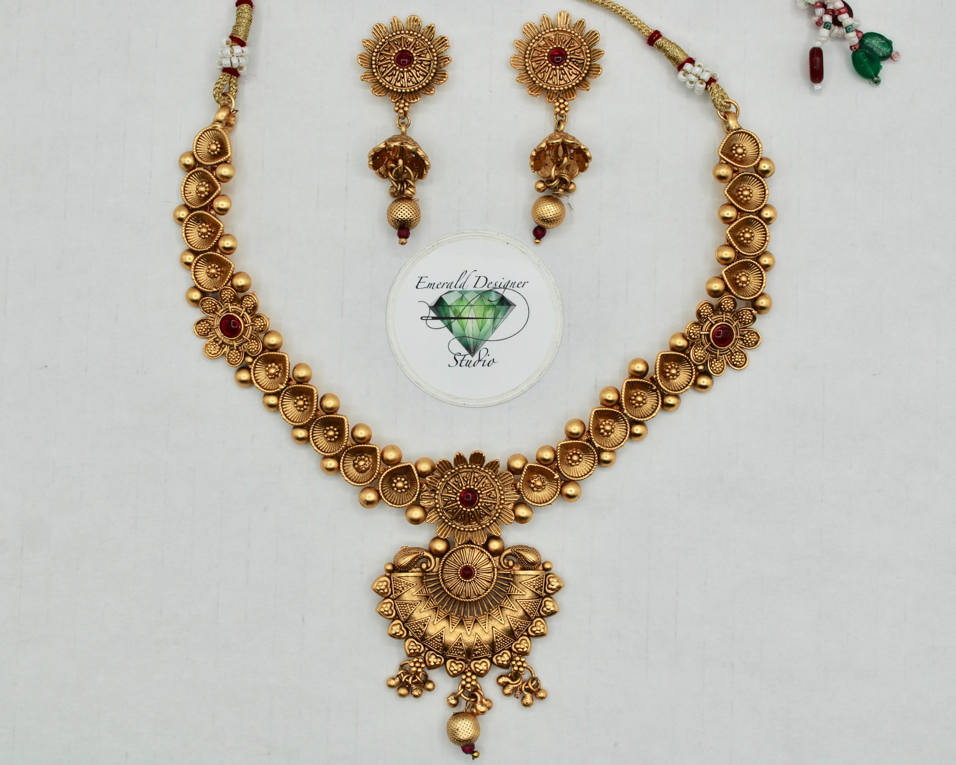 This copper gold-plated necklace set is crafted with close attention and is complete with pink crystal detailing.