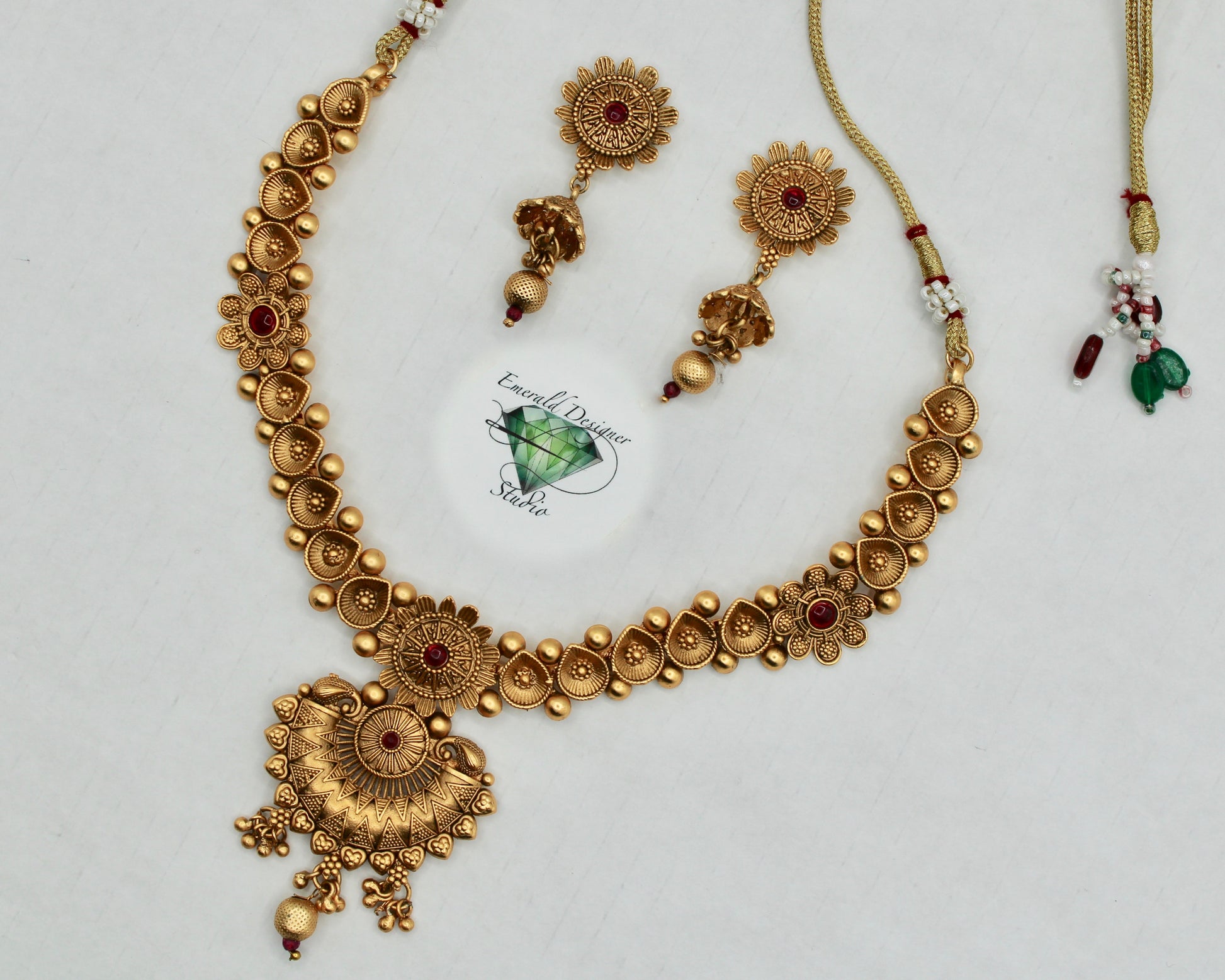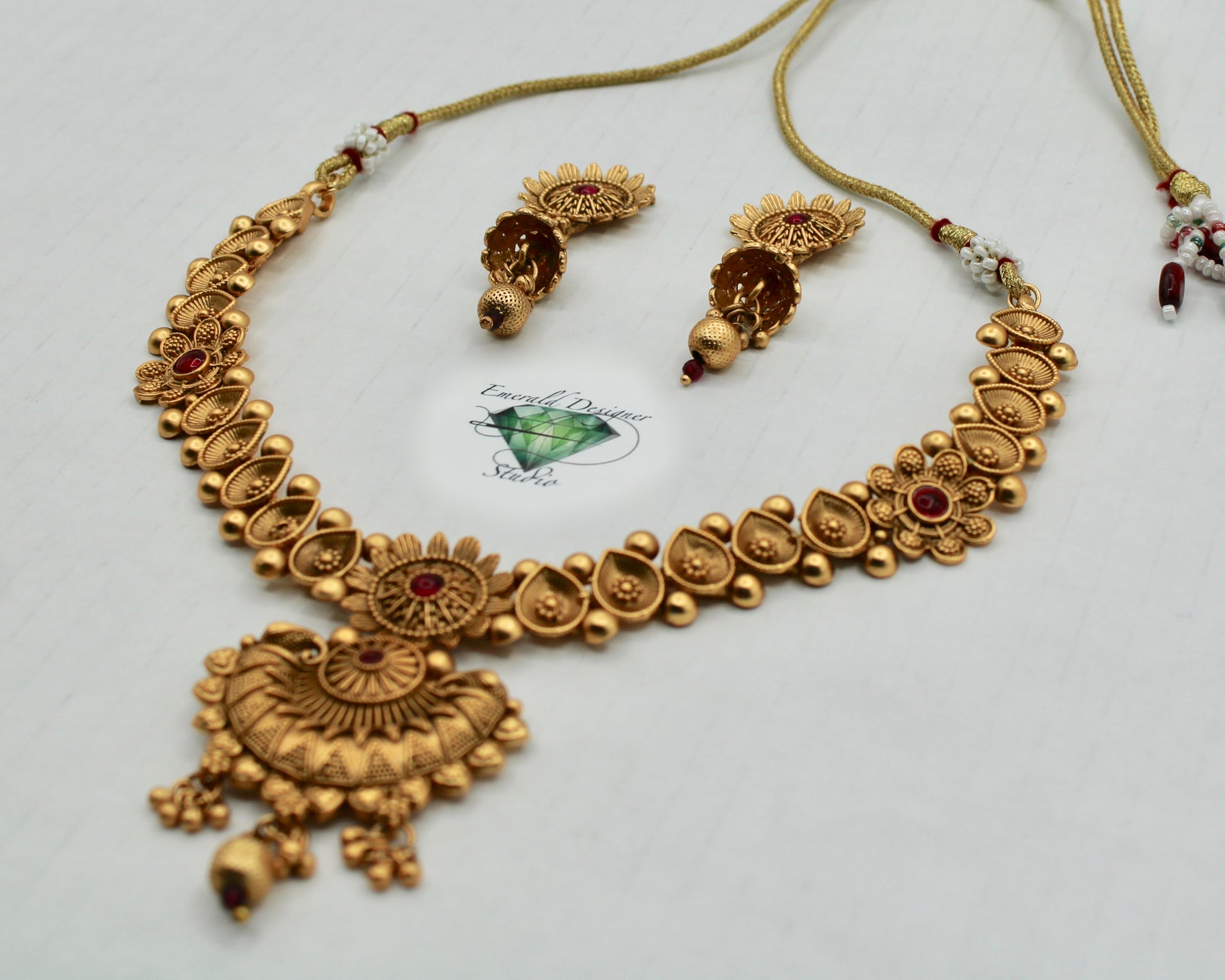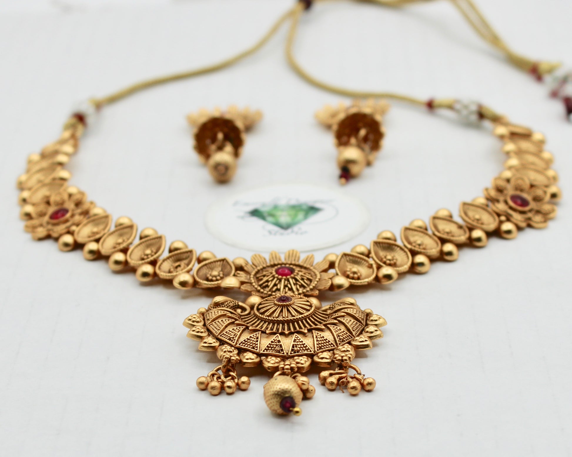 This copper gold-plated necklace set is crafted with close attention and is complete with pink crystal detailing.