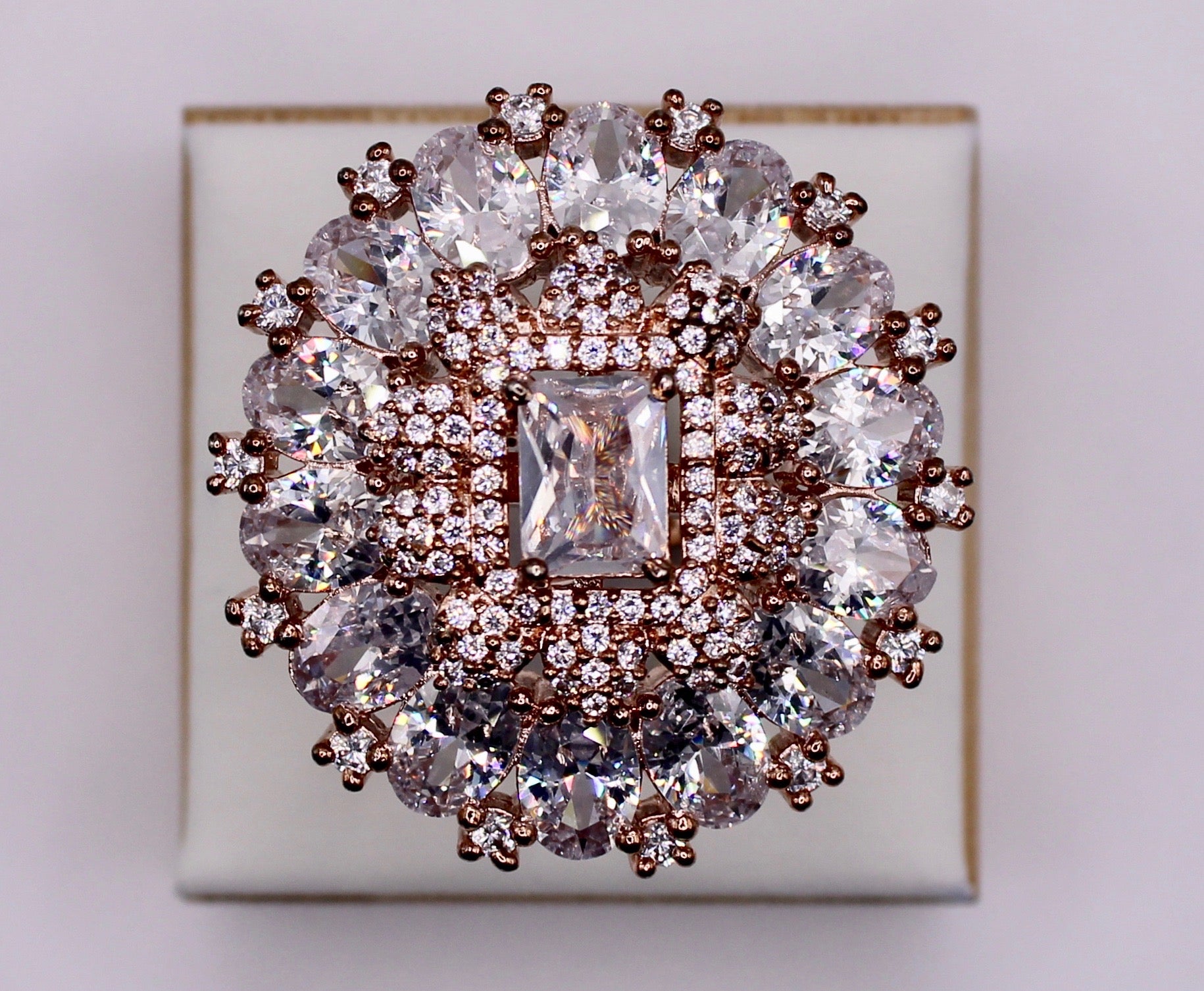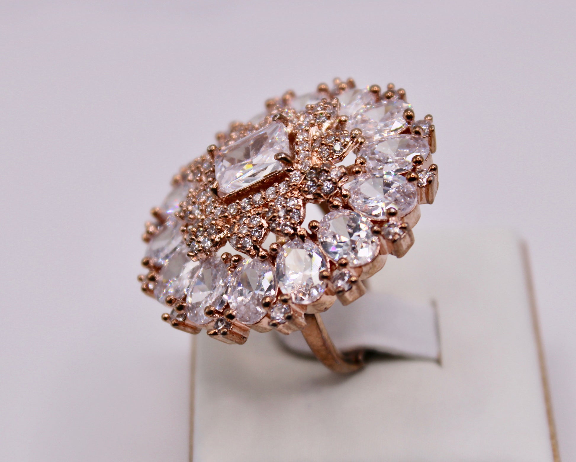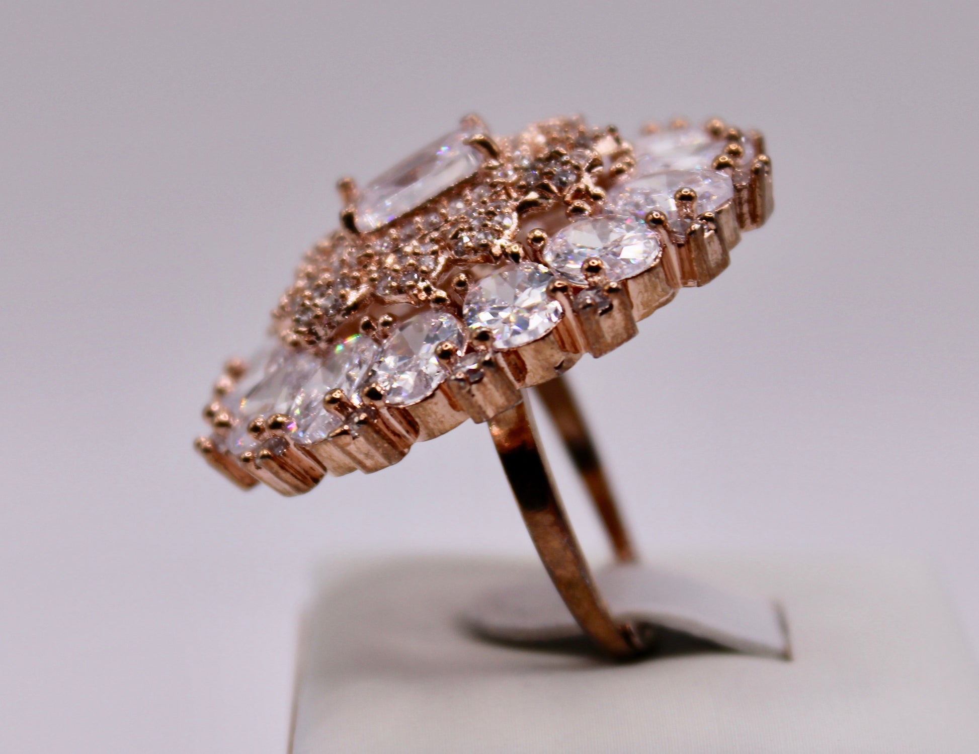 This stunning and sophisticated cocktail ring is entirely made with cubic zirconia. Made of brass to increase product lifetime.
