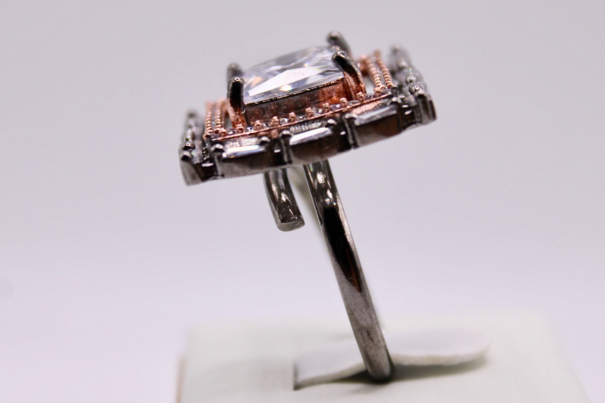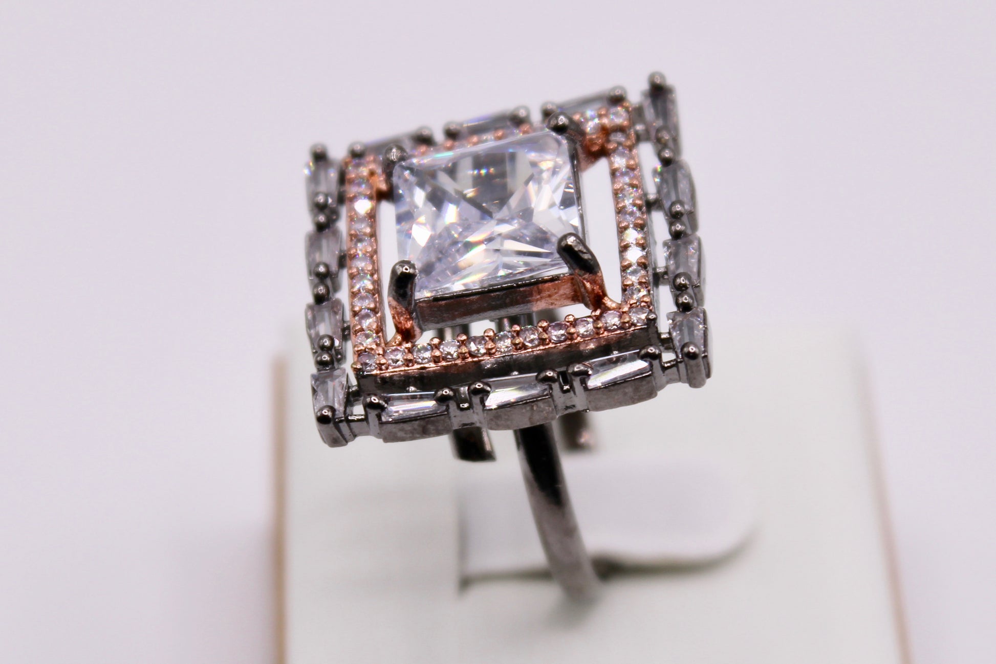 This intricate cocktail ring is complete with a princess-cut cubic zirconia, and is available in two variations.