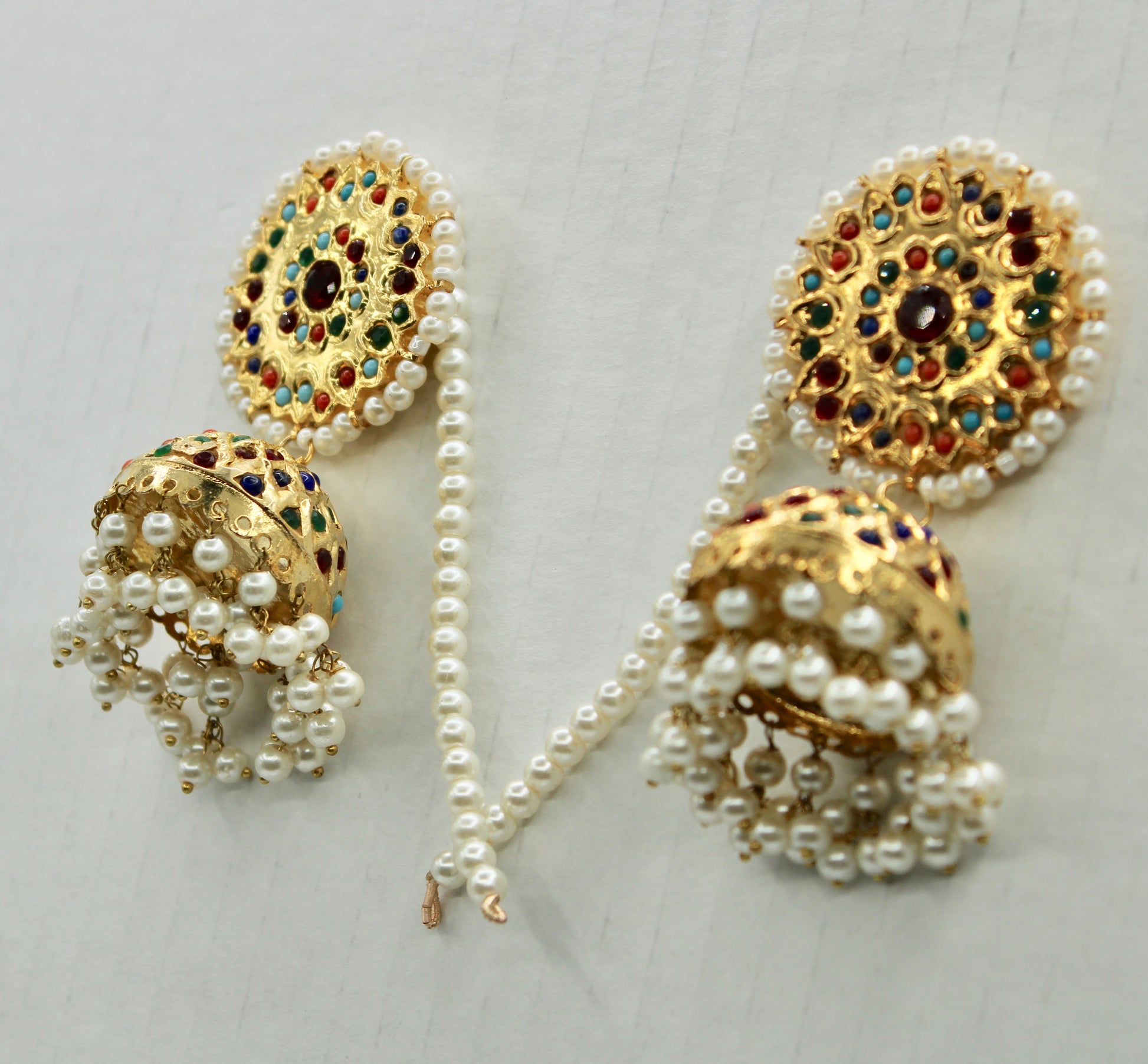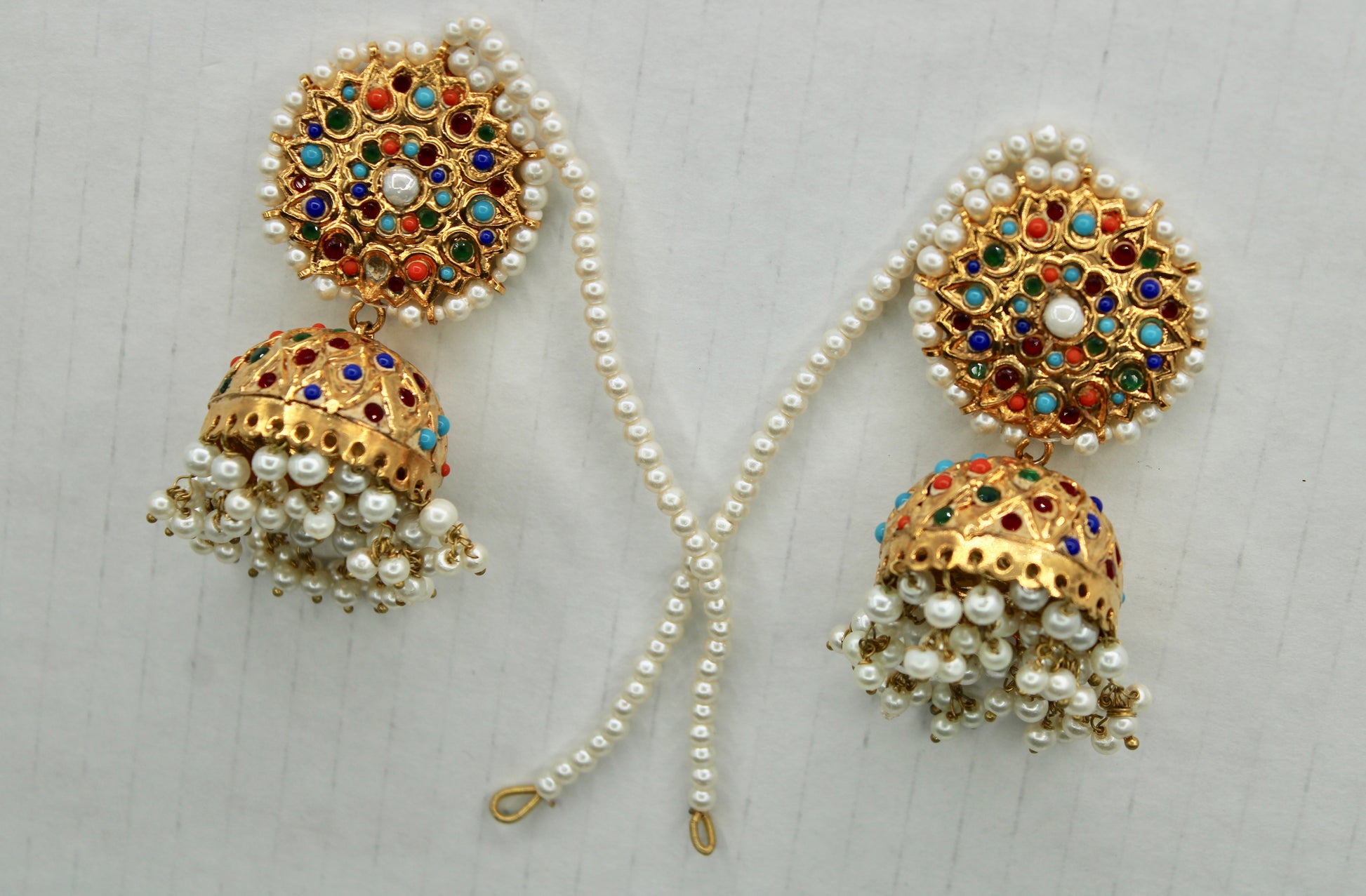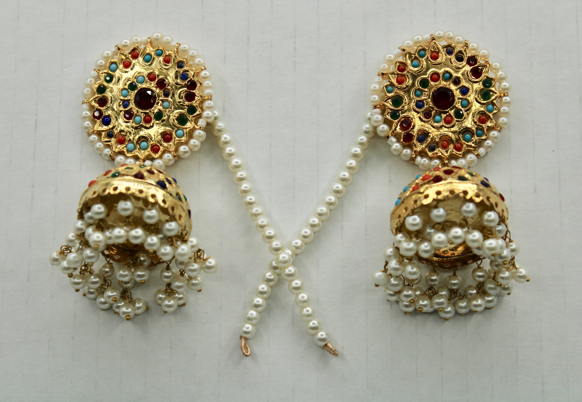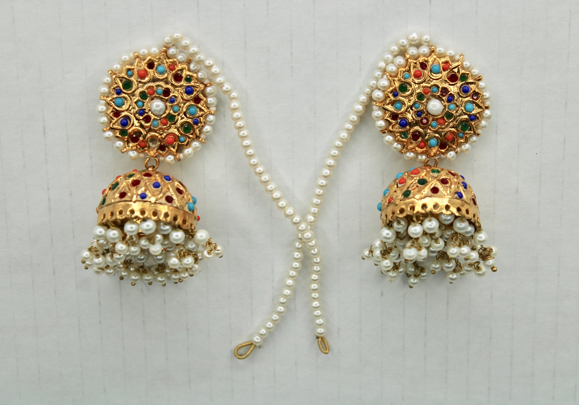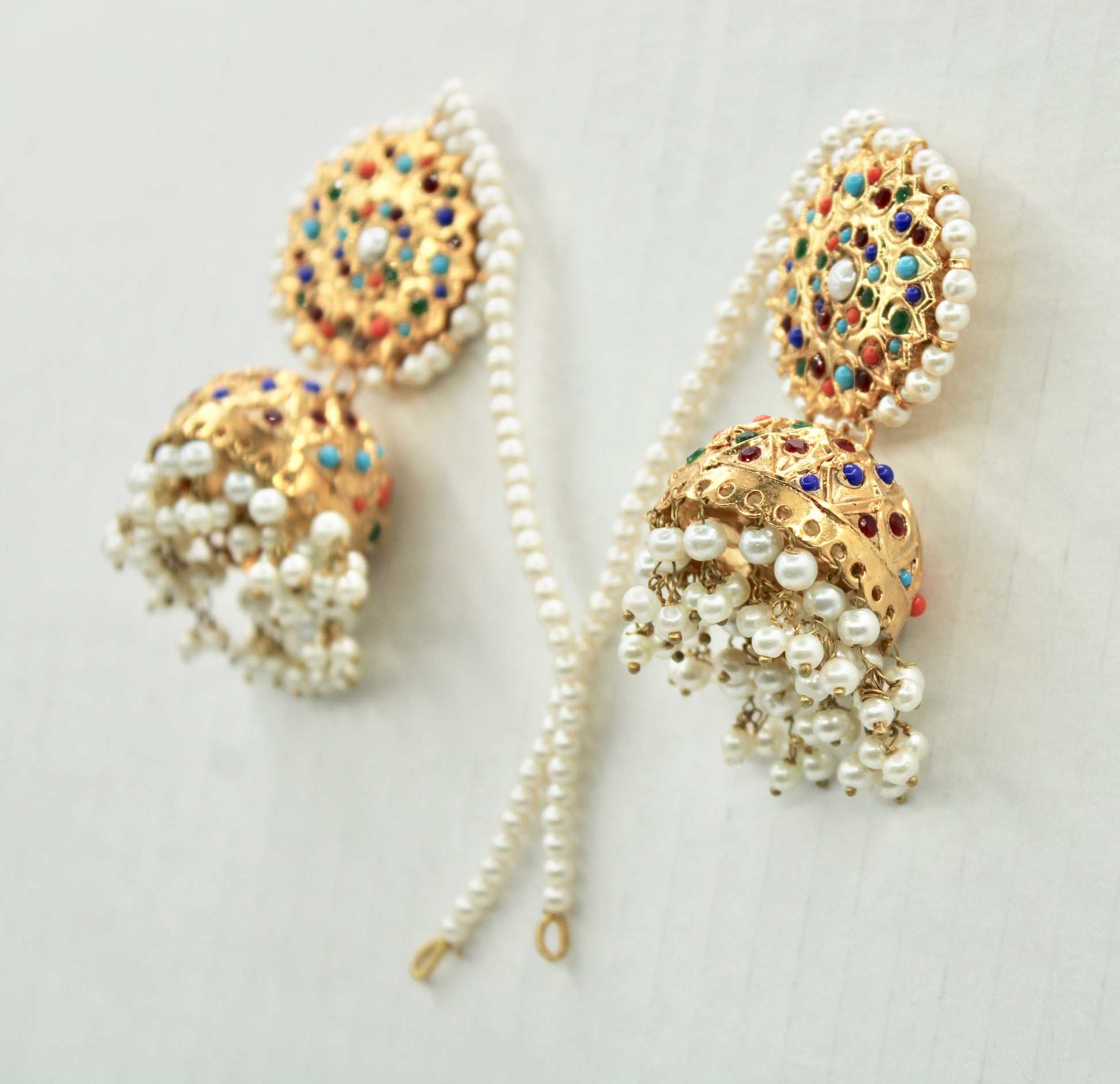 These Pakistani thappa kundan jhumkis are gold-plated and complete with semi-precious nauratan stones. These earrings are just the perfect size for any age or occasion!
