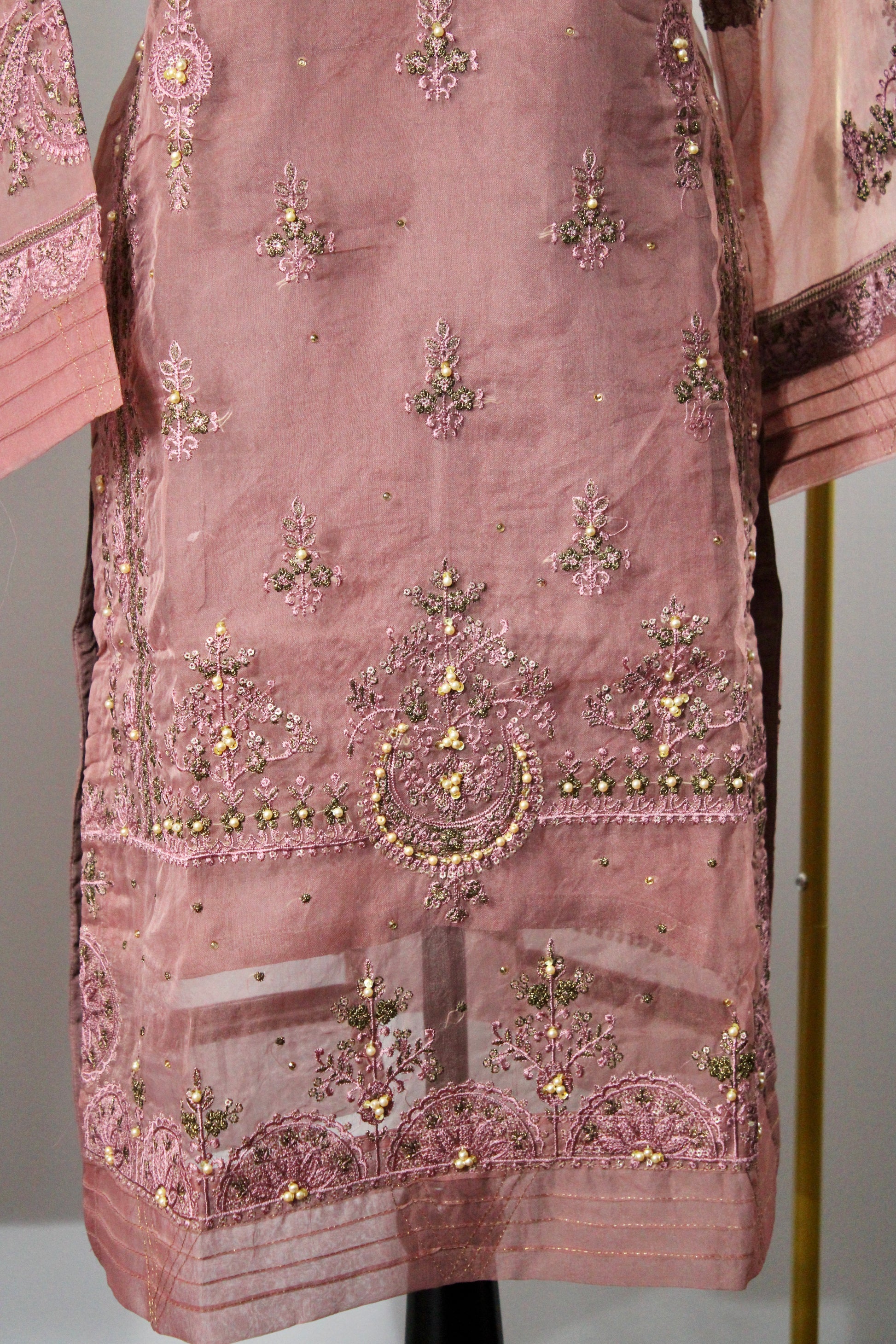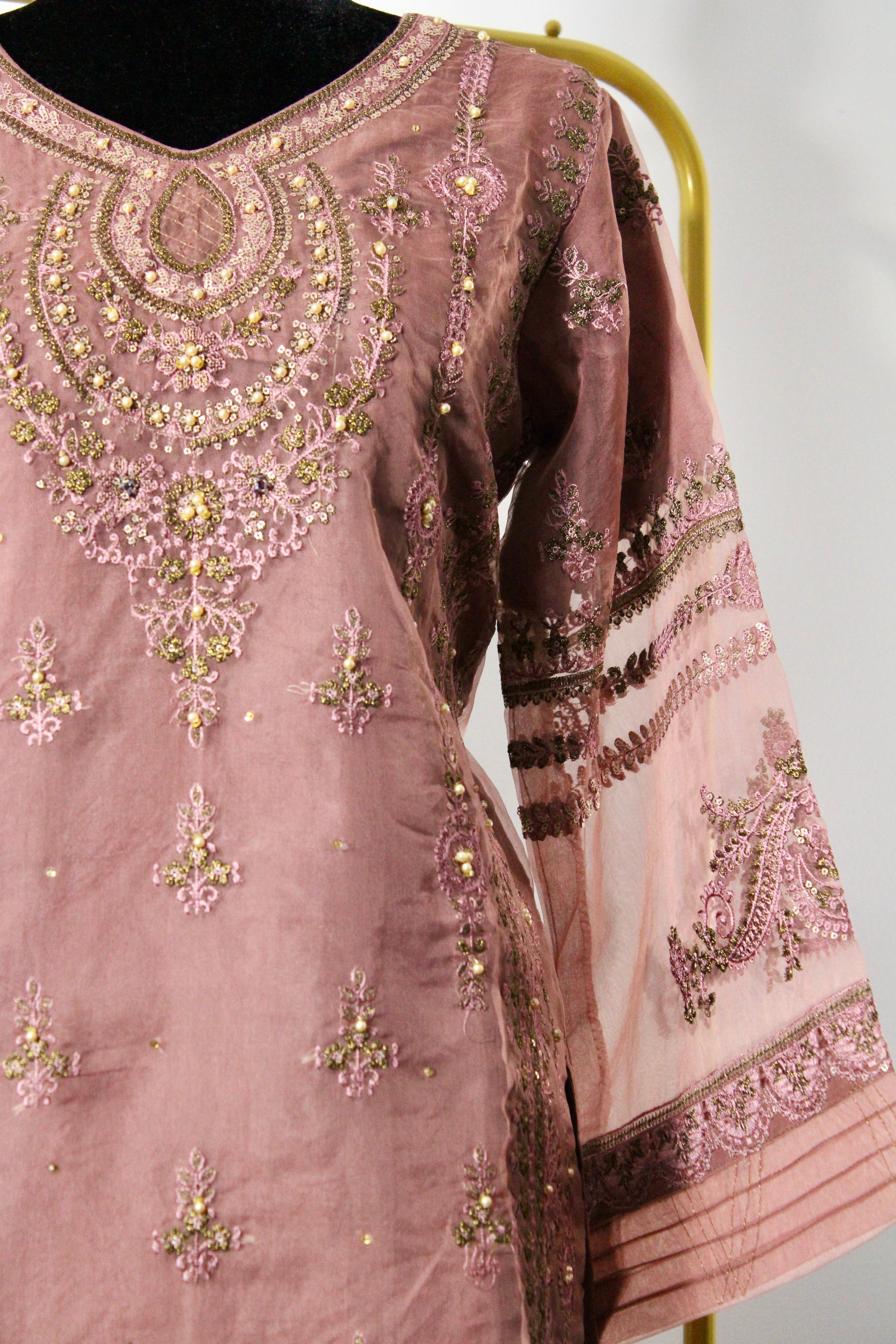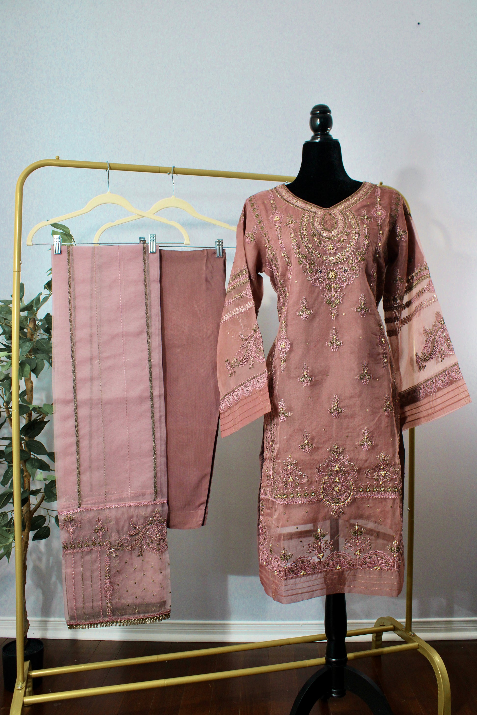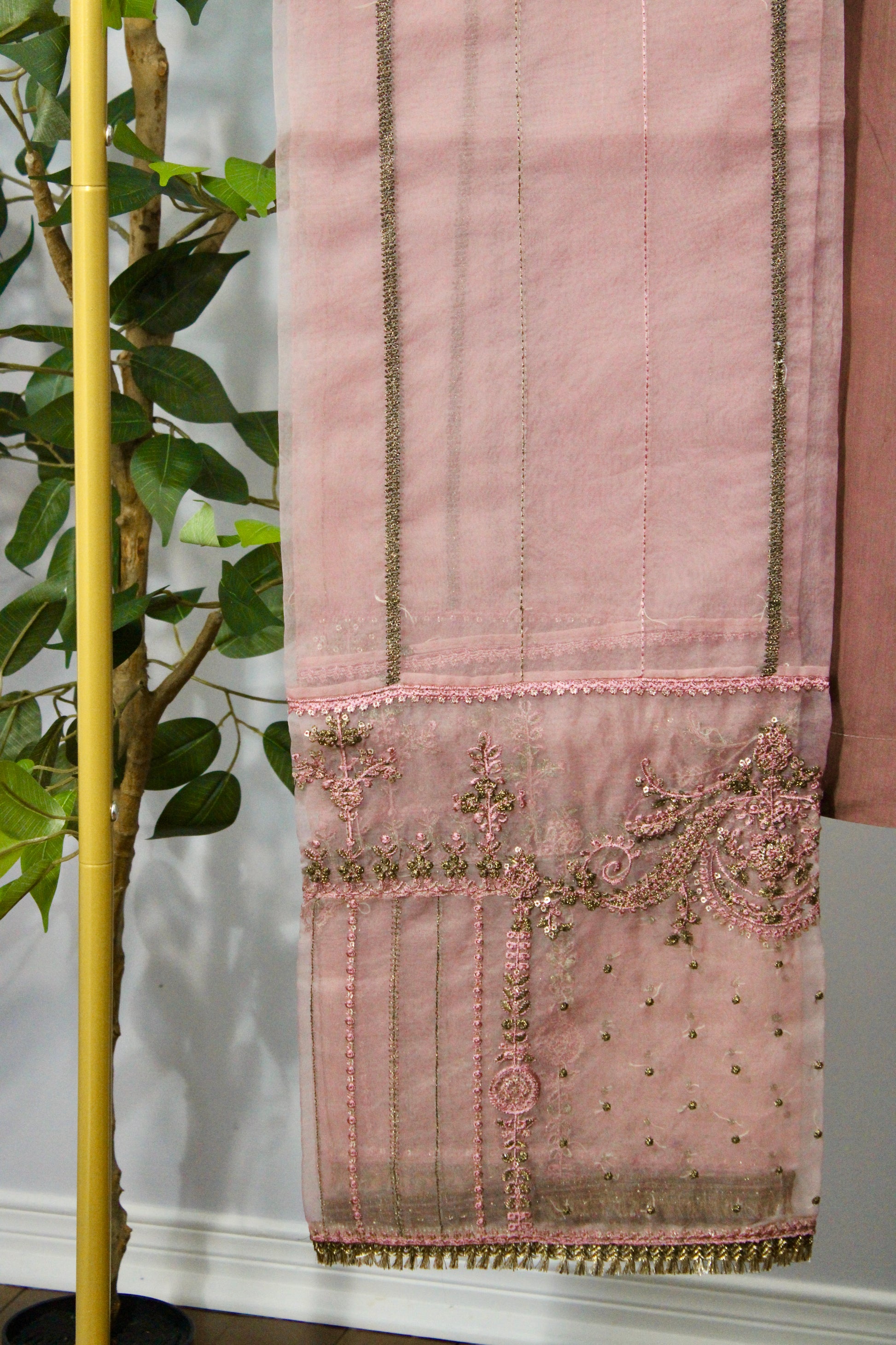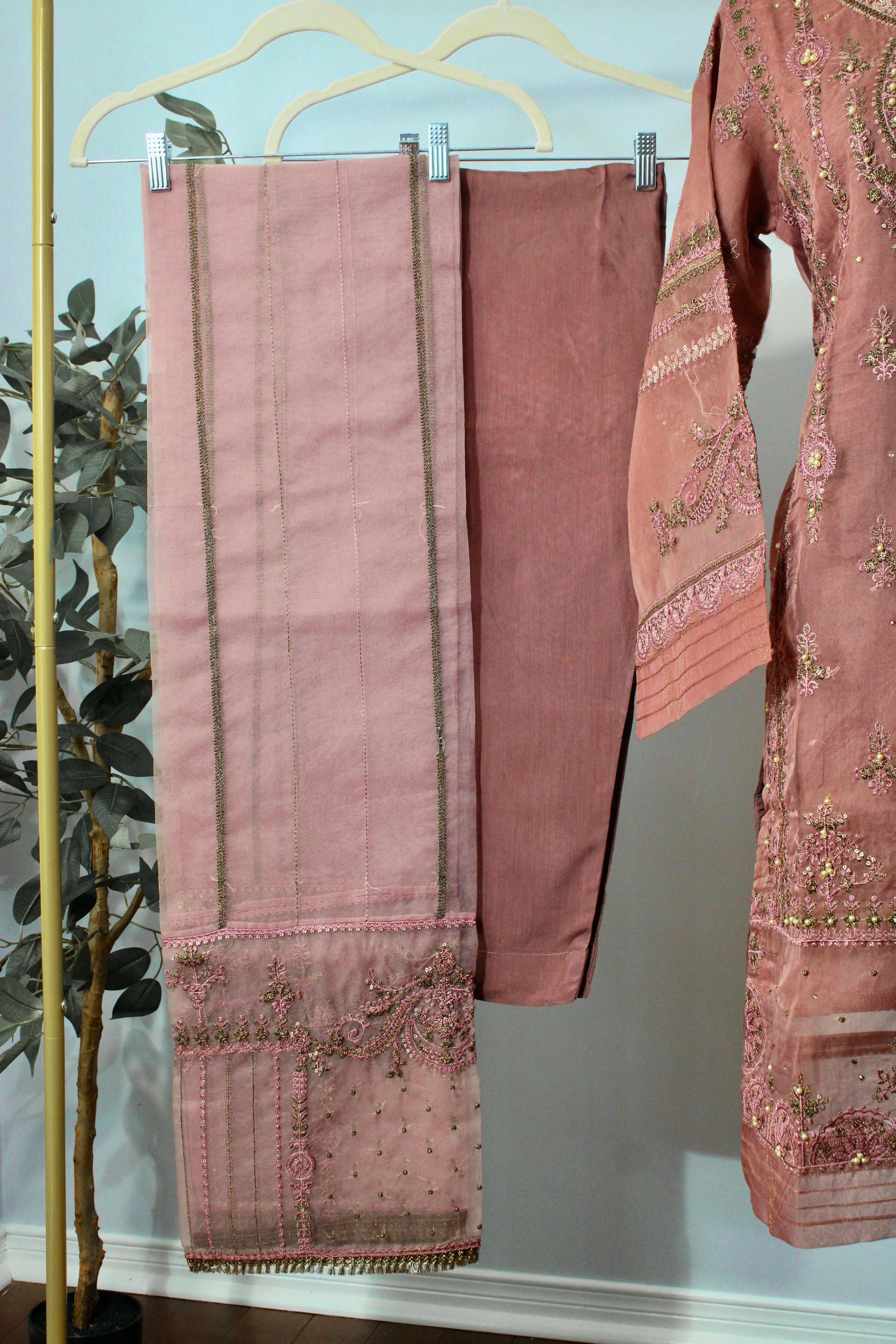 This suit is a beautiful dusty rose with gold thread work and hand embellishments, finished off with a tassel lace on the dupatta.