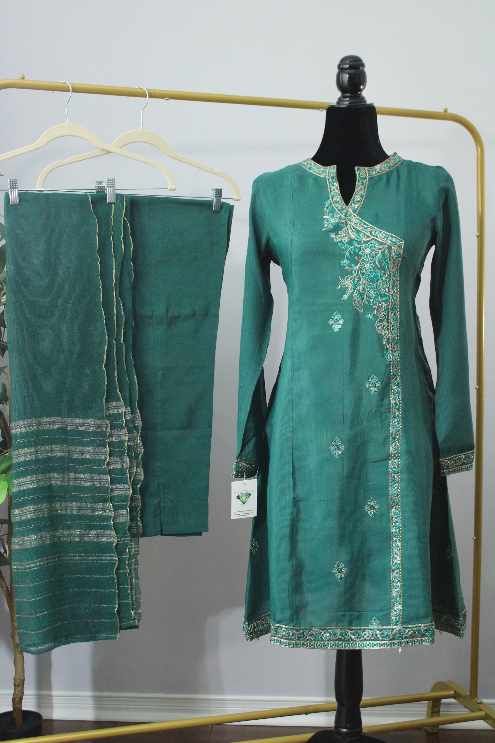 This stunning three-piece suit features a raw silk shirt and trouser, paired with a cotton net dupatta. Perfect for casual wear, this ensemble is already stitched and ready to wear. Elevate your style effortlessly.