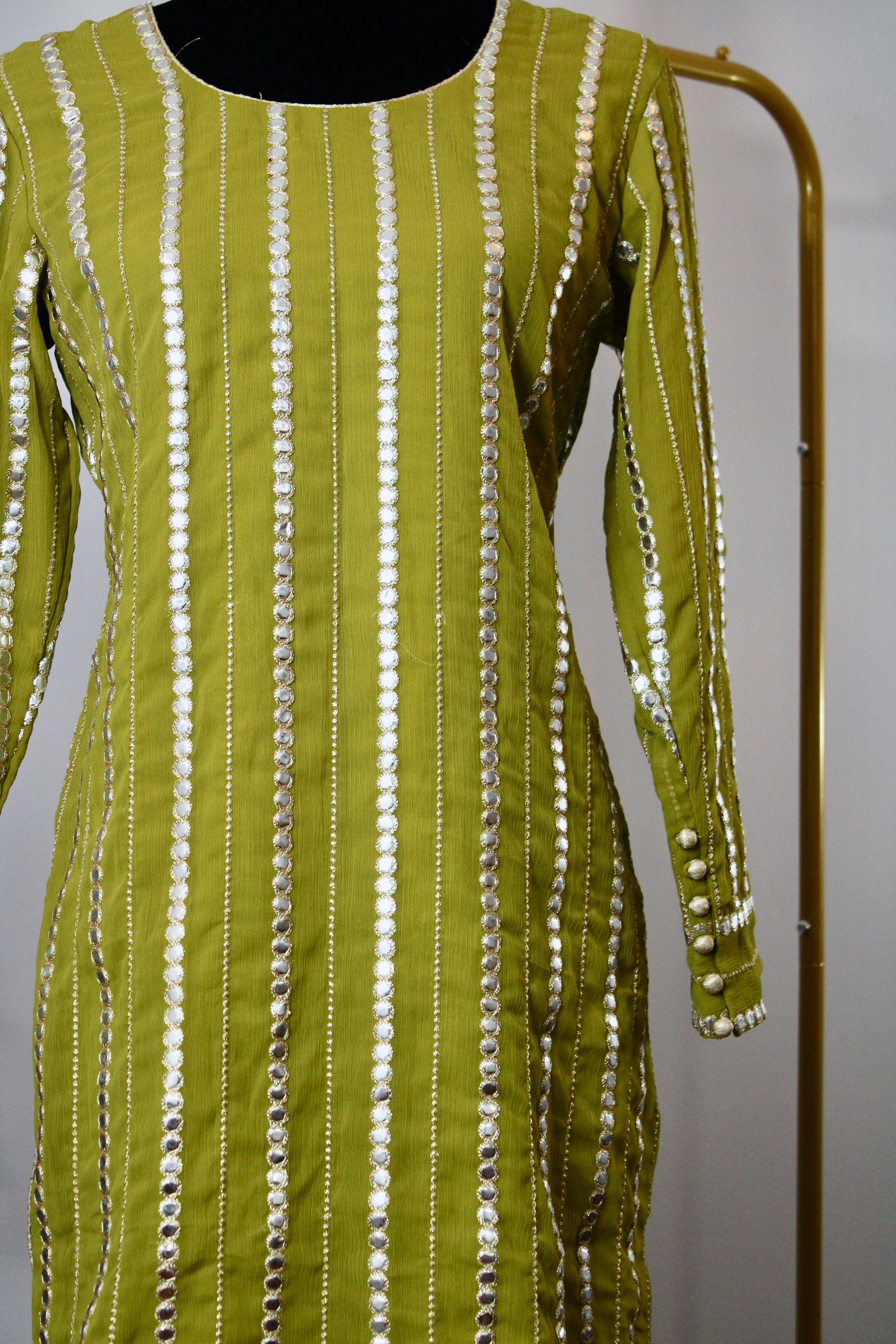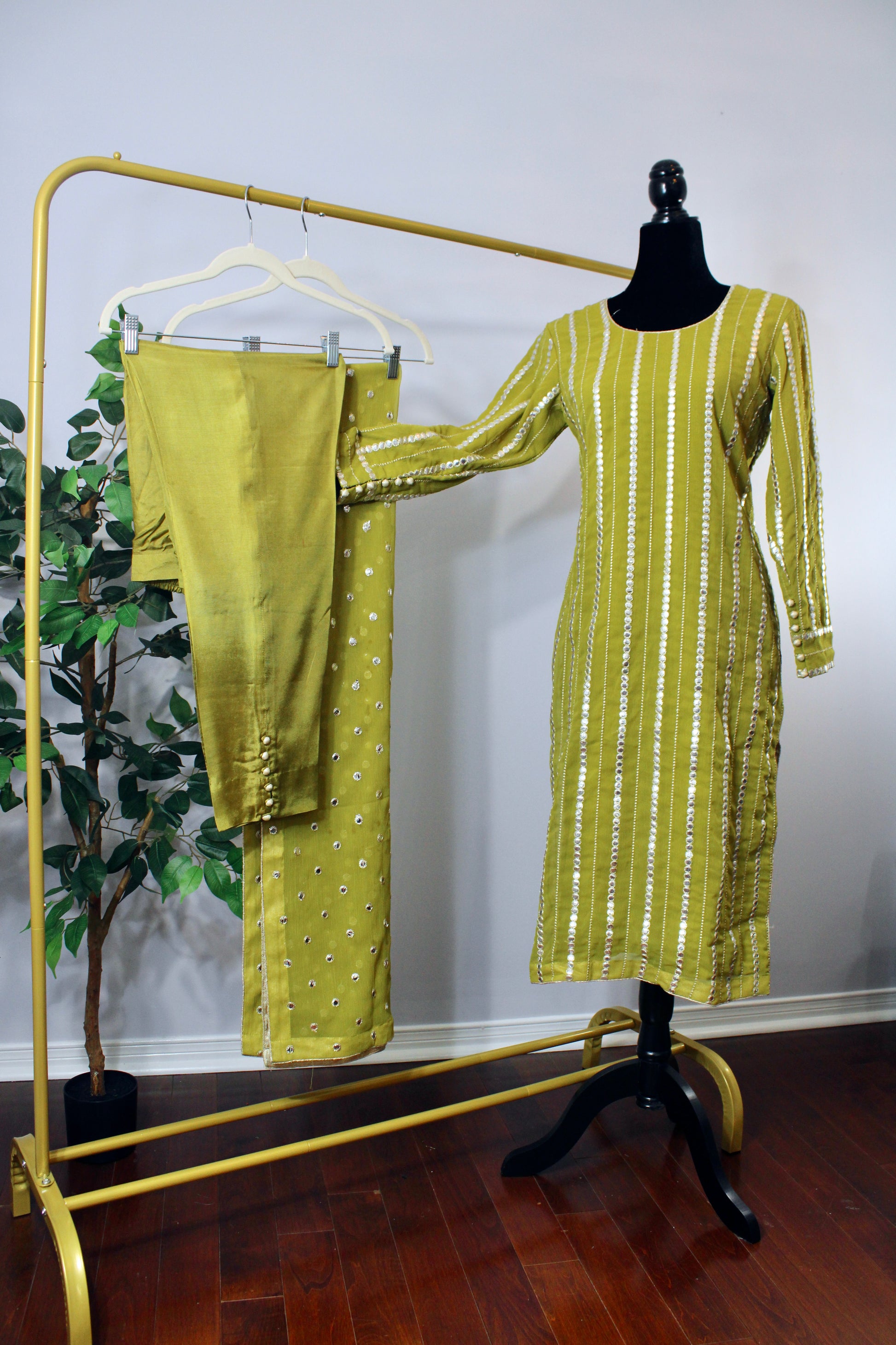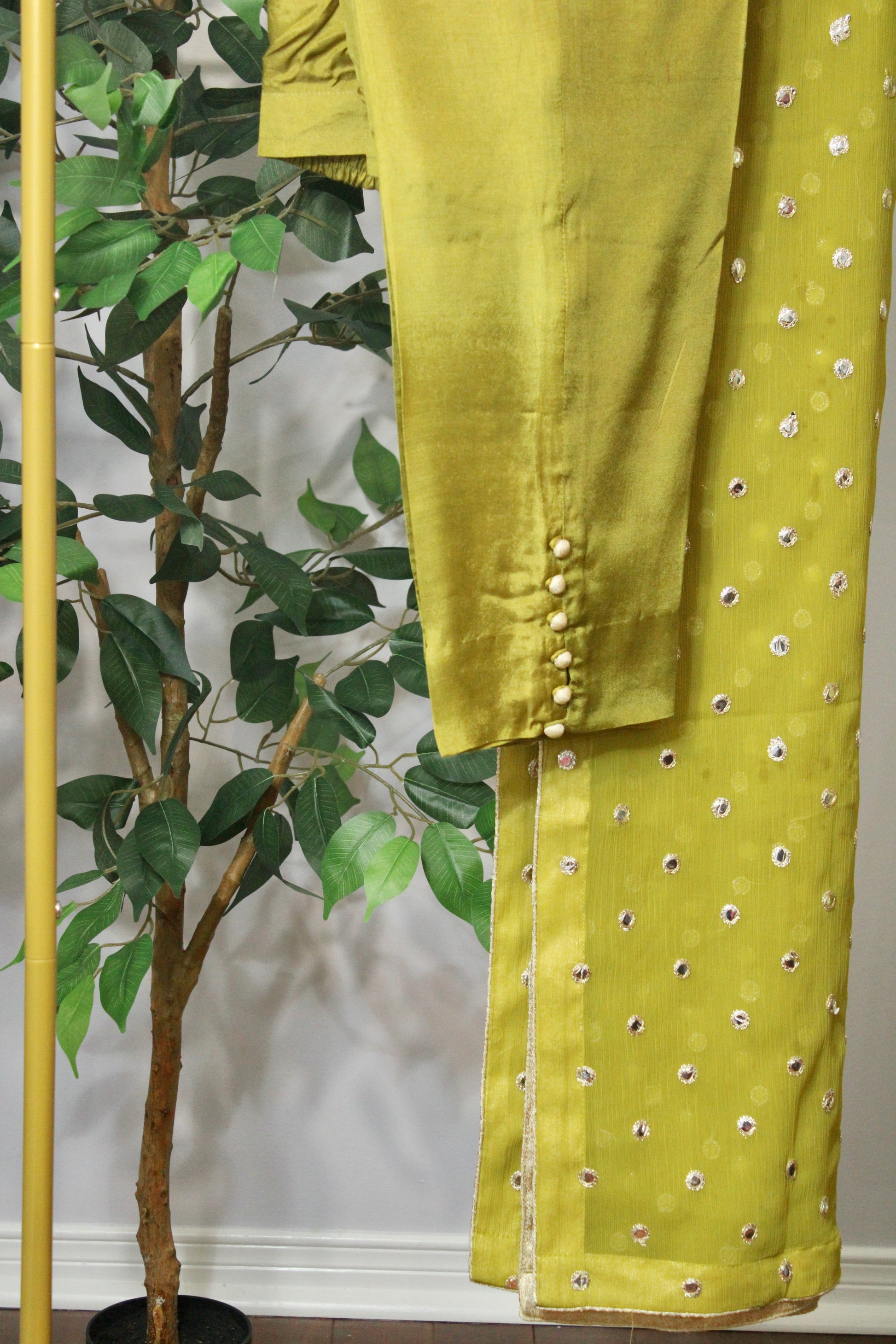 Elevate your style with this elegant ready-to-wear three-piece suit from the Emerald Originals collection. Designed for effortless sophistication, this ensemble features a luxurious foil-printed chiffon top and matching dupatta, exuding a subtle shimmer that's perfect for any occasion. Complementing the look are tailored cotton silk trousers, combining comfort and elegance for a refined touch. Perfect for festive celebrations, formal gatherings, or adding a hint of glam to your everyday wardrobe, this suit beautifully blends tradition with modern style. Experience timeless beauty with Emerald Originals