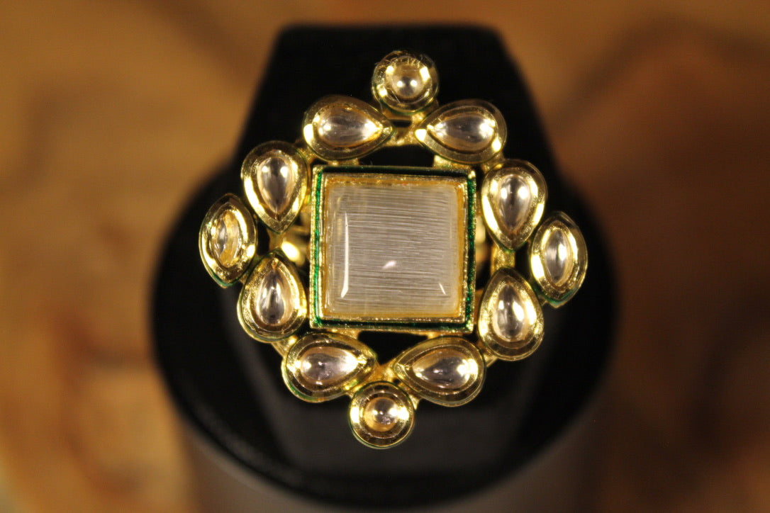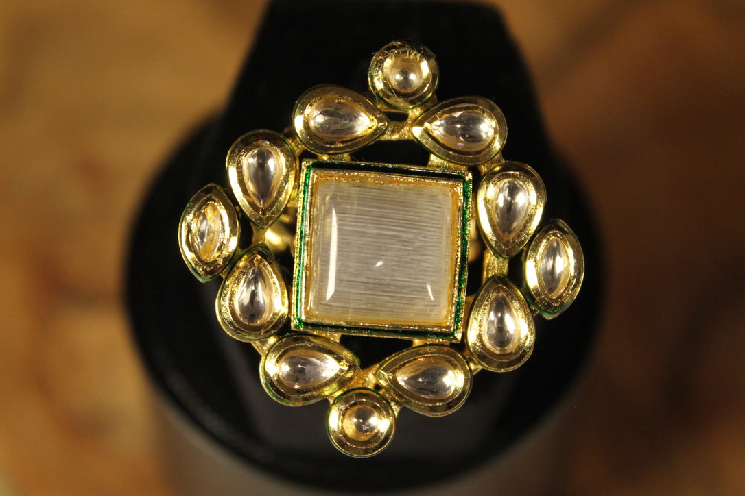This graceful hand-made kundan cocktail ring is an amazing collection piece for kundan lovers. Adjustable, made of brass to increase product lifetime.