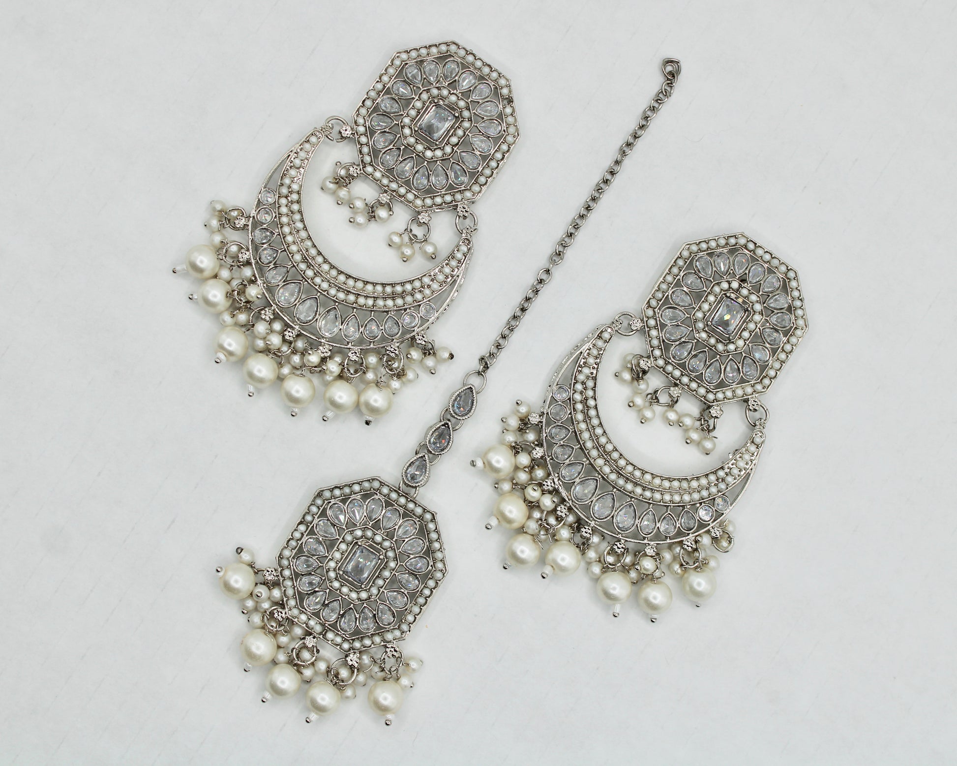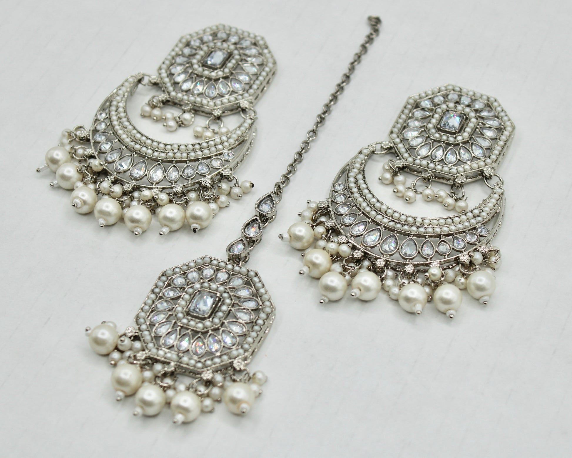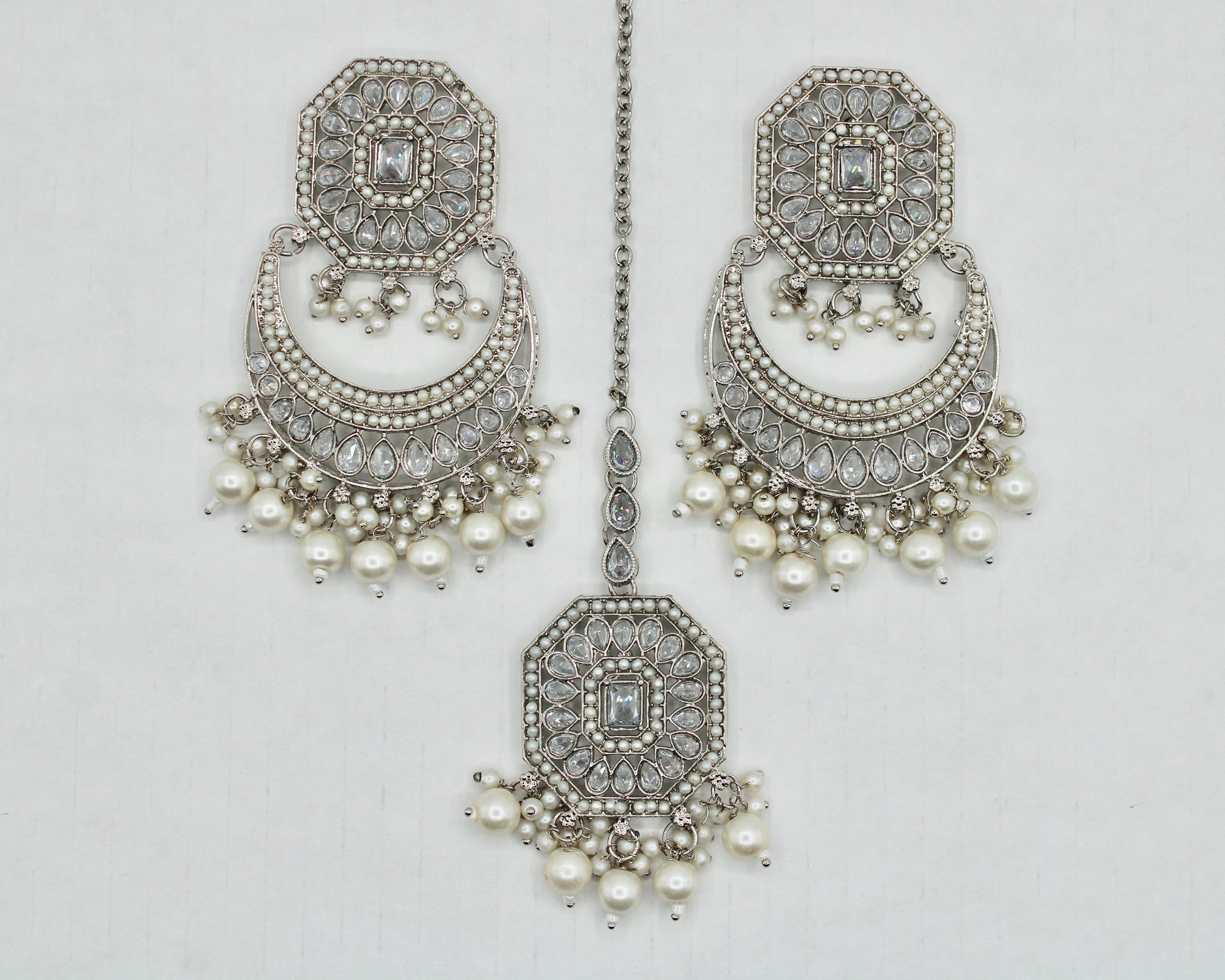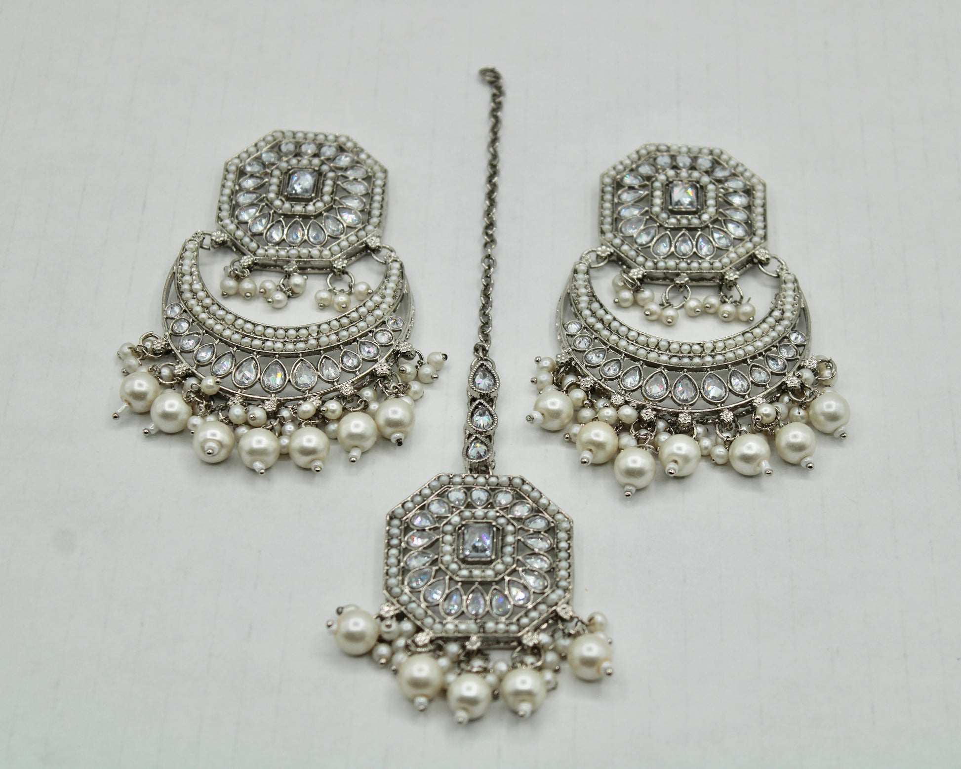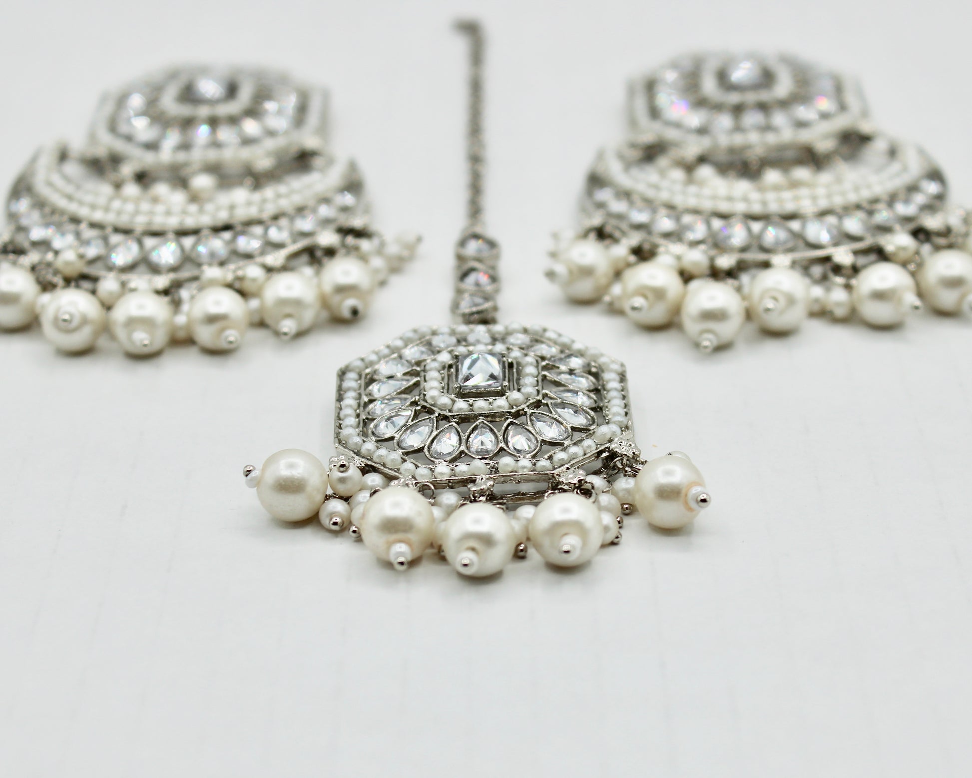 This stunning teeka set is the perfect combination between silver and pearls, complete with cubic zirconia and kundan detailing.