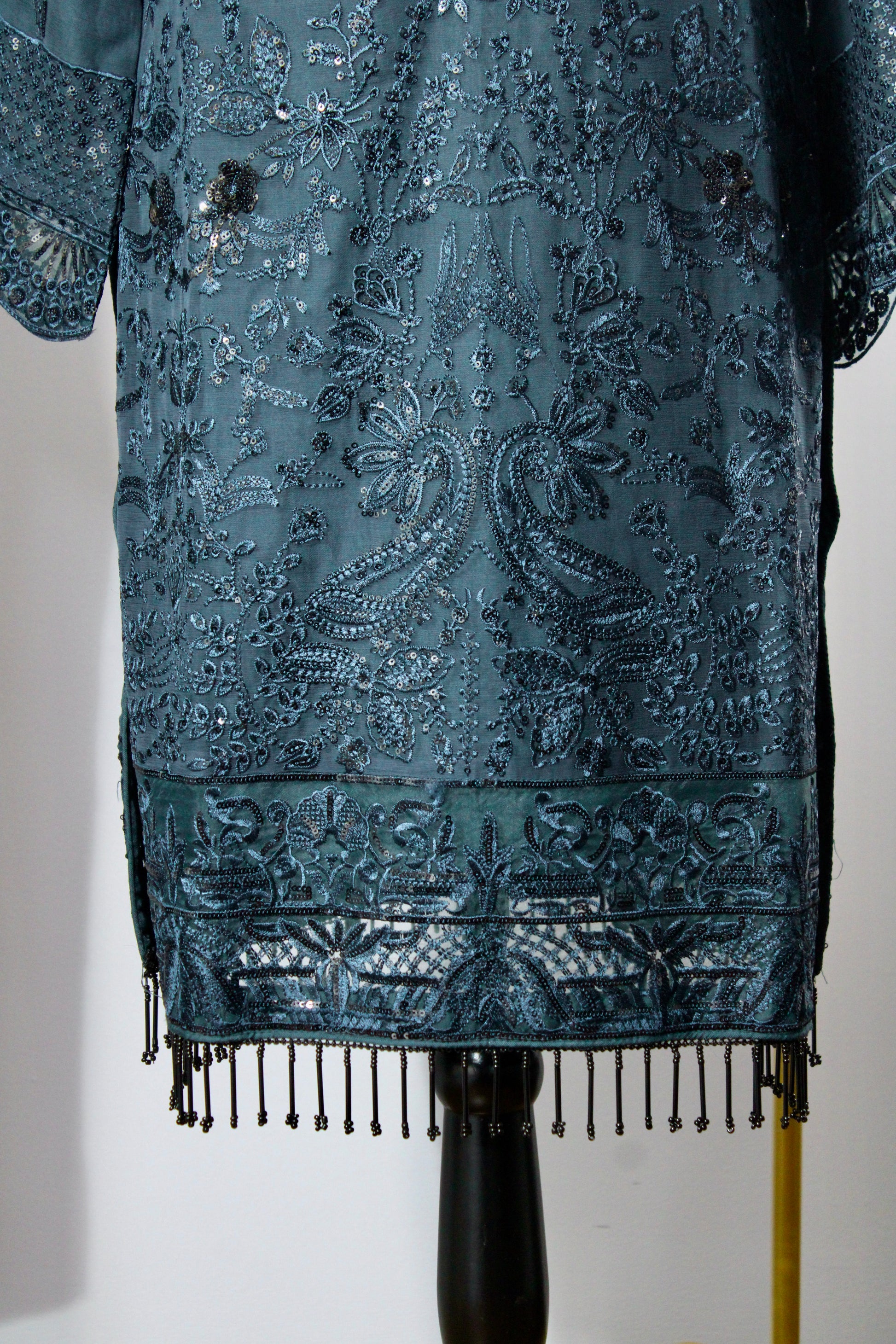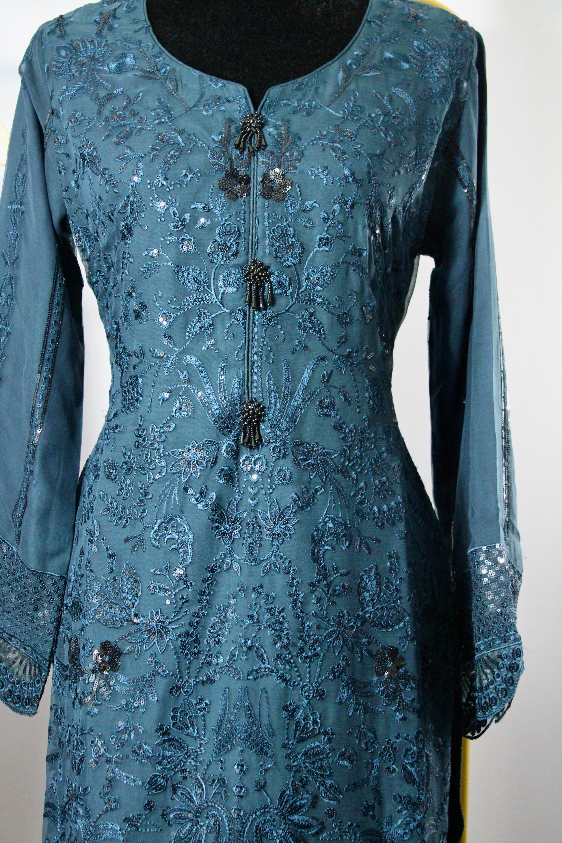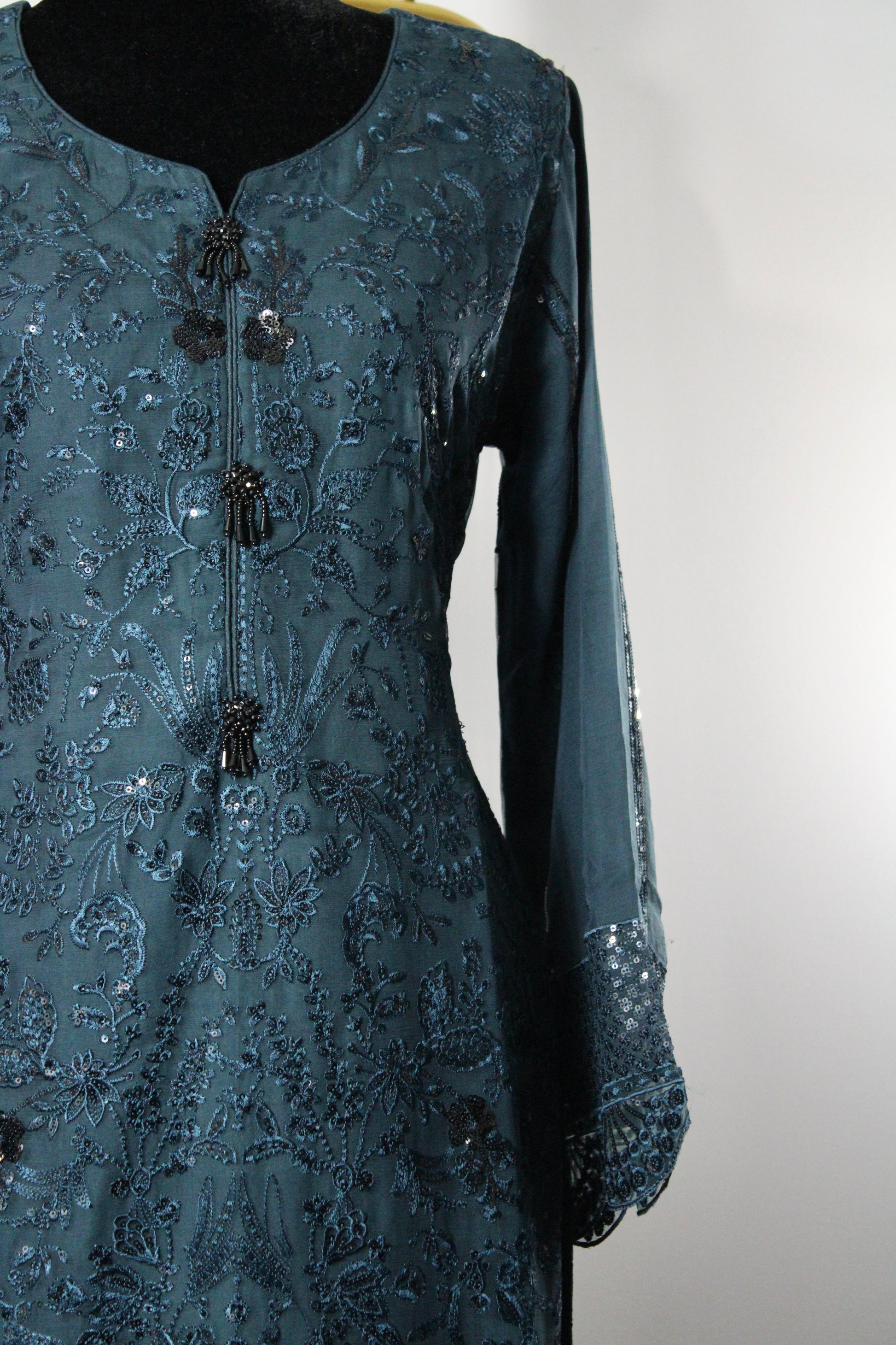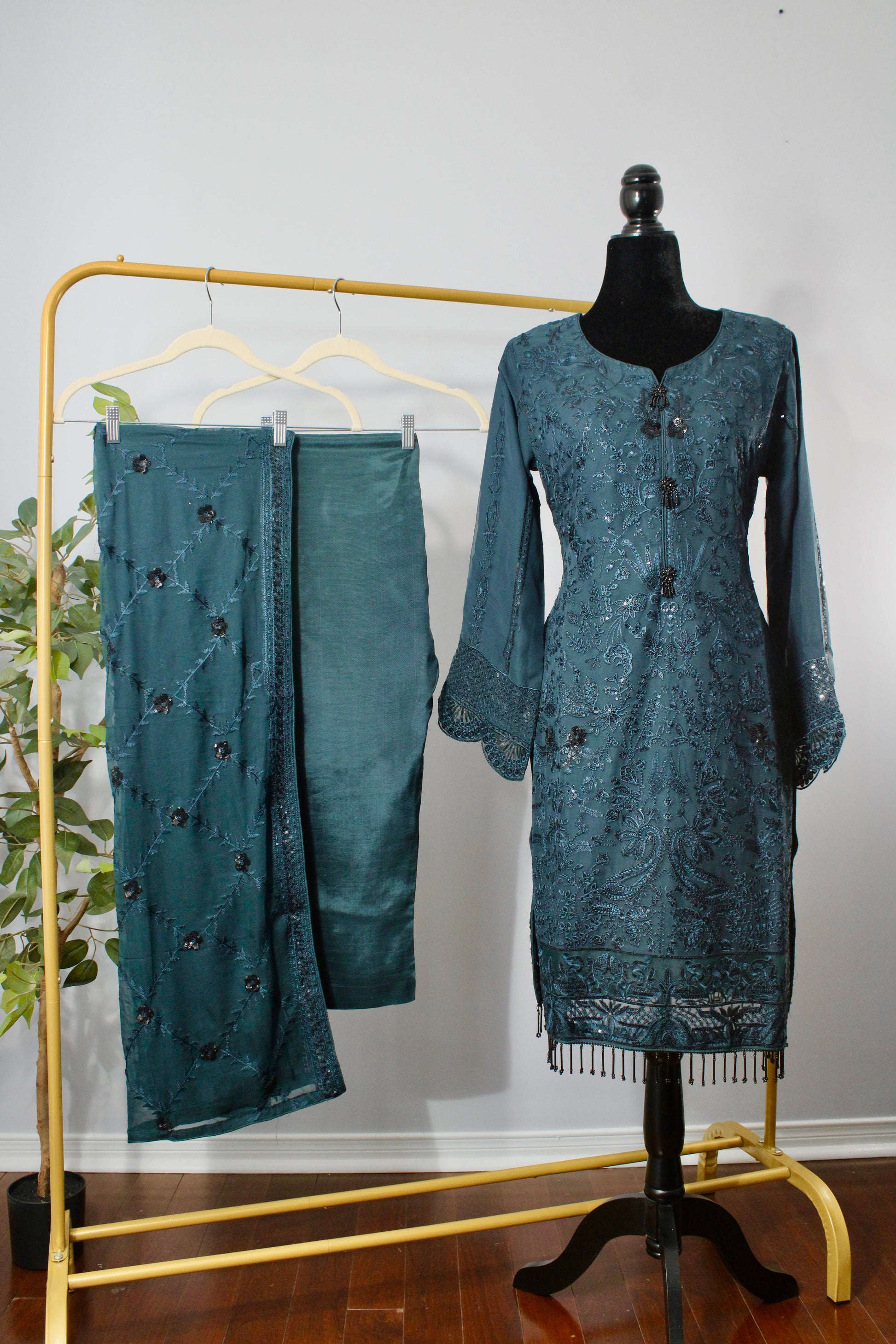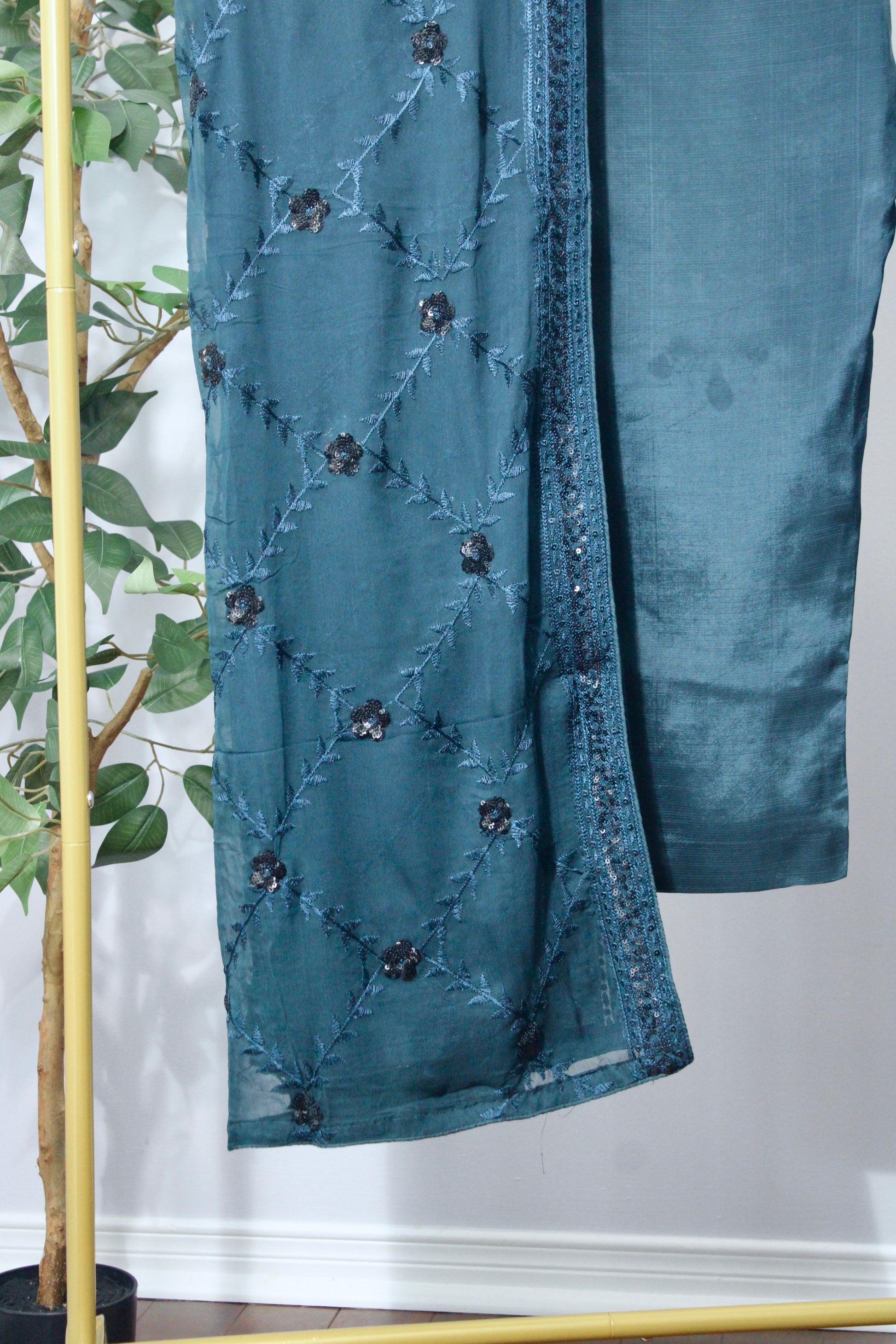 This dazzling deep teal suit features a bamber chiffon fully embroidered shirt and dupatta, with delicate raw silk trousers. 3 piece suit, stitched and ready to wear.