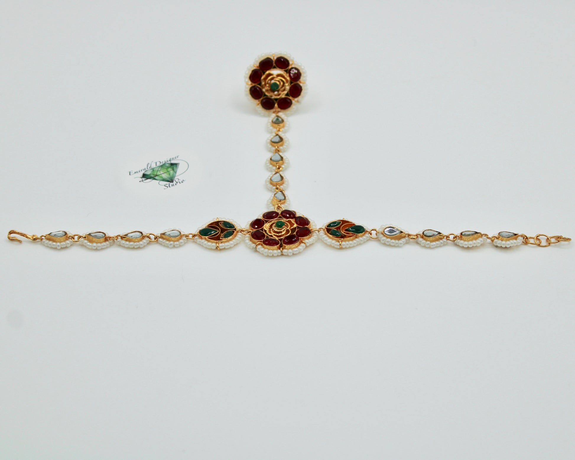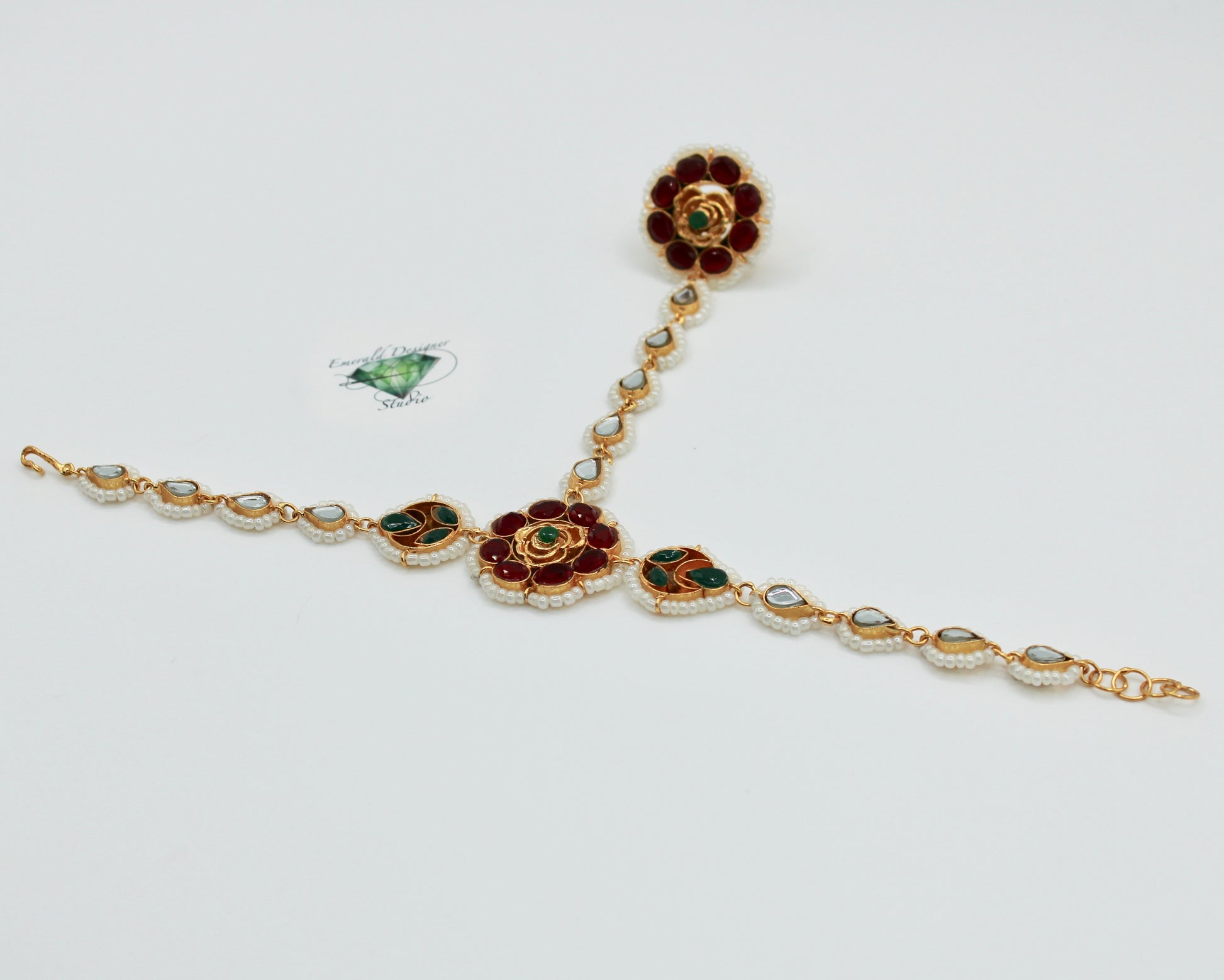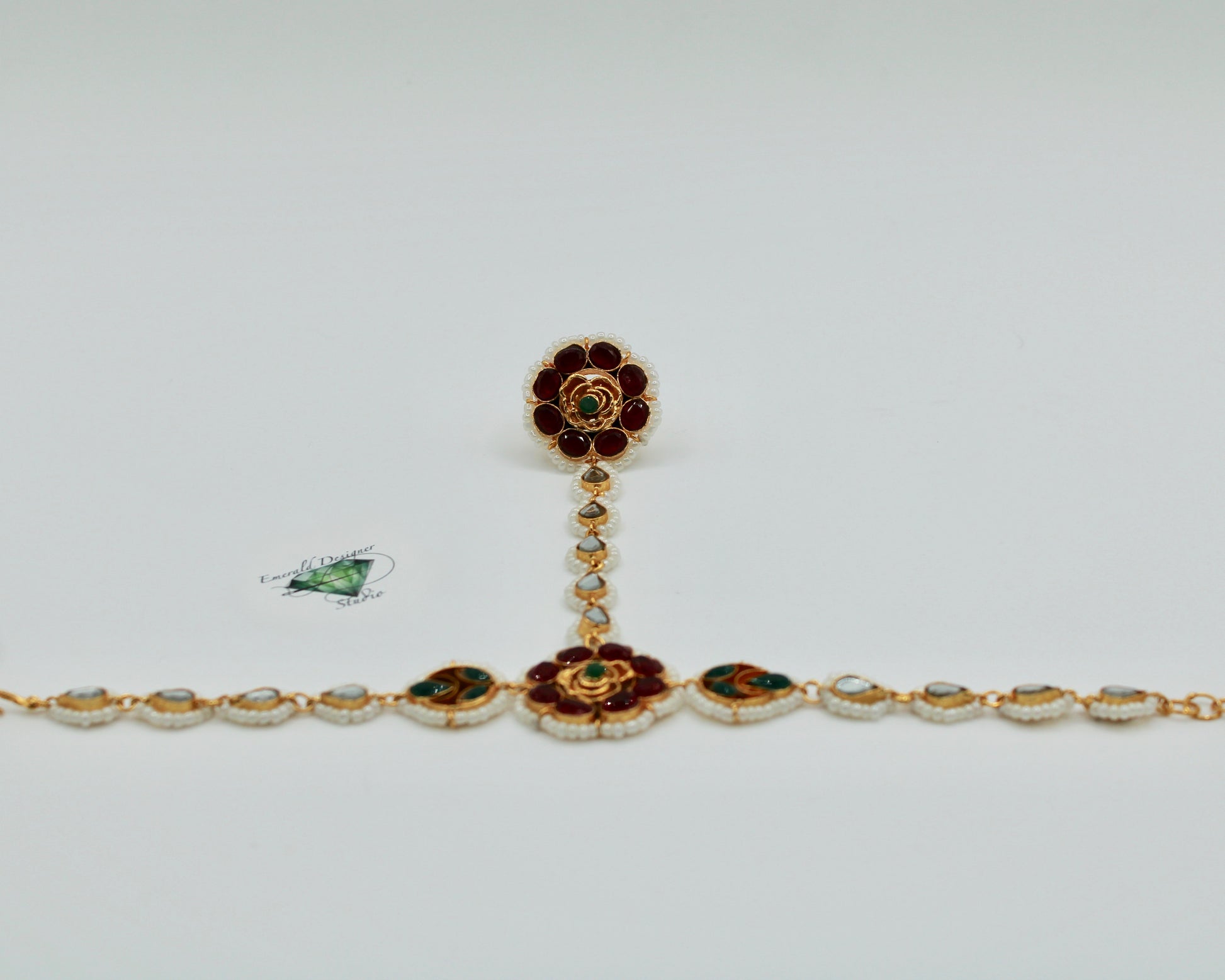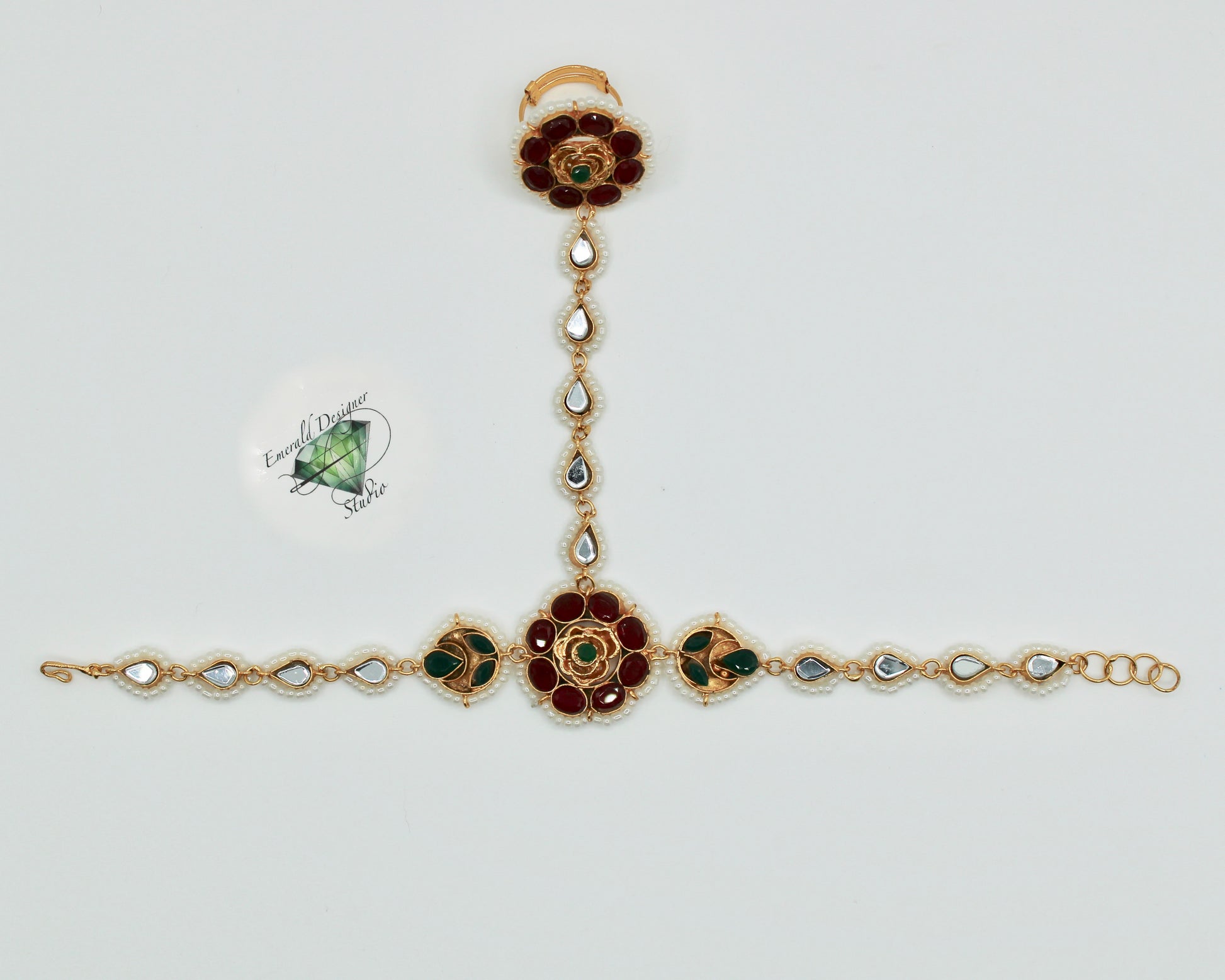 This beautiful vintage-styled sheesha kundan bracelet is complete with an attached ring. The entire piece is detailed with faux ruby and emerald stones, and the ring is adjustable.