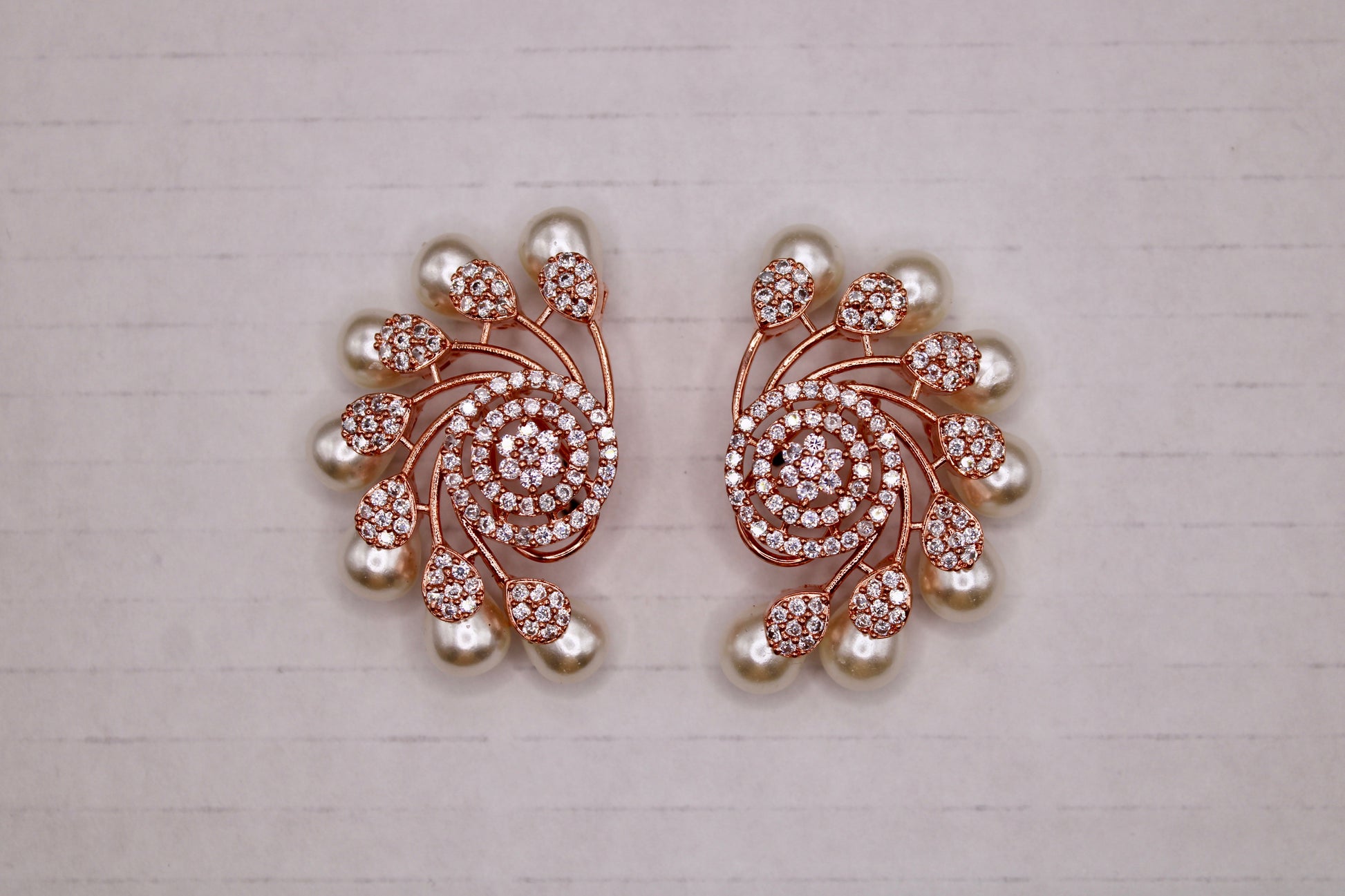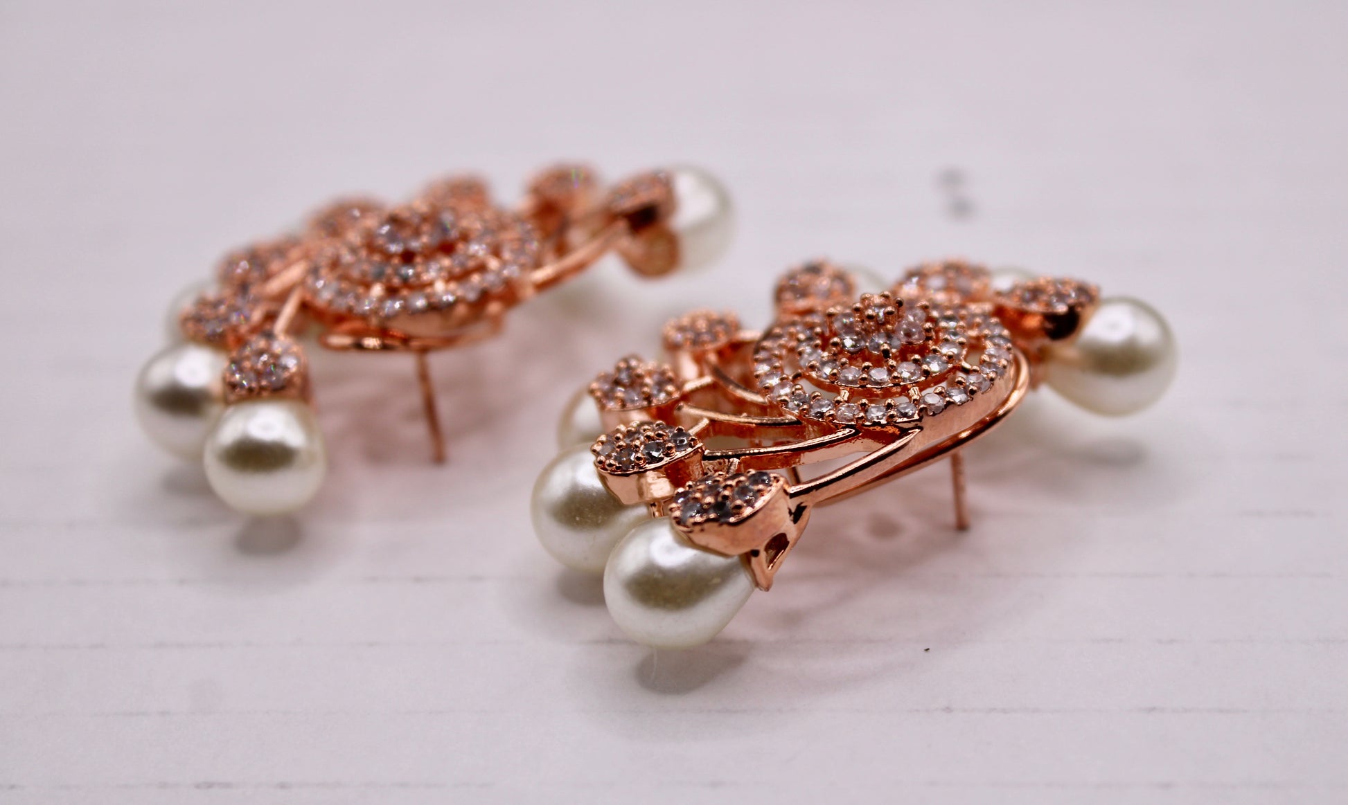 These stunning cubic zirconia studs are stylish jadao earrings with pearls in rose gold and are for classic jewellery lovers.