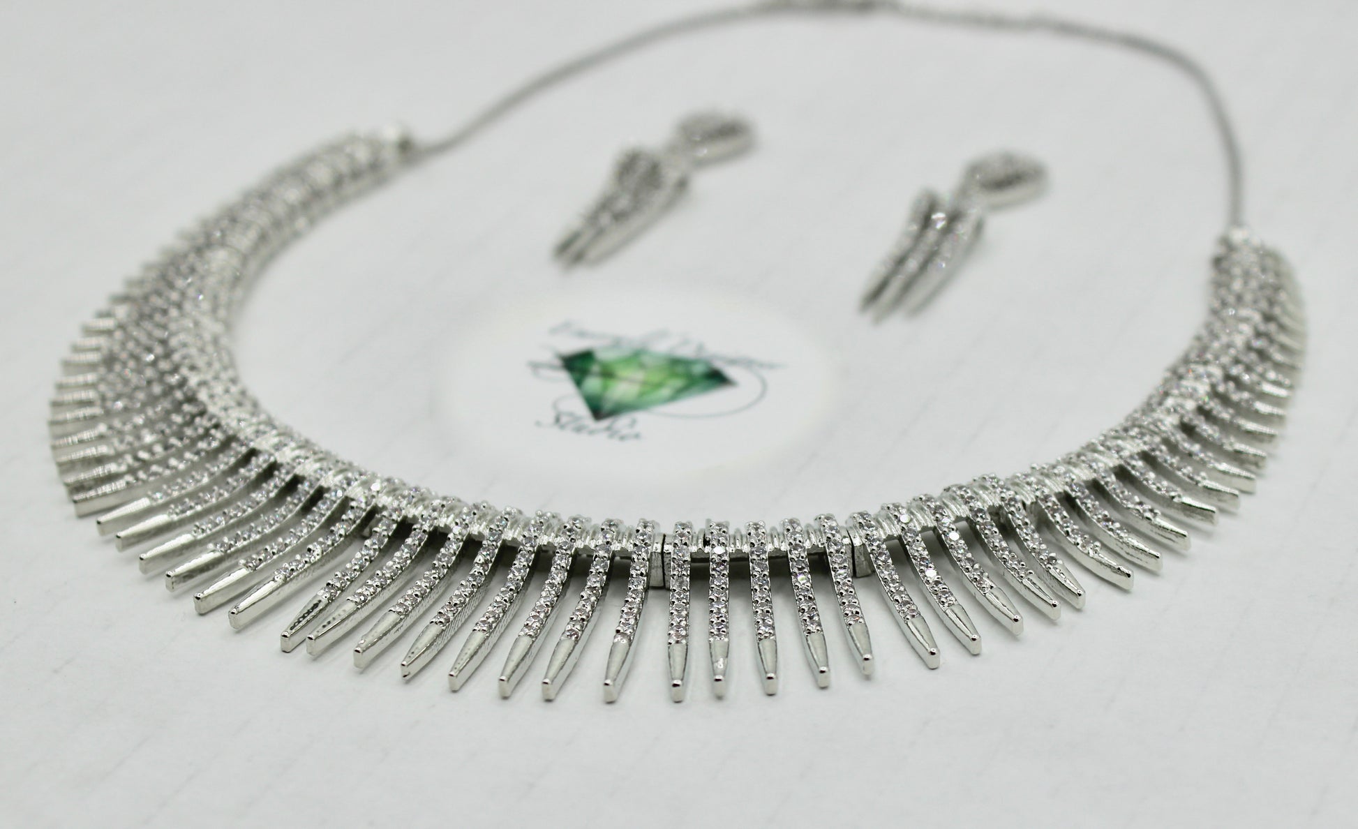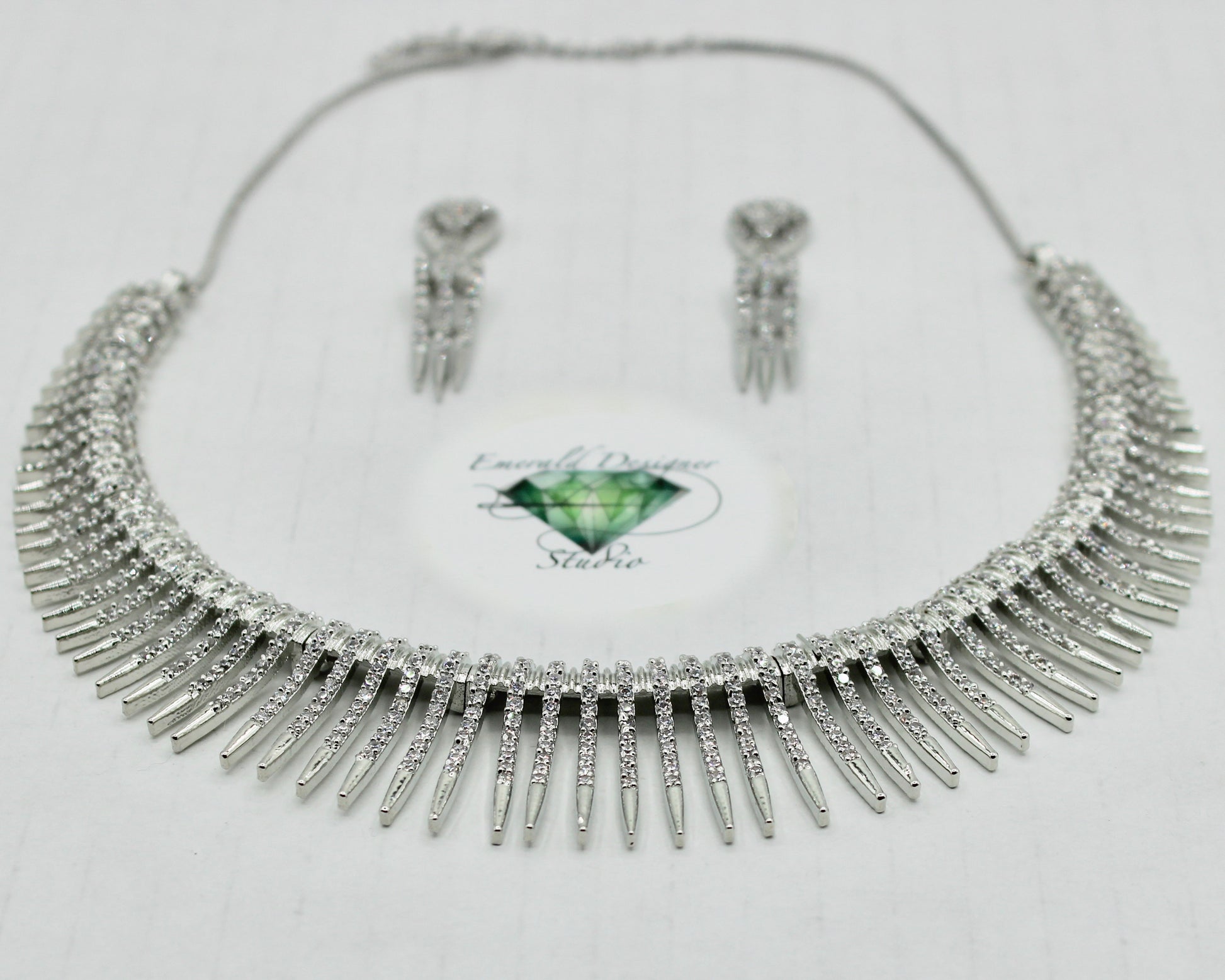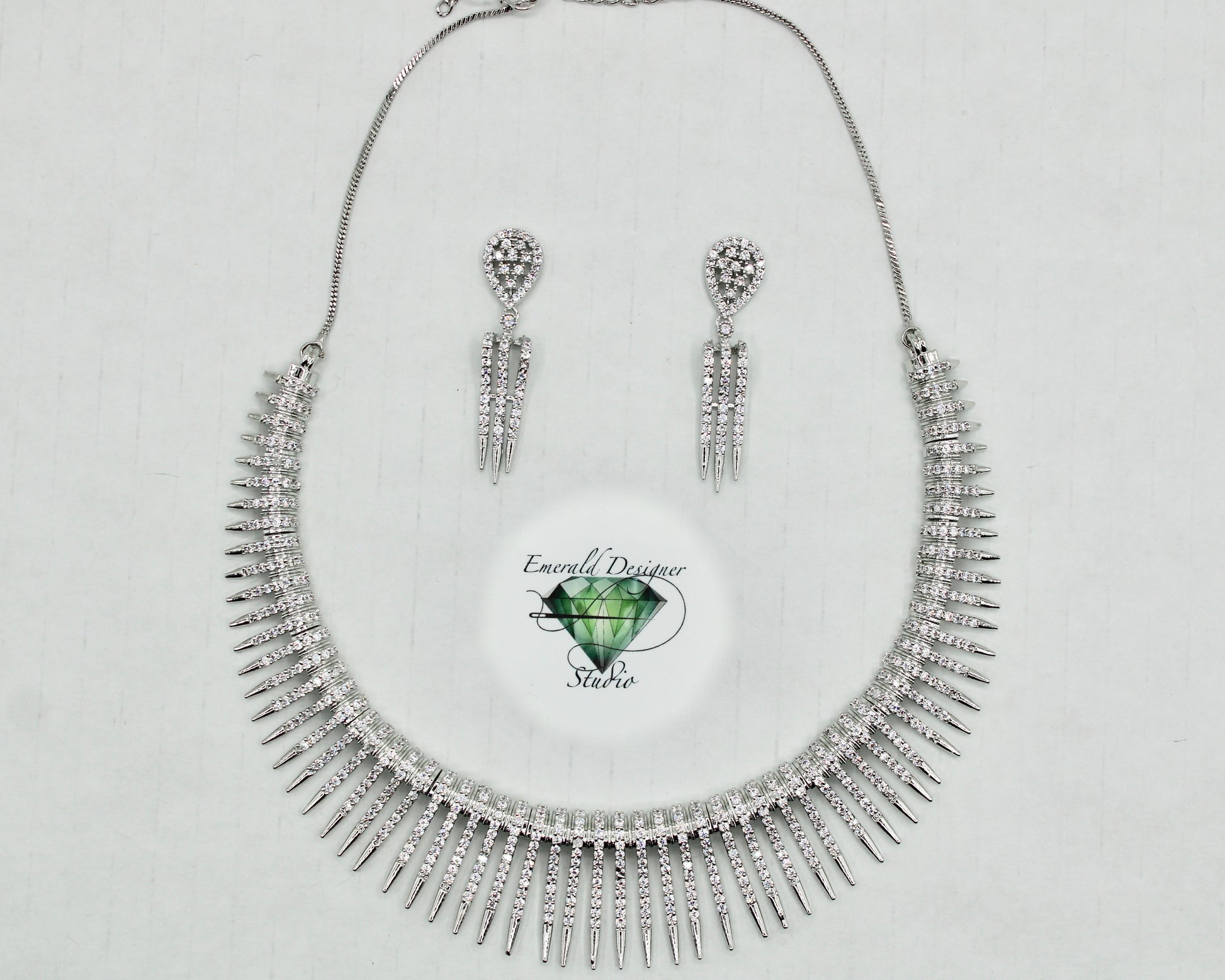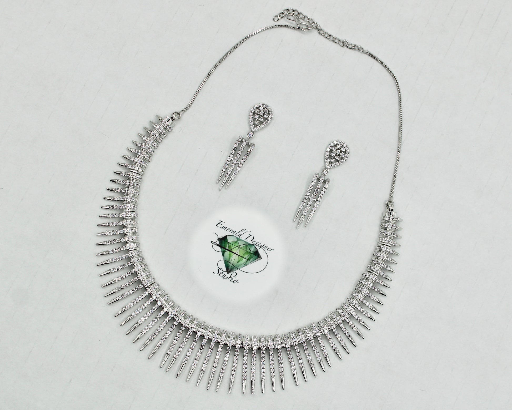 This elegant necklace set is made with cubic zirconia, in a sun-ray style and it is perfect for both eastern and western wear. It includes stylish matching earrings. Made of brass to increase product lifetime.