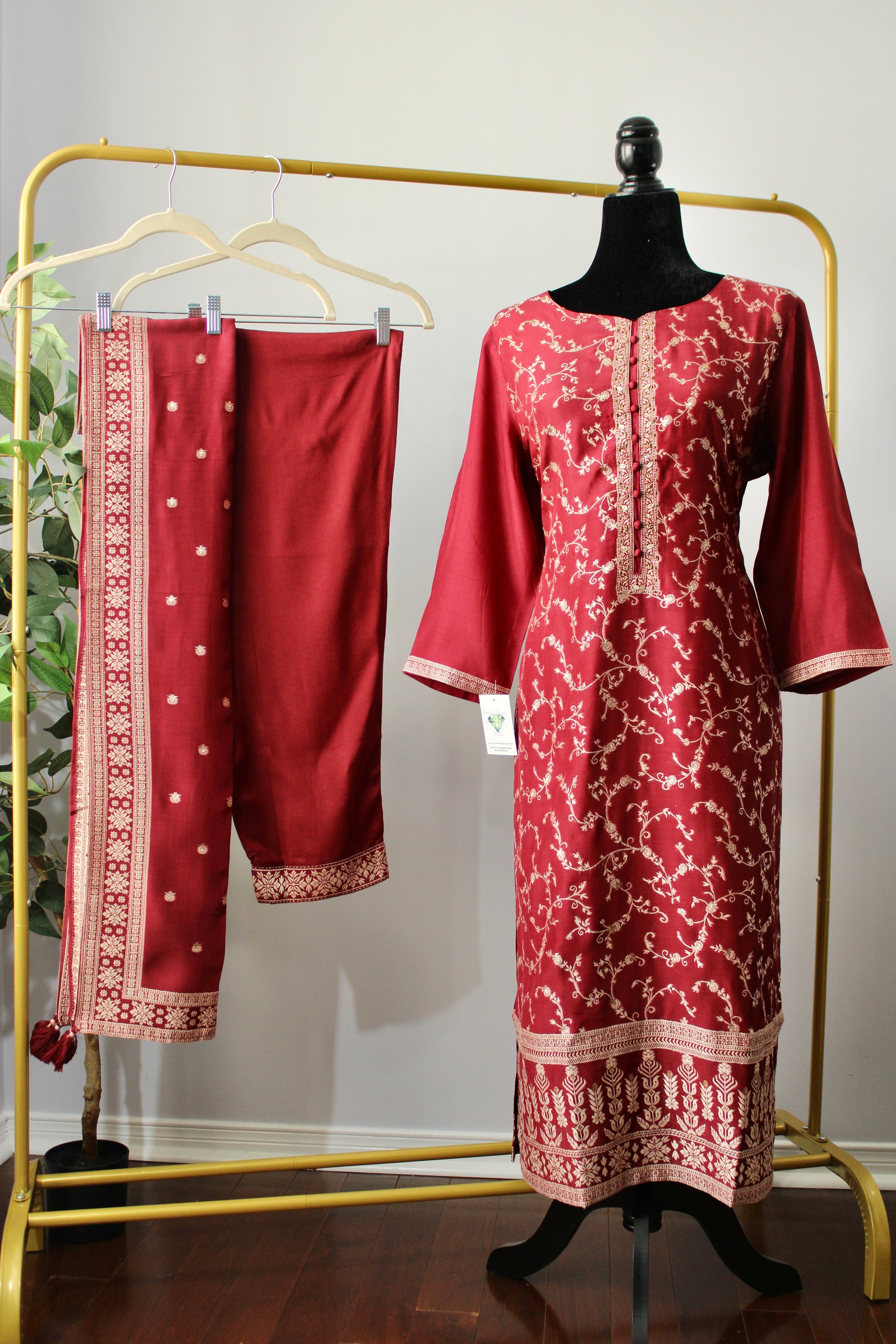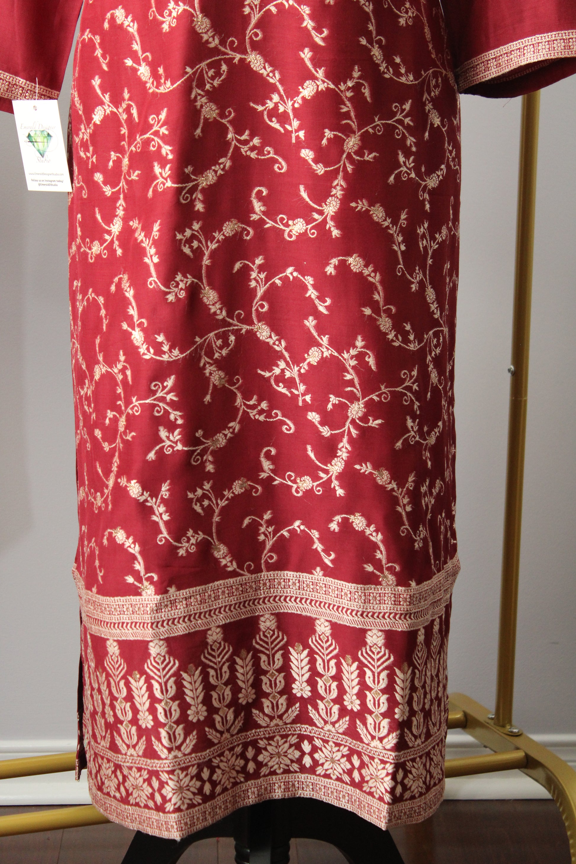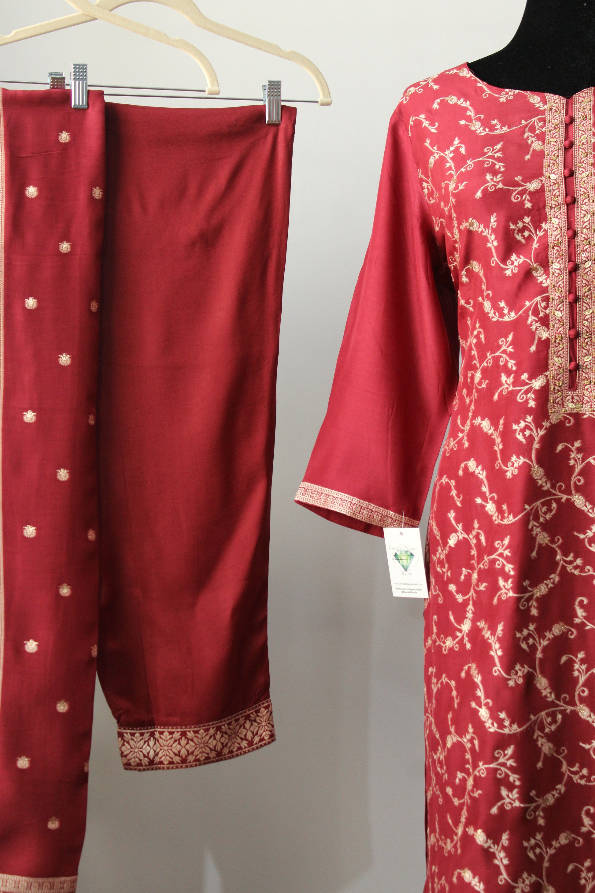 This elegant suit is composed of premium banarsi modal silk, perfect for any event and suitable for all ages. Beautifully crafted with intricate thread-work and embellished with delicate buttons on the neckline, it can be dressed up or down with ease.