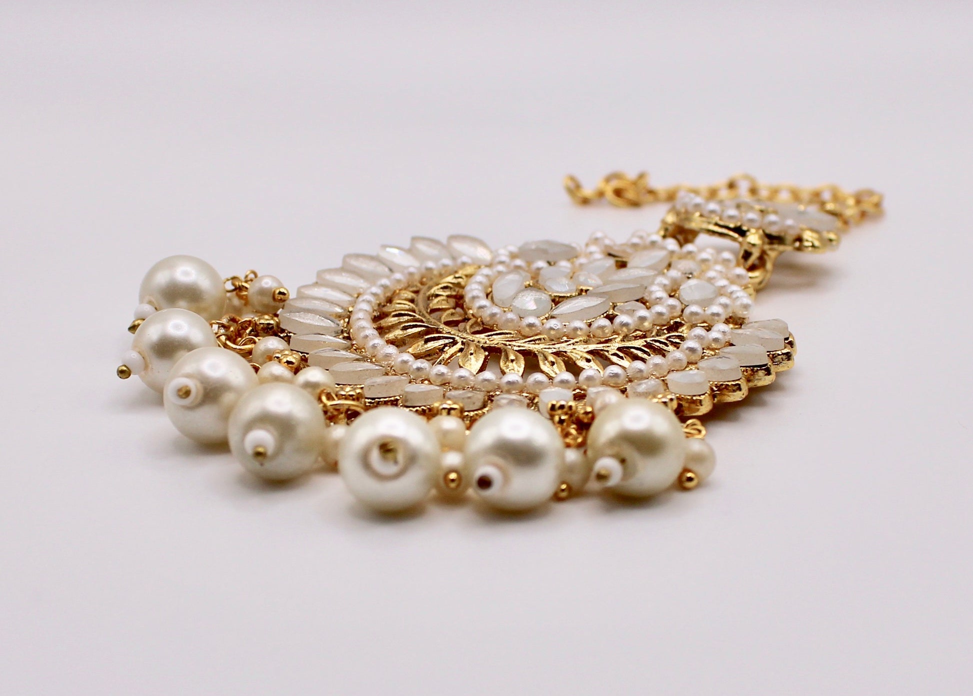 This gorgeous traditional teeka is made of sheesha kundan, with pearl detailing throughout.
