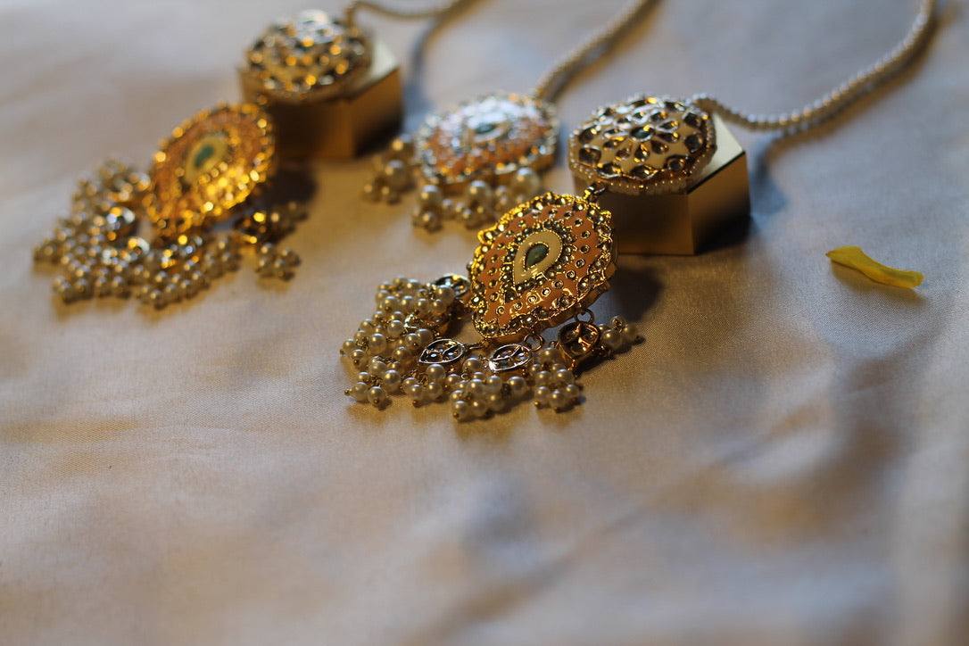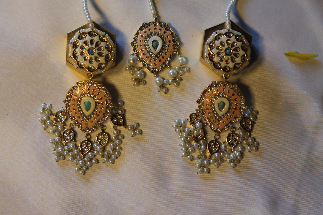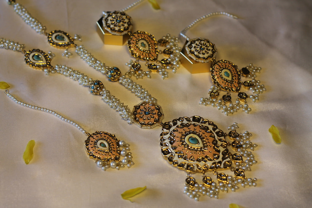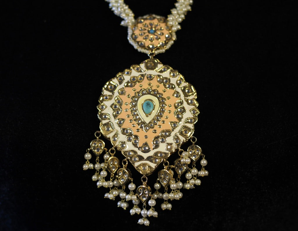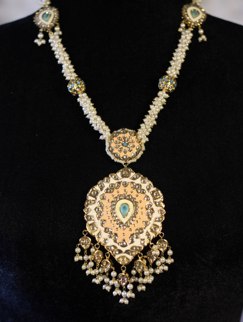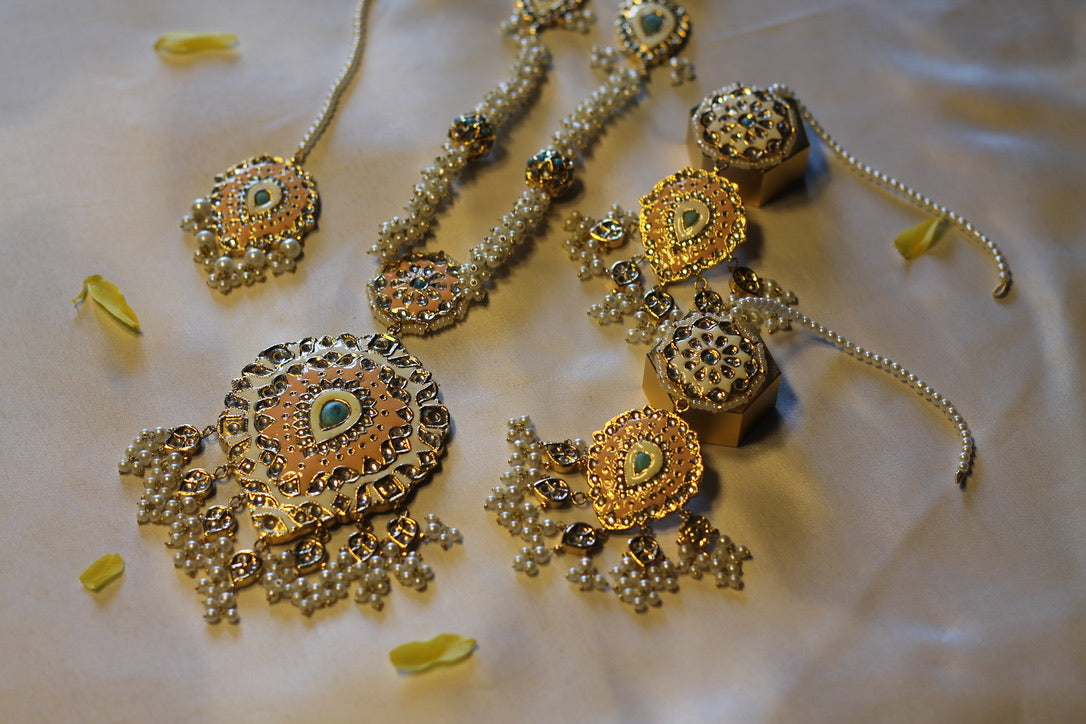This hand-made set is made of meena-kari and Pakistani thappa kundan. It is complete with a touch of semi precious Feroza stones. It is created in a traditional fashion, truly a classic. The gajra mala is detailed with thapa links. This set is complete with a matching teeka and earrings. Made of brass to increase product lifetime.
