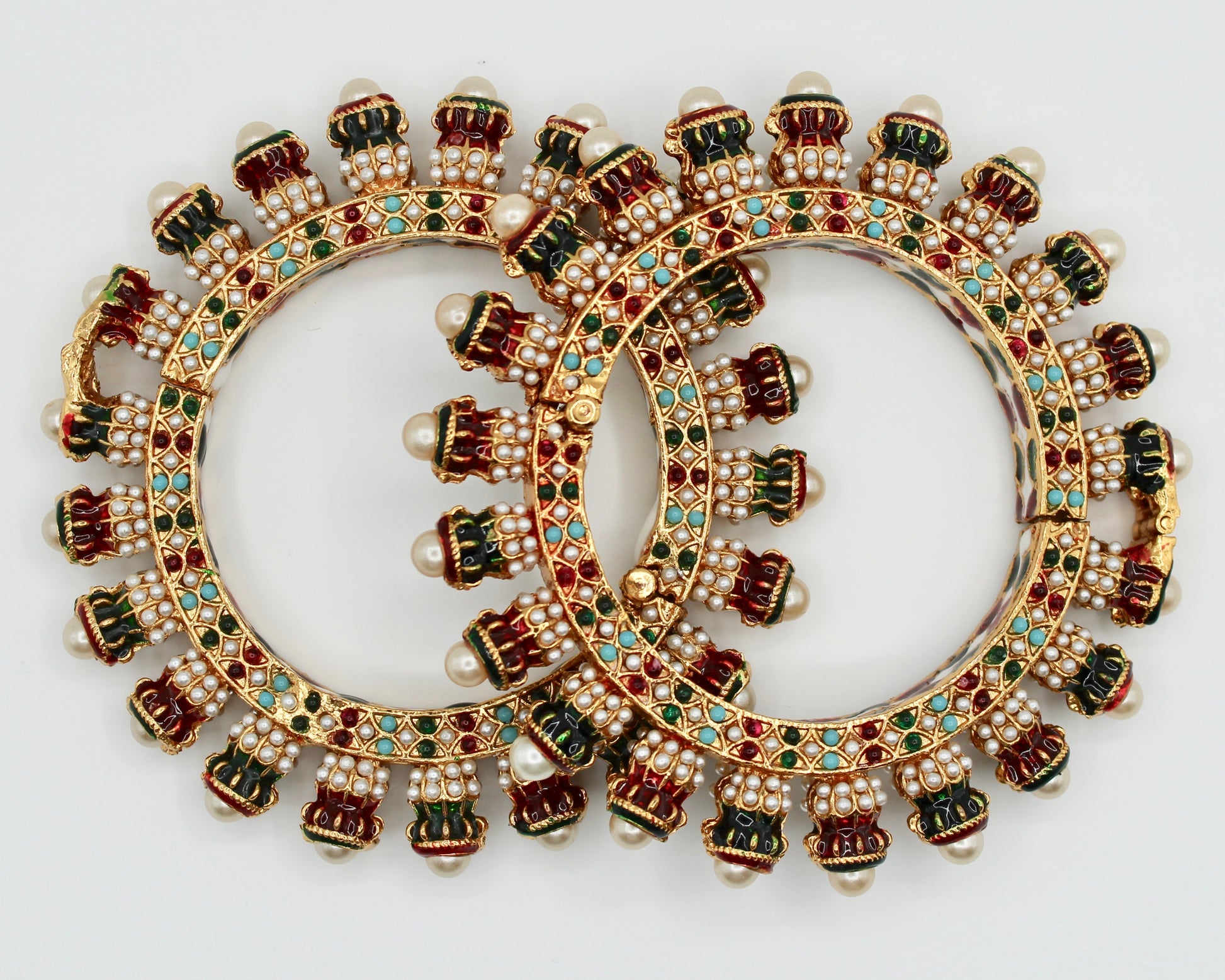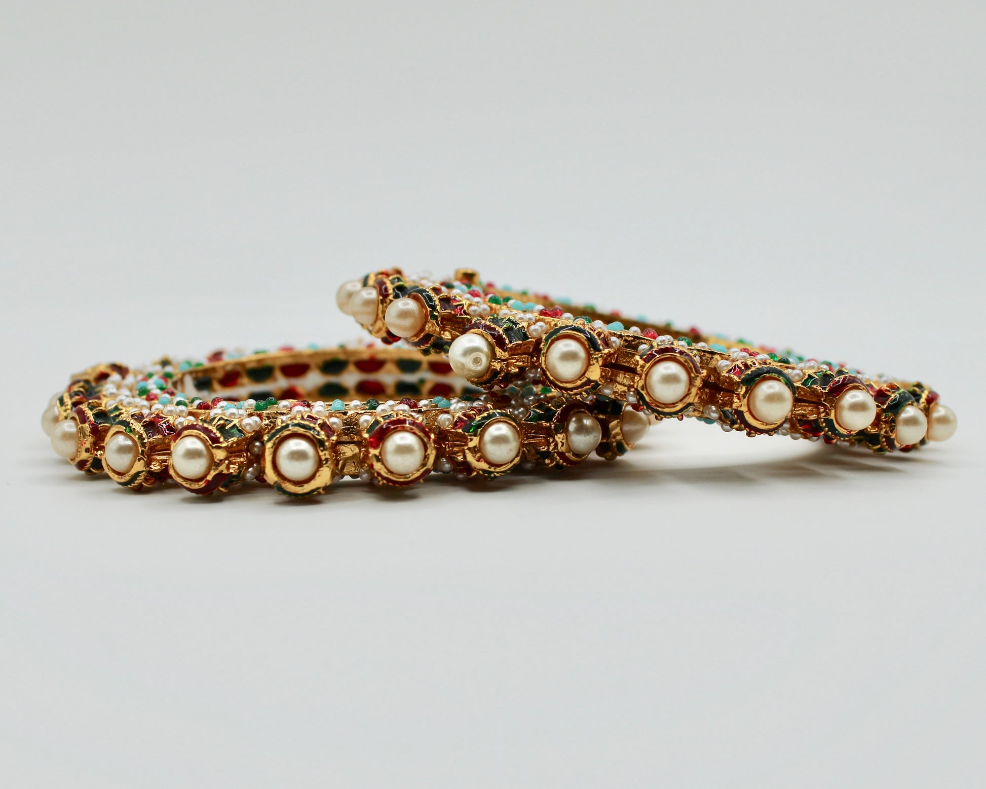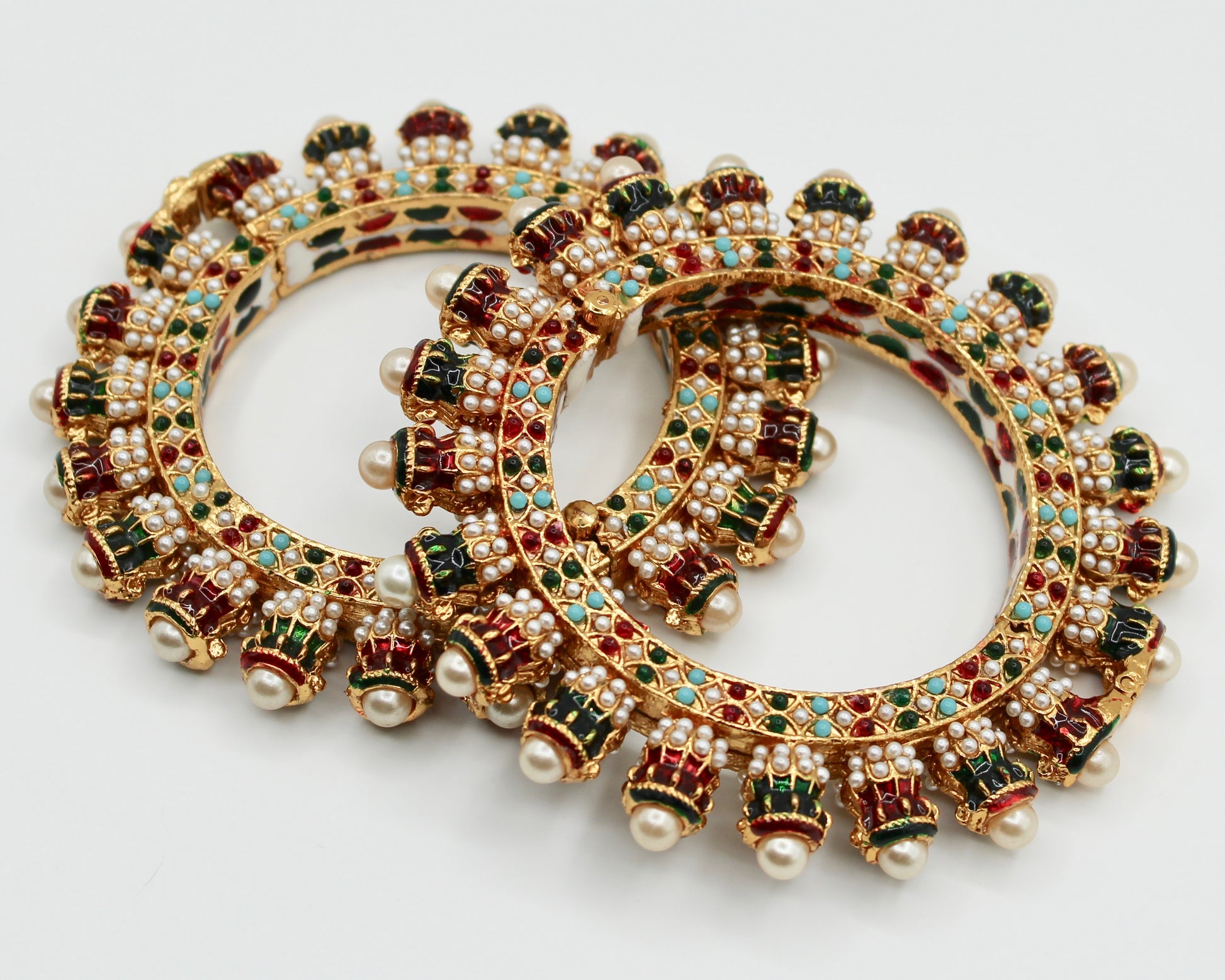 This show-stopping kadas are traditional Rajastani Pachheli, and is fillu handmade. It is intricately detailed with nauratan stones and pearls and has a 3D style effect with an authentic meena kari finish. For your convenience, these kaday are hinged with a clasp. Each kada is sold in singles.