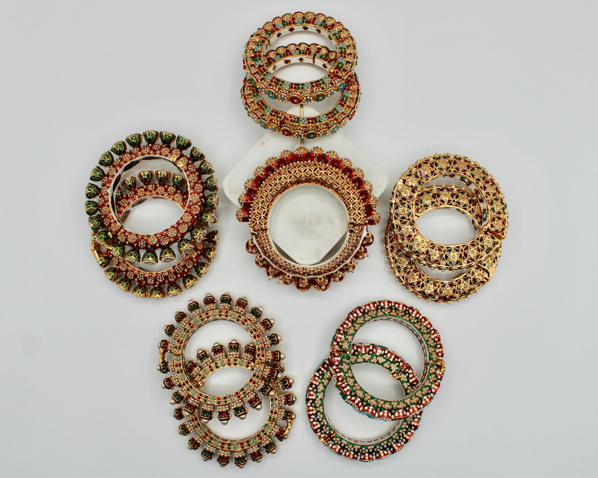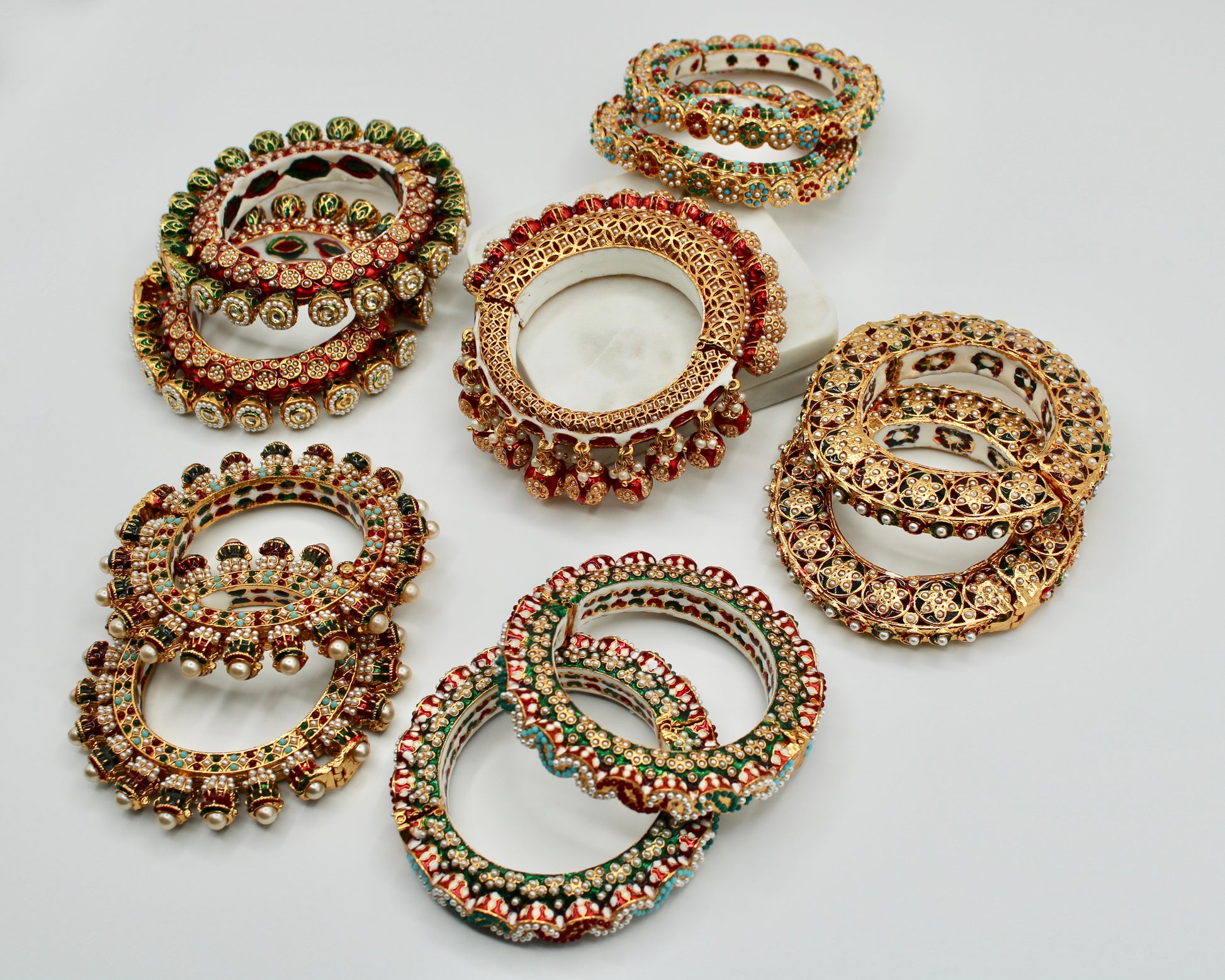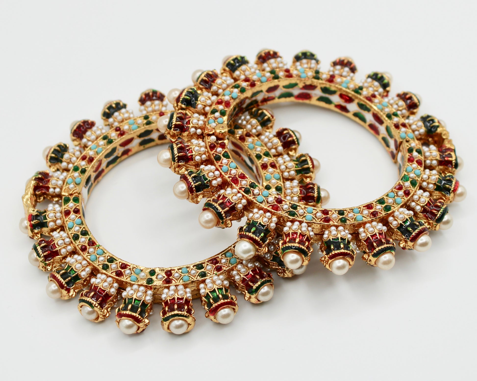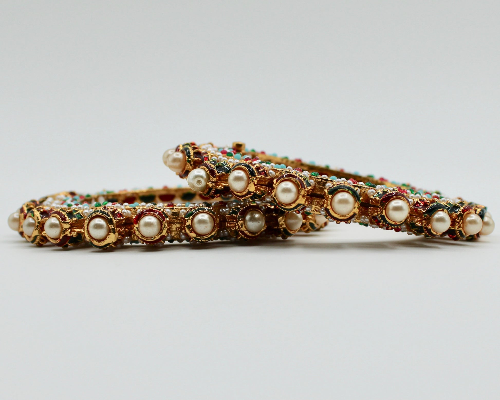 This show-stopping kadas are traditional Rajastani Pachheli, and is fillu handmade. It is intricately detailed with nauratan stones and pearls and has a 3D style effect with an authentic meena kari finish. For your convenience, these kaday are hinged with a clasp. Each kada is sold in singles.