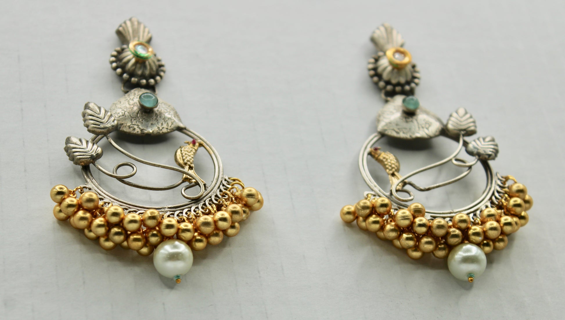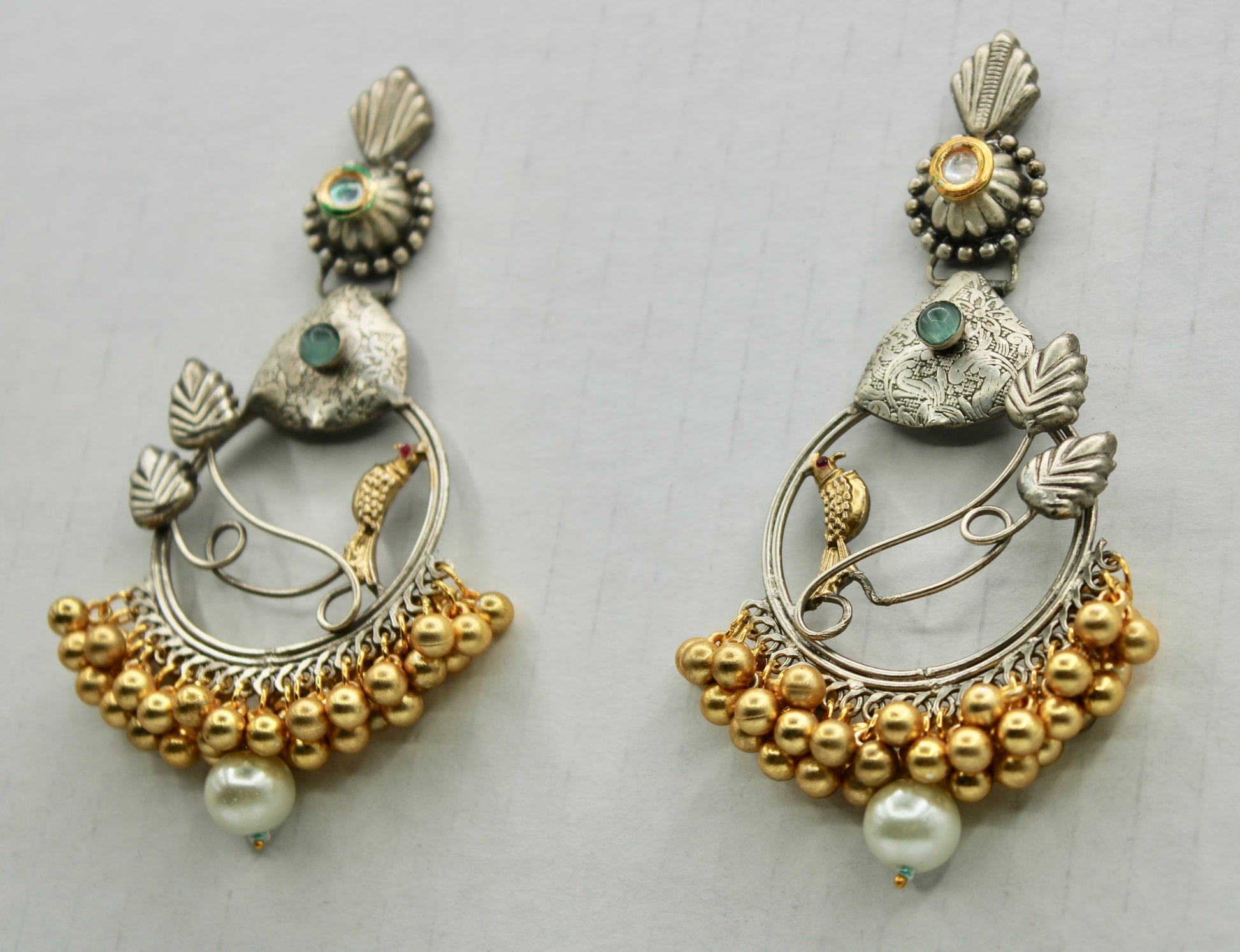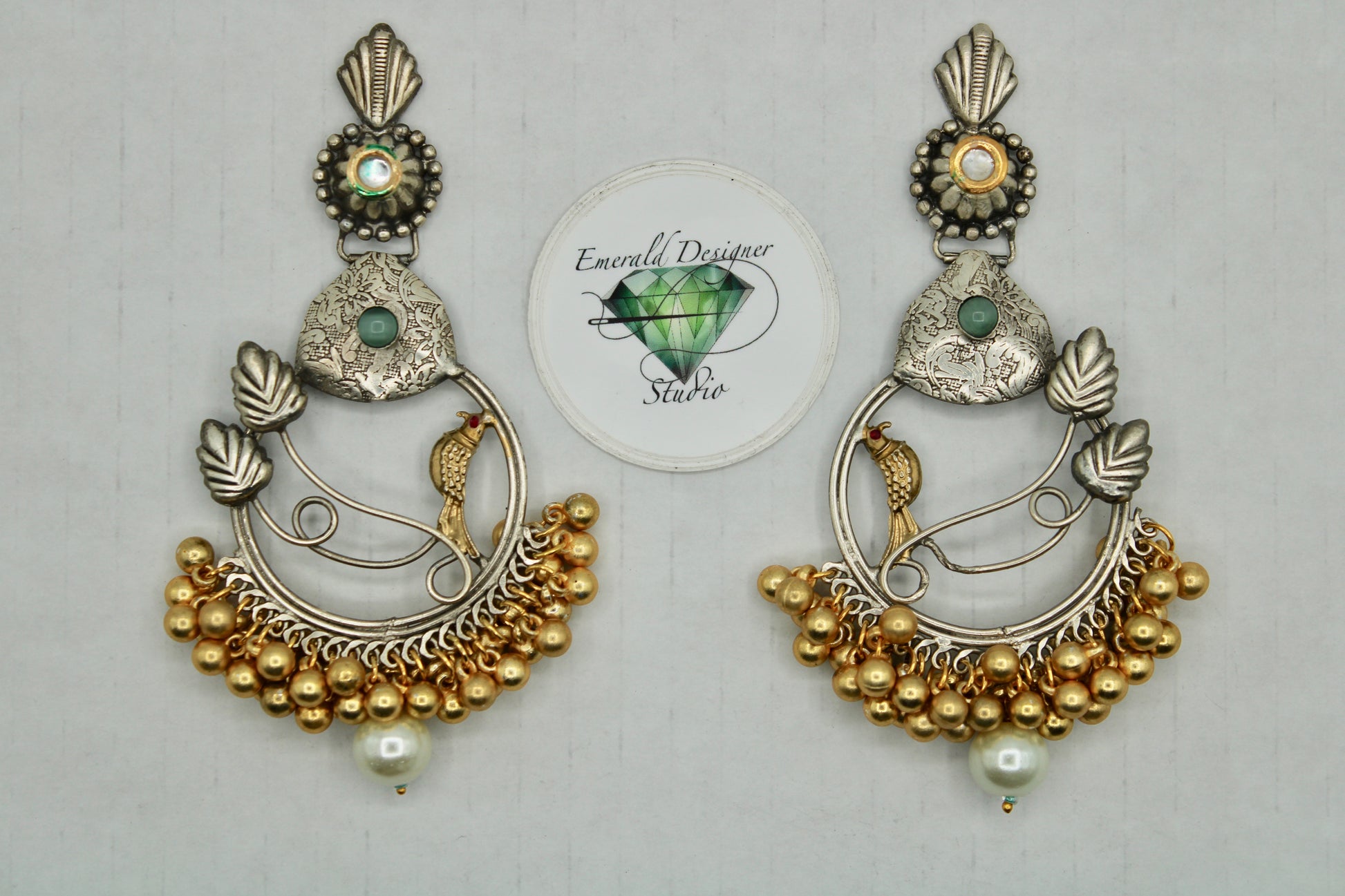 Add a unique touch to your style with our two-toned oxidized earrings with mona lisa. Featuring kundan work, faux pearls, and ghungroo, these earrings are the perfect addition to any look. Made with high-quality materials, they offer a timeless and elegant look.