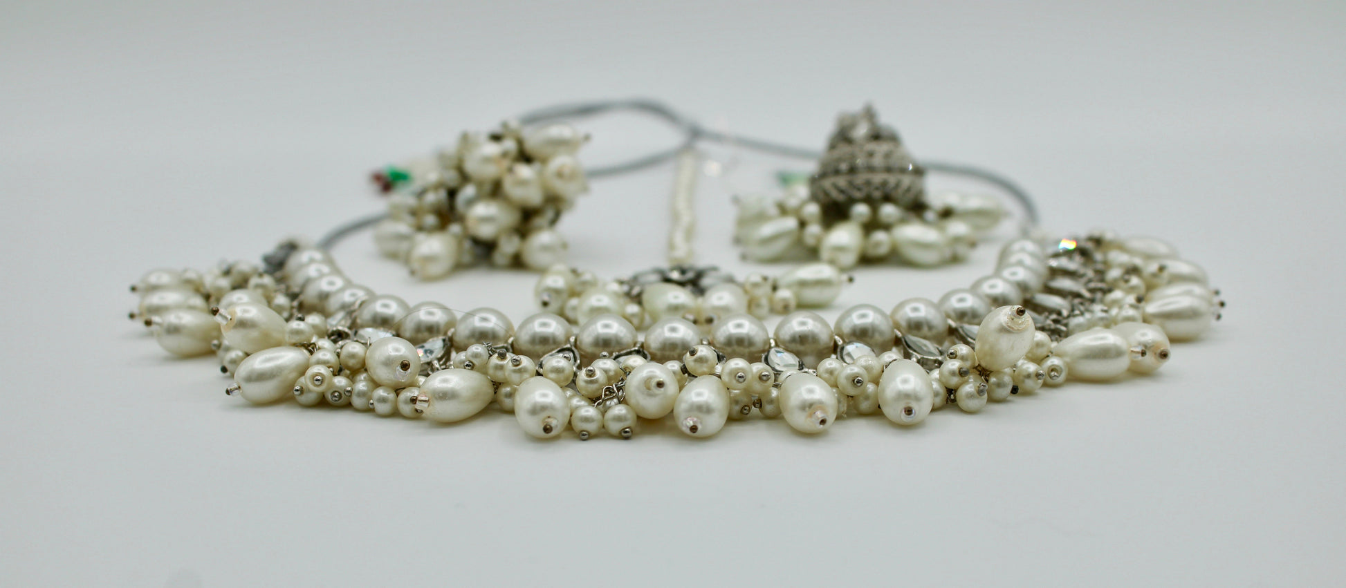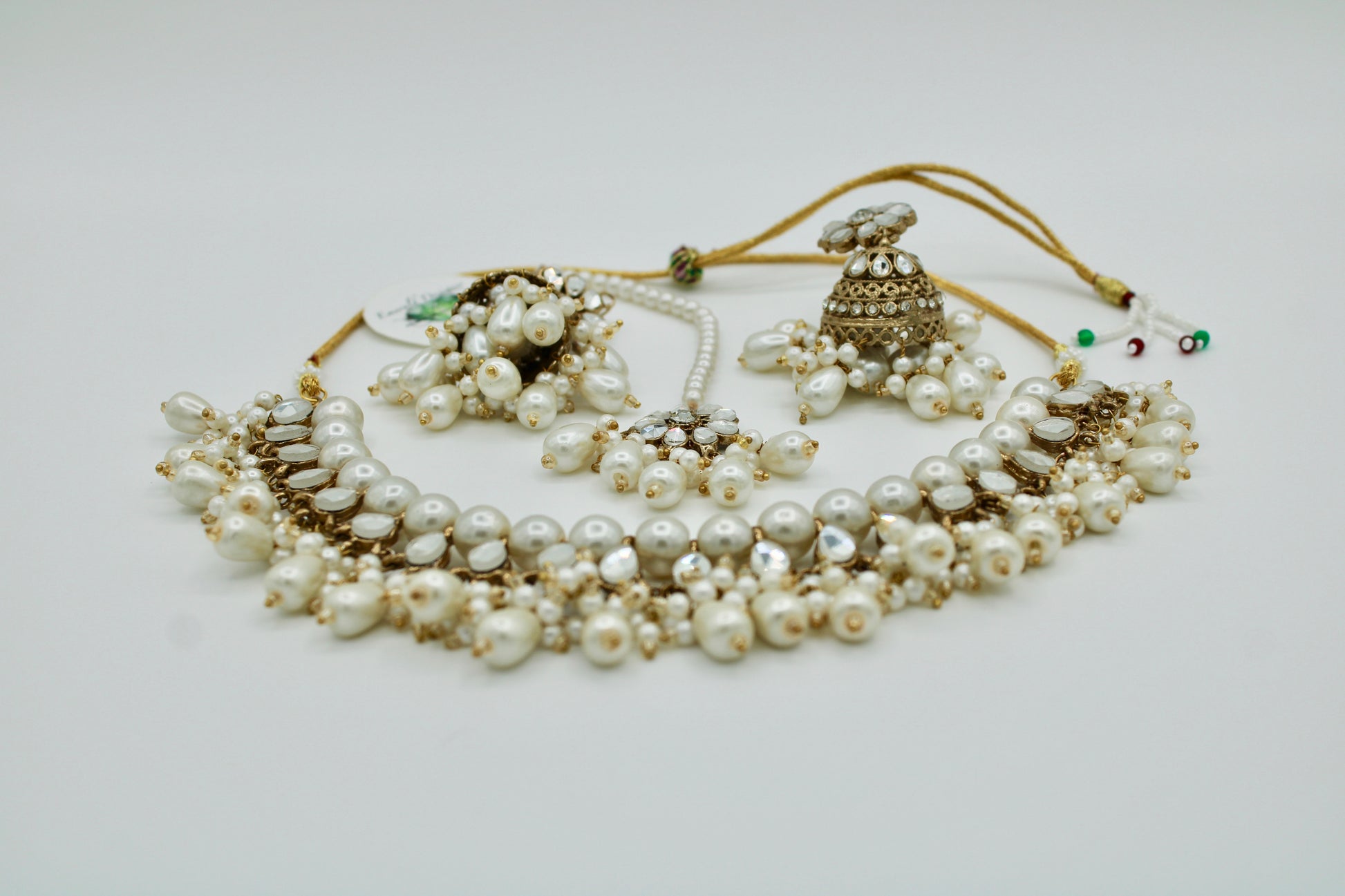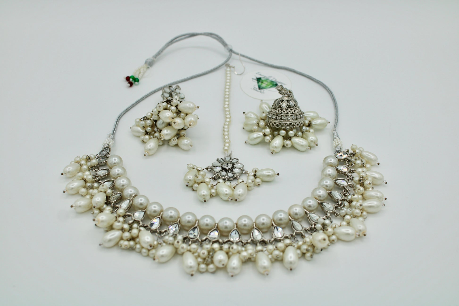 This sophisticated sheehsa kundan necklace set is complete with faux pearl detailing, and includes a matching teeka and earrings. It is the perfect addition for all outfits.