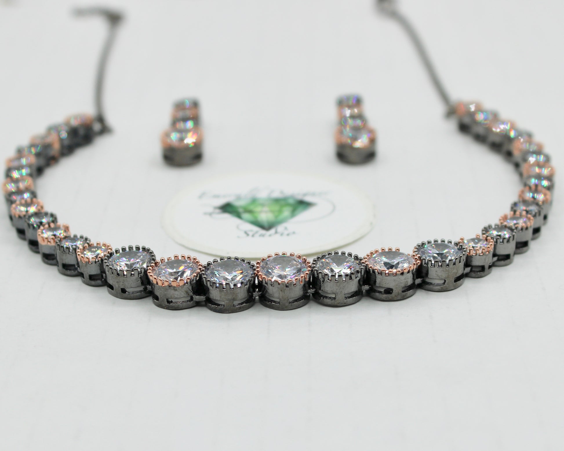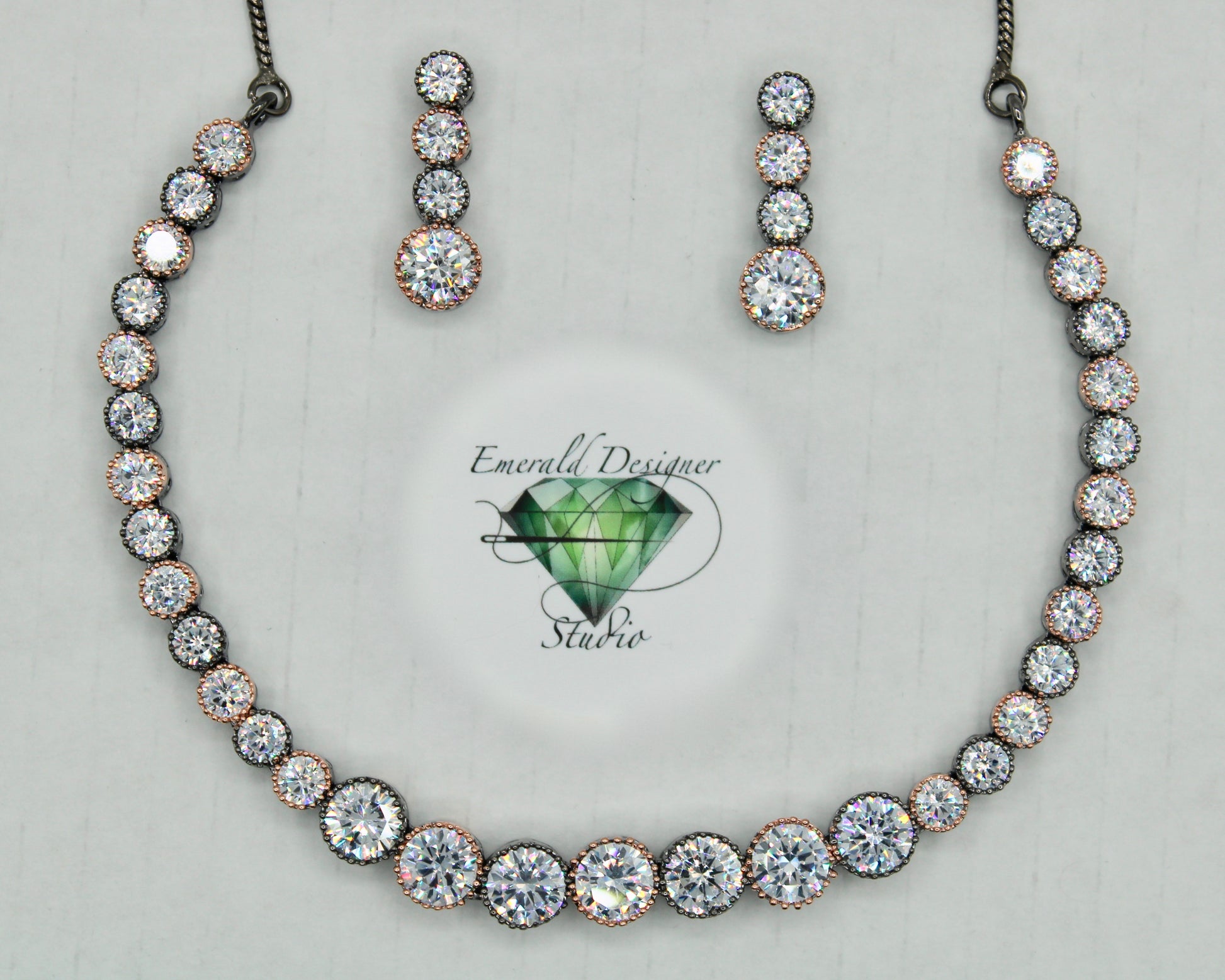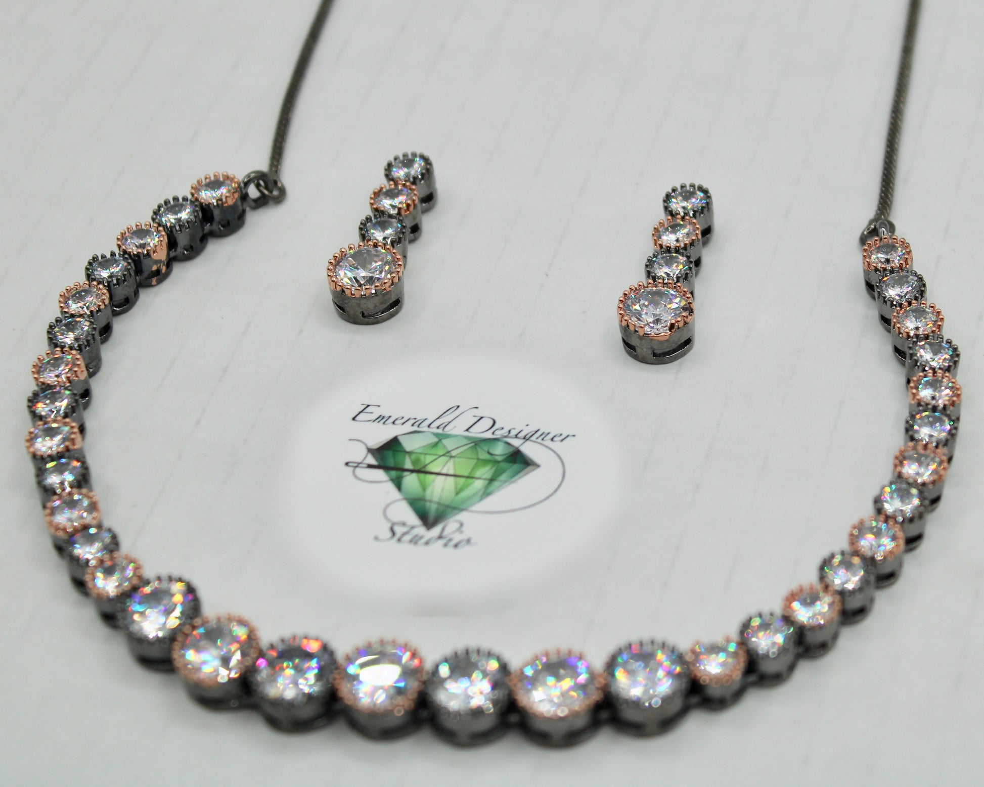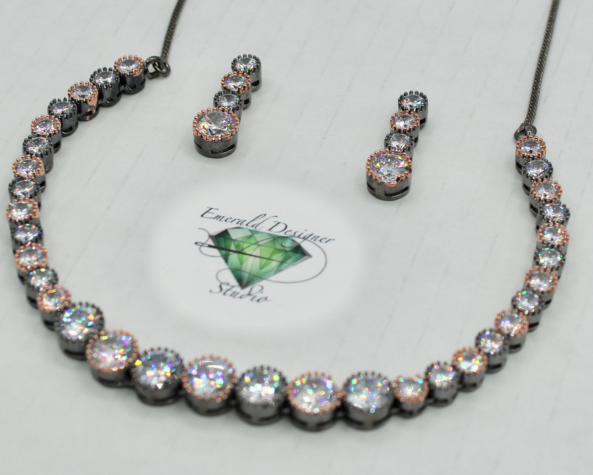 یہ شاندار ہار سیٹ گن میٹل میں ہے، گلاب سونے کی تعریفوں کے ساتھ، اور پورے کیوبک زرکونیا کے ساتھ مکمل ہے۔ یہ ایک منفرد ٹکڑا ہے اور تمام مواقع کے لیے بہترین ہے۔