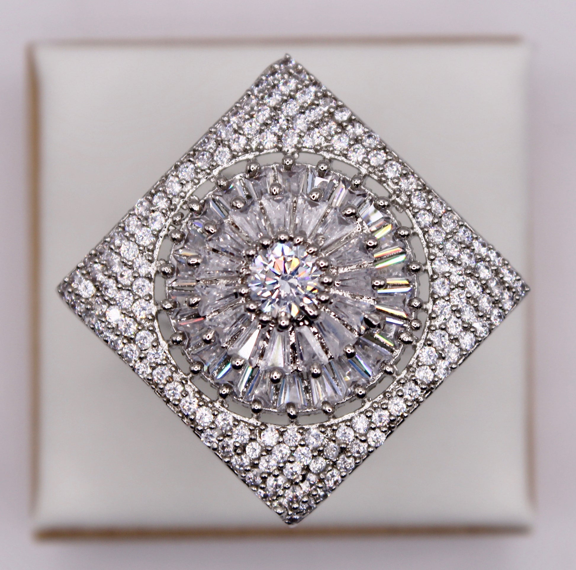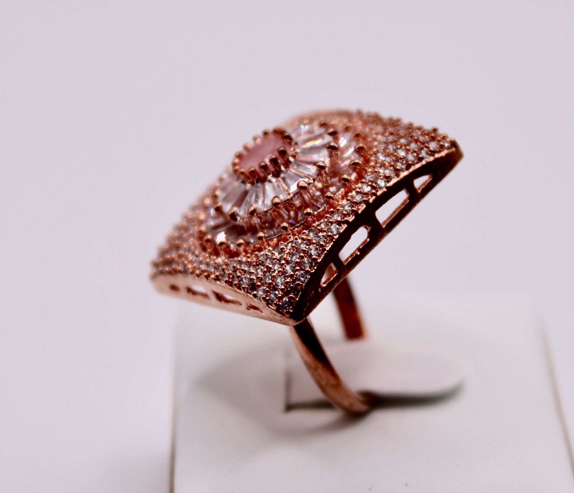 یہ شاندار انگوٹھی مربع شکل کی ہے، اور کیوبک زرکونیا کے مختلف کٹس کے ساتھ تفصیلی ہے۔ مصنوعات کی زندگی بھر میں اضافہ کرنے کے لیے پیتل سے بنا ہے۔