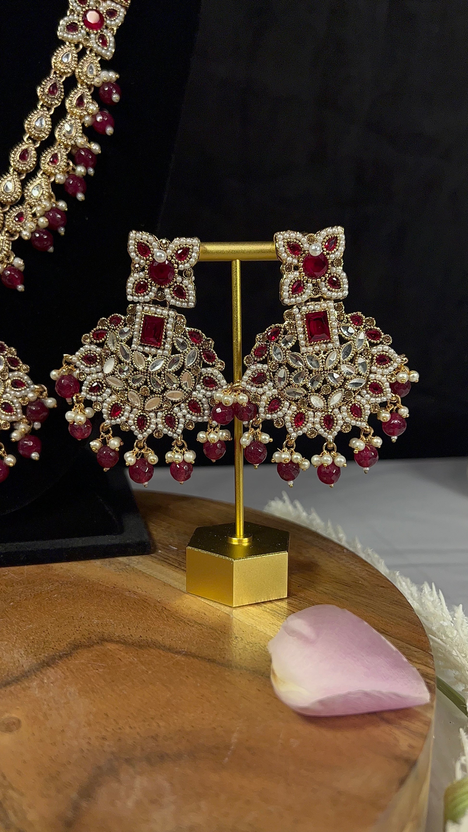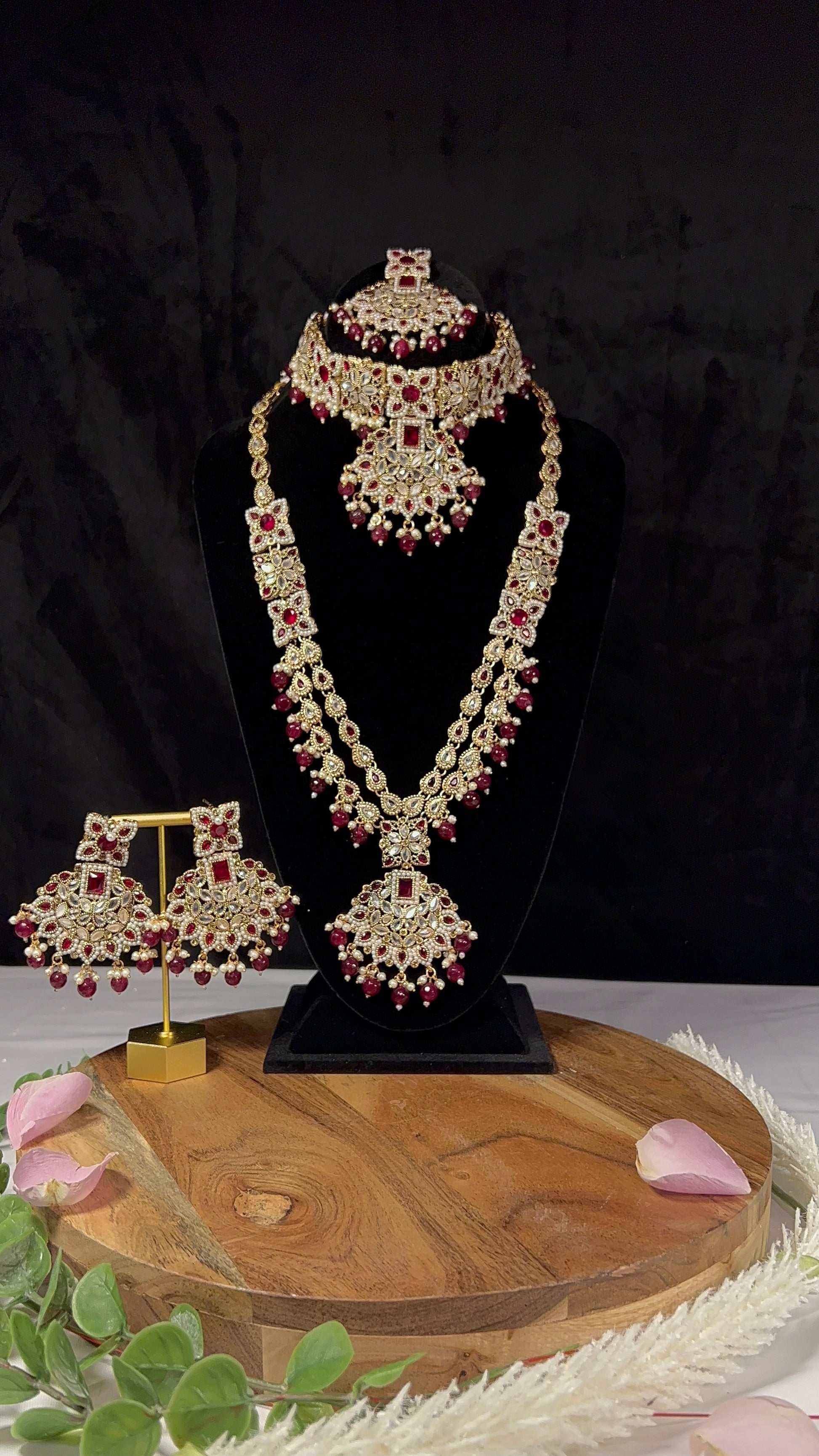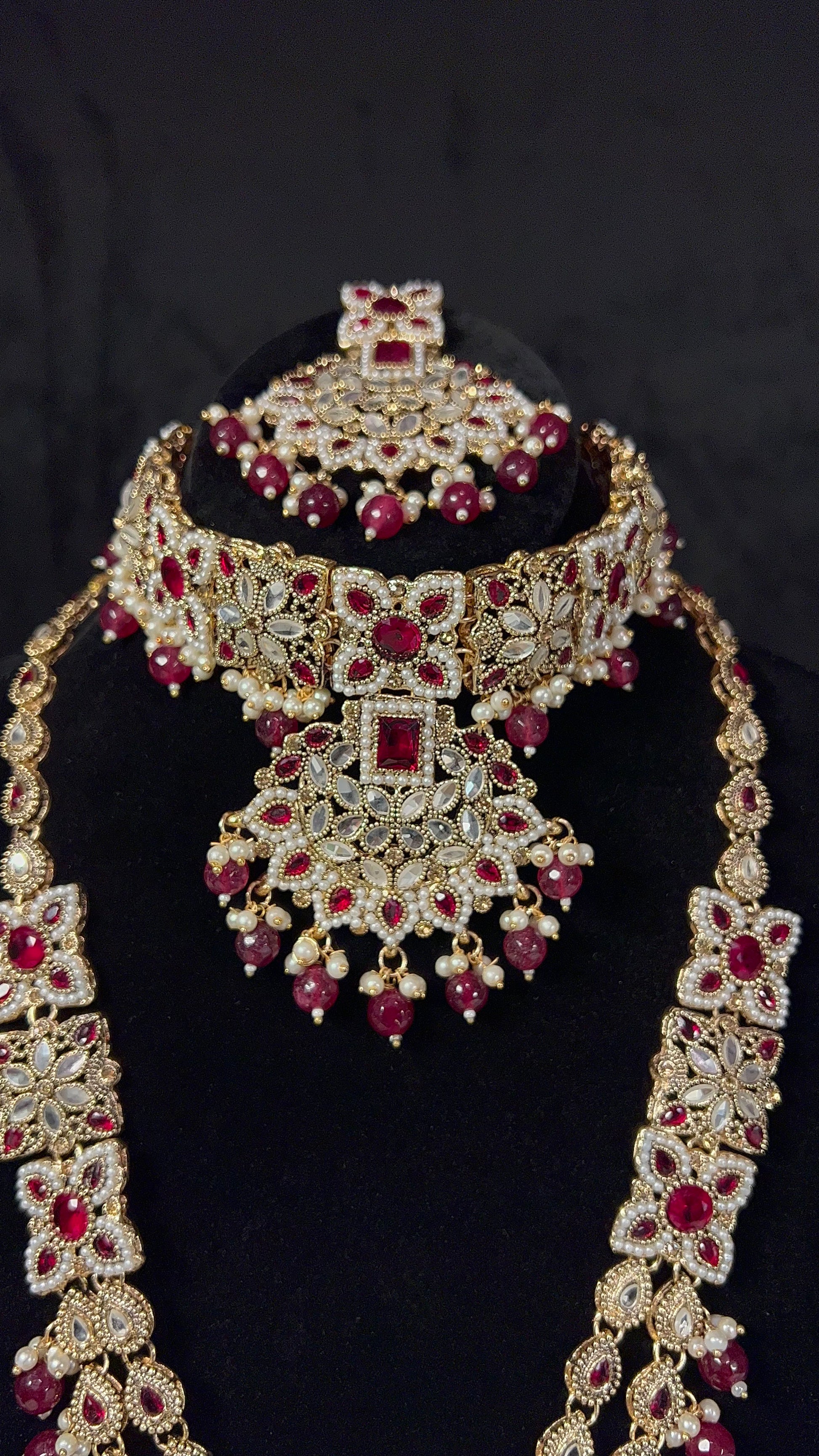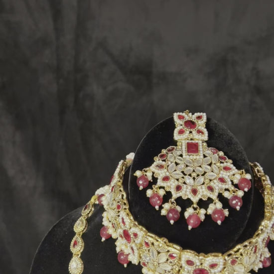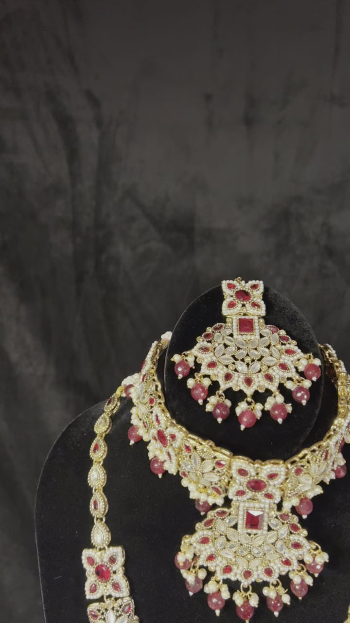 یہ روایتی شیشہ کندن چوکر سیٹ موتیوں اور کرسٹل کے ساتھ پیچیدہ طور پر تفصیلی ہے۔ اس ڈھولنا سیٹ میں چوڑی بالیاں شامل ہیں۔