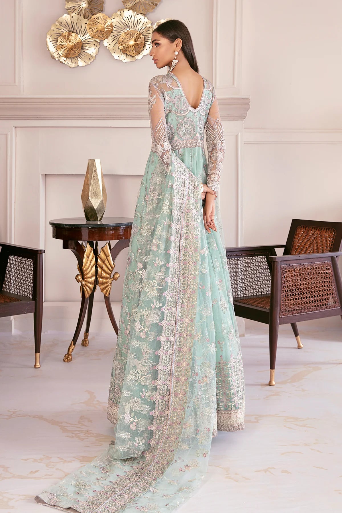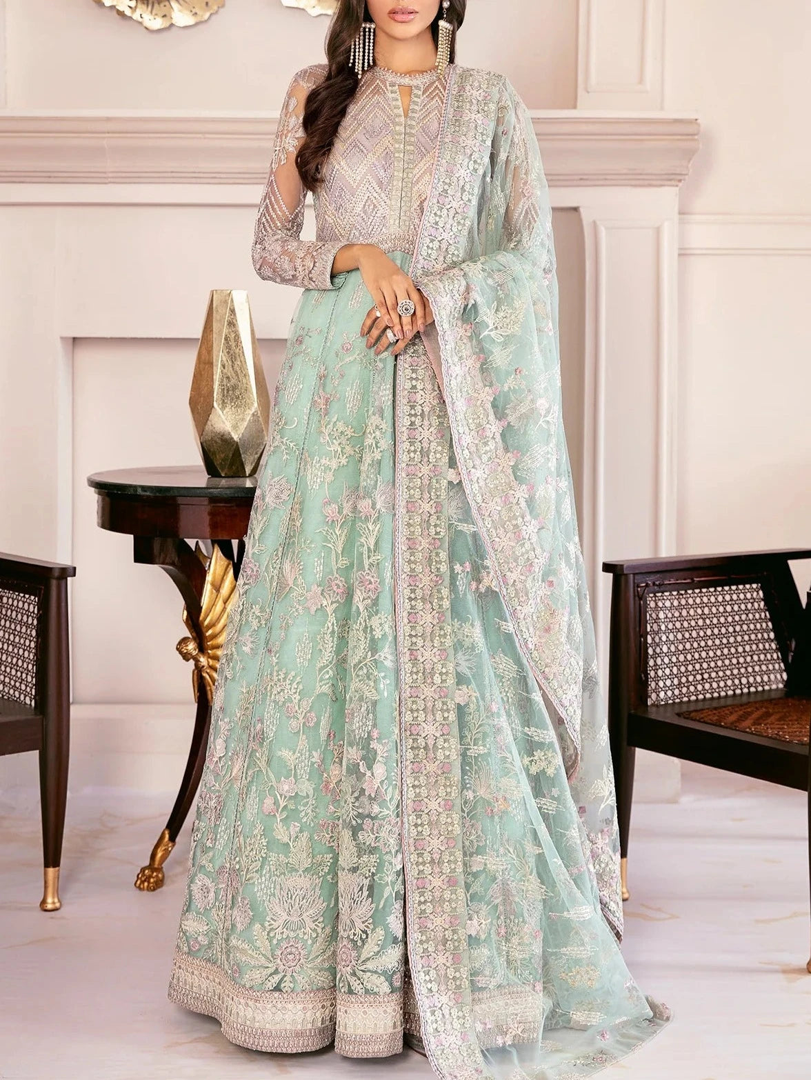 Baroque official, premium stitched. This classic light sea-green net ensemble is sure to curate an elegantly ravishing style statement. The top has intricate embroidery throughout, and the proficiently crafted embroidery embellishes the dupatta, while the intermingling shades exude the subtle aura of sophistication. A dyed silk trouser completes the outfit.