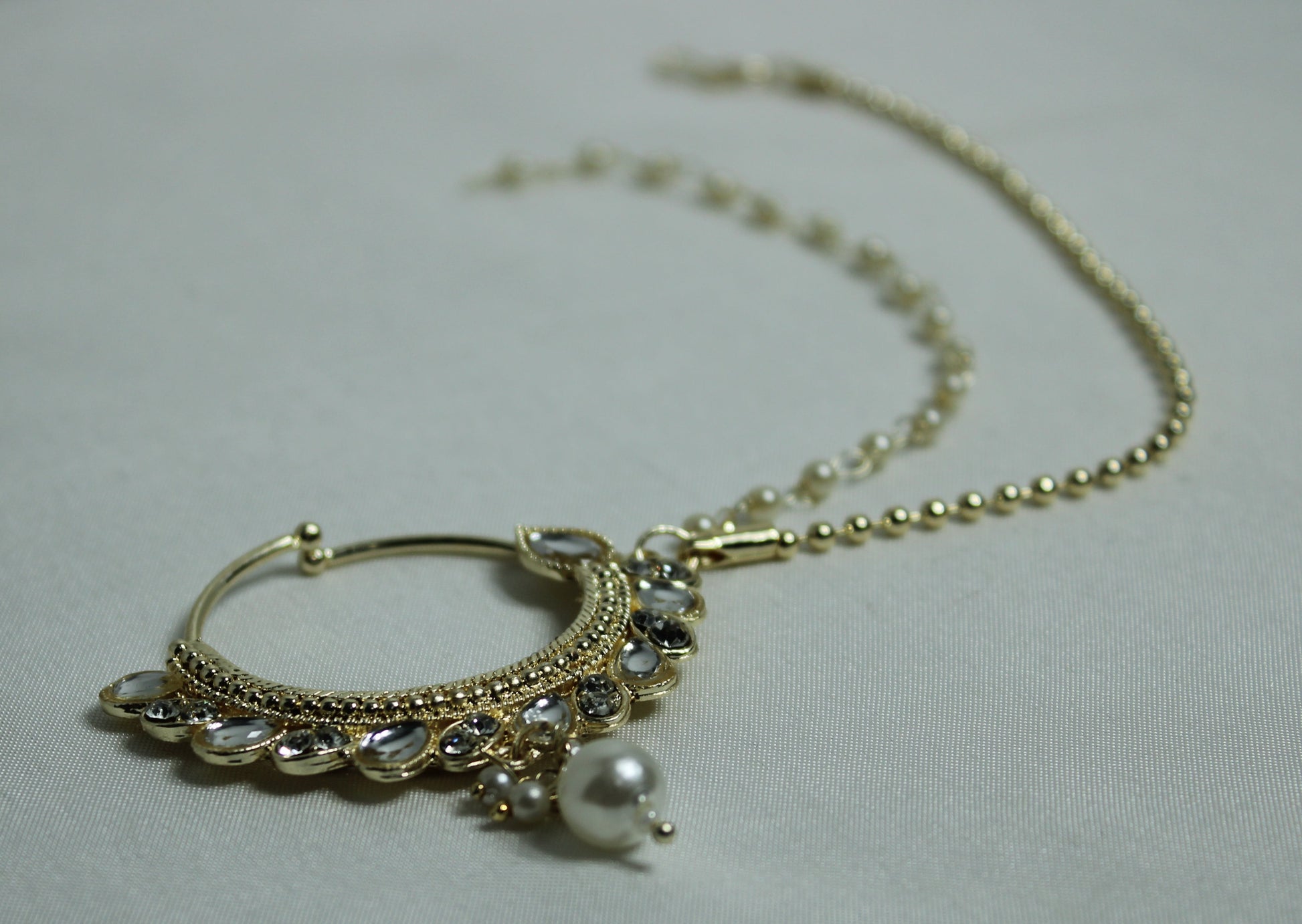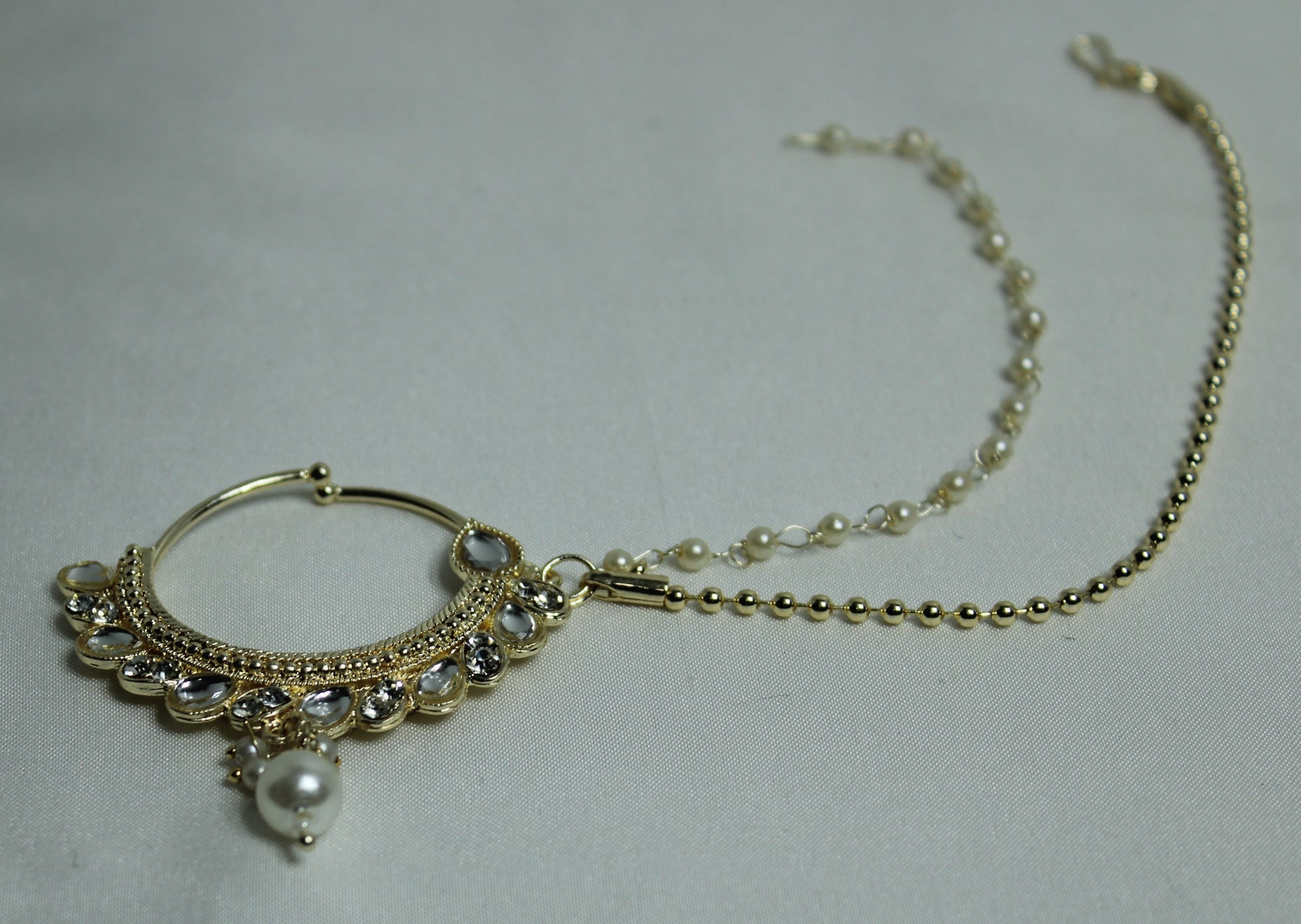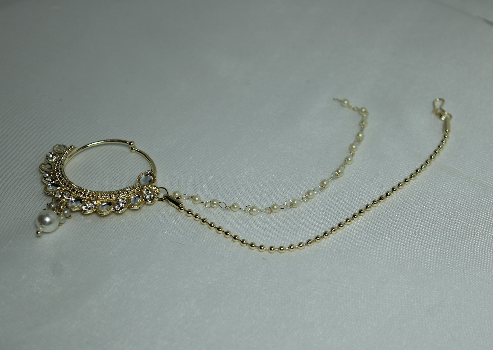 یہ شاندار دلہن کی ناک کی انگوٹھی غلط موتی اور غلط کندن کی تفصیلات سے بنی ہے، یہ کلپ آن ہے اور کسی بھی شکل کو بلند کرنے کے لیے بہترین ہے۔