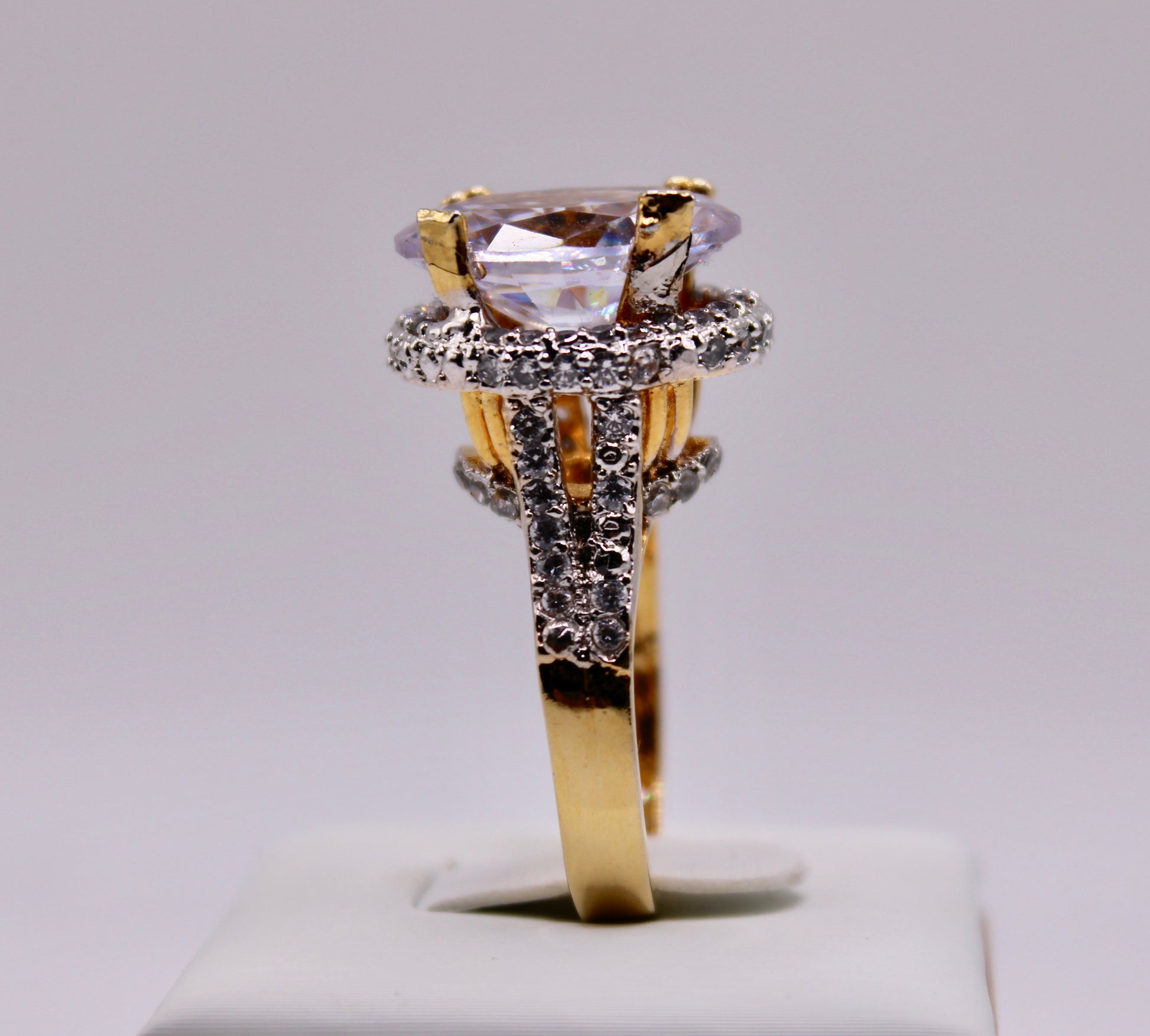 This stunning cathedral ring is complete with centred cubic zirconia. It is the perfect addition to both Eastern and Western looks.
