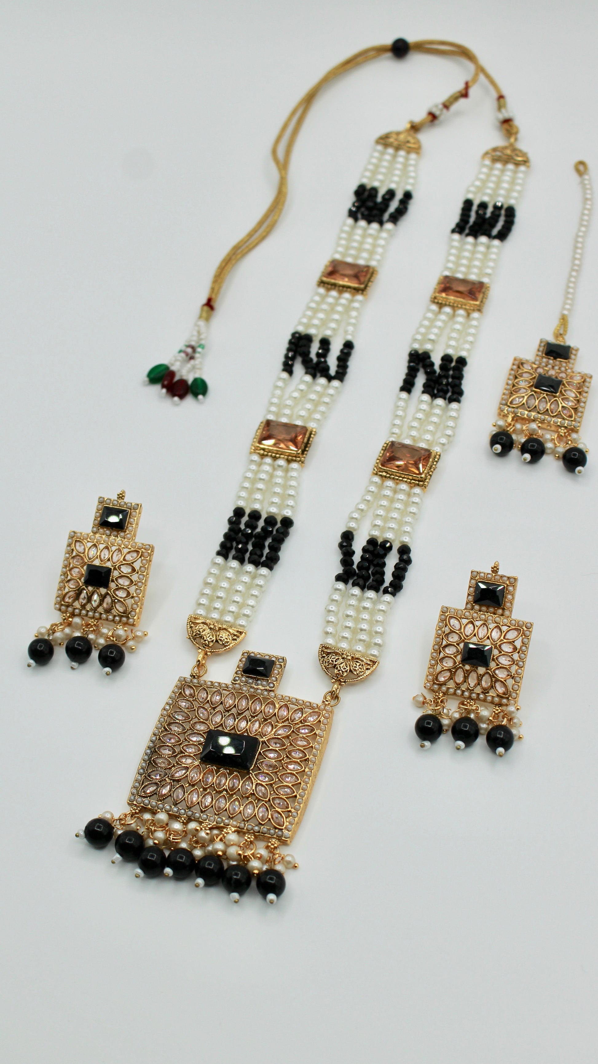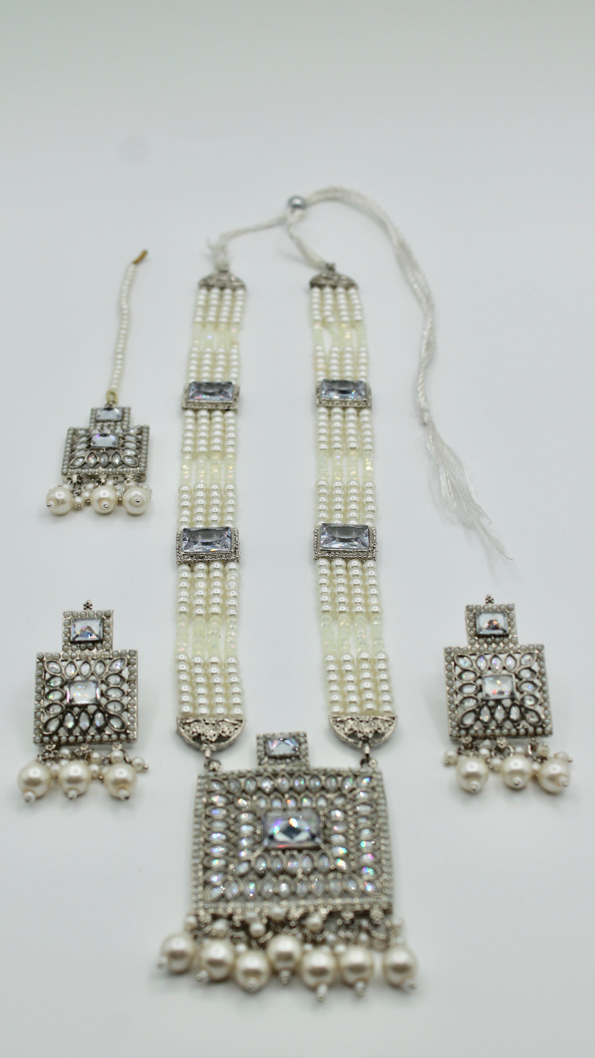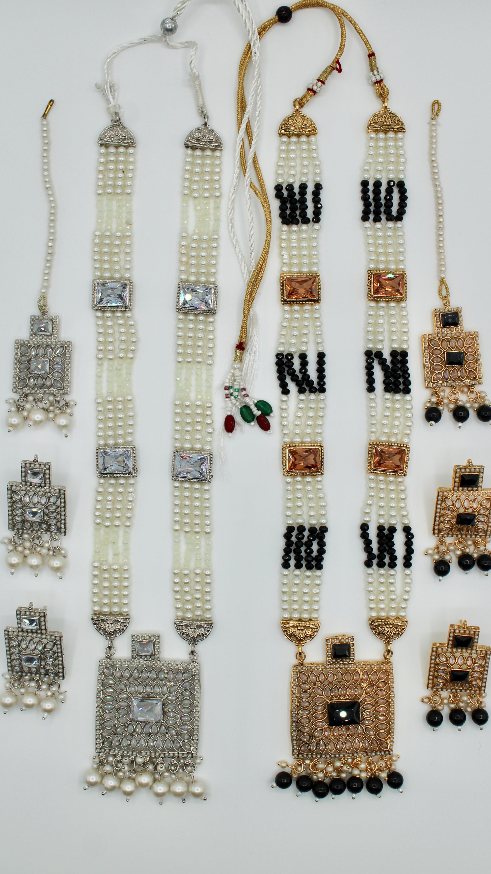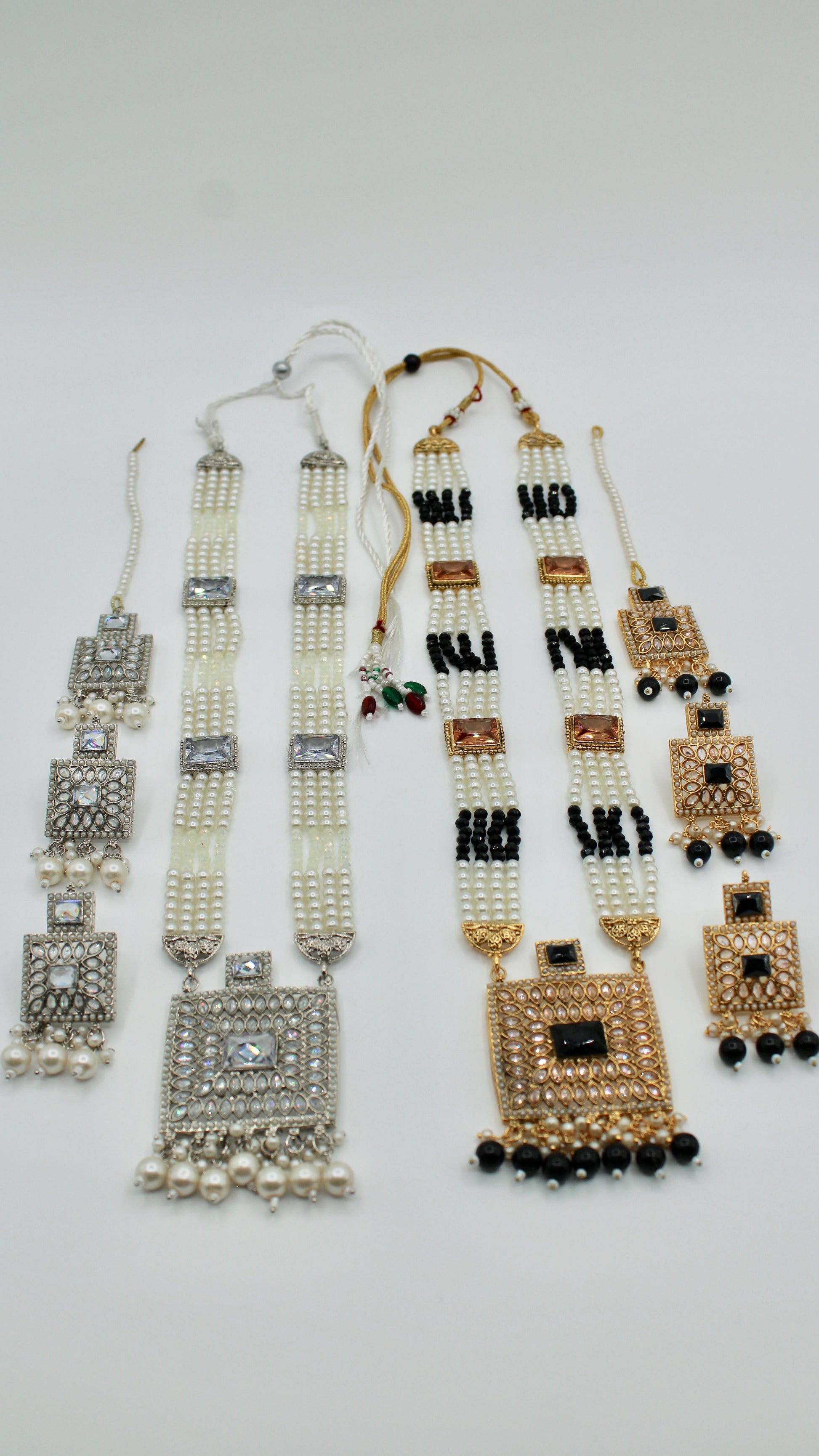 یہ شاندار مربع شکل کا لاکٹ مالا سیٹ کیوبک زرکونیا اور موتیوں سے ہاتھ سے بنایا گیا ہے۔ یہ مالا موتیوں اور کرسٹل کی تہوں کے ساتھ ہاتھ سے بنی ہوئی ہے۔ اس سیٹ میں بالیاں اور ایک ٹیکا شامل ہے۔