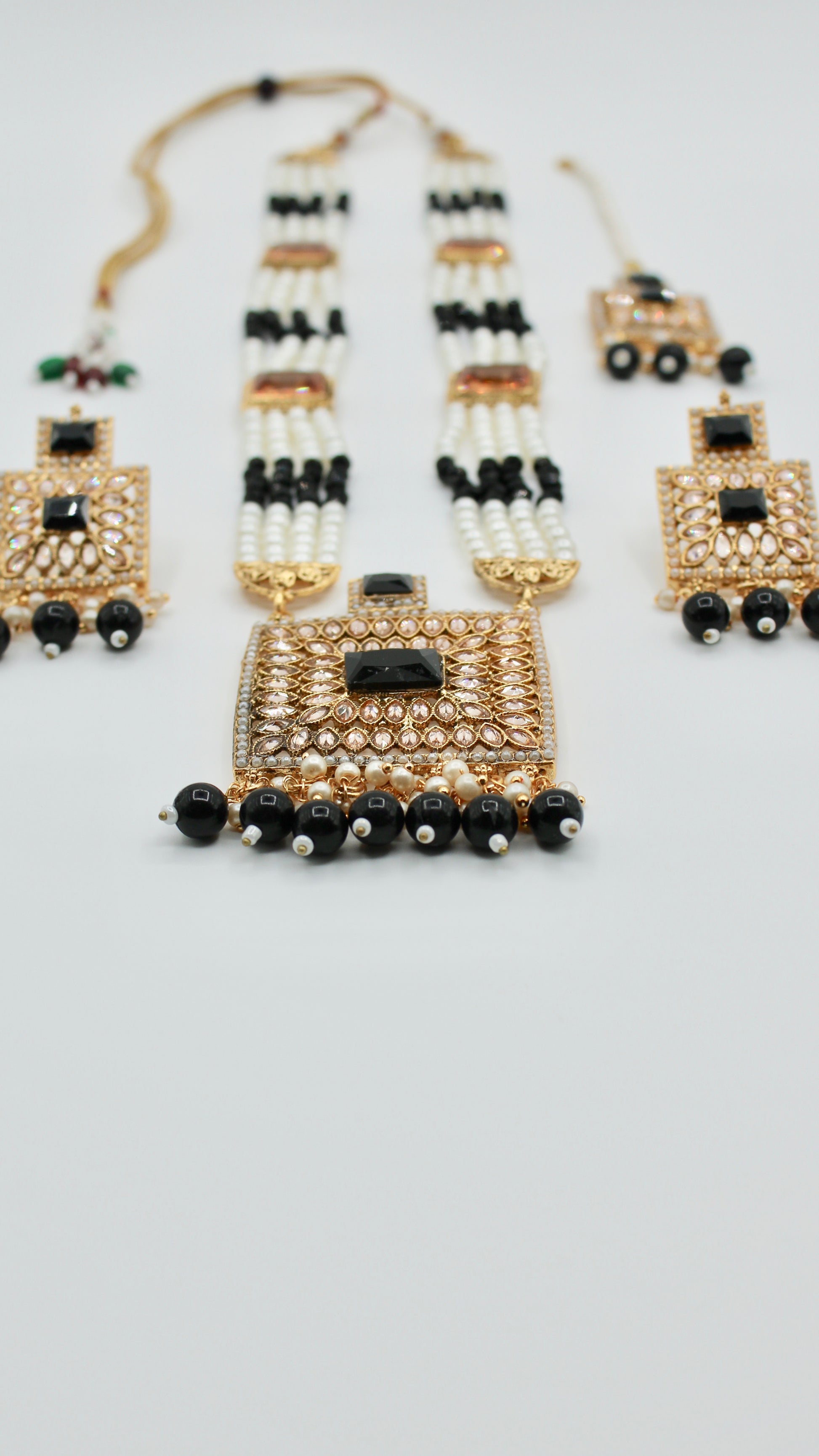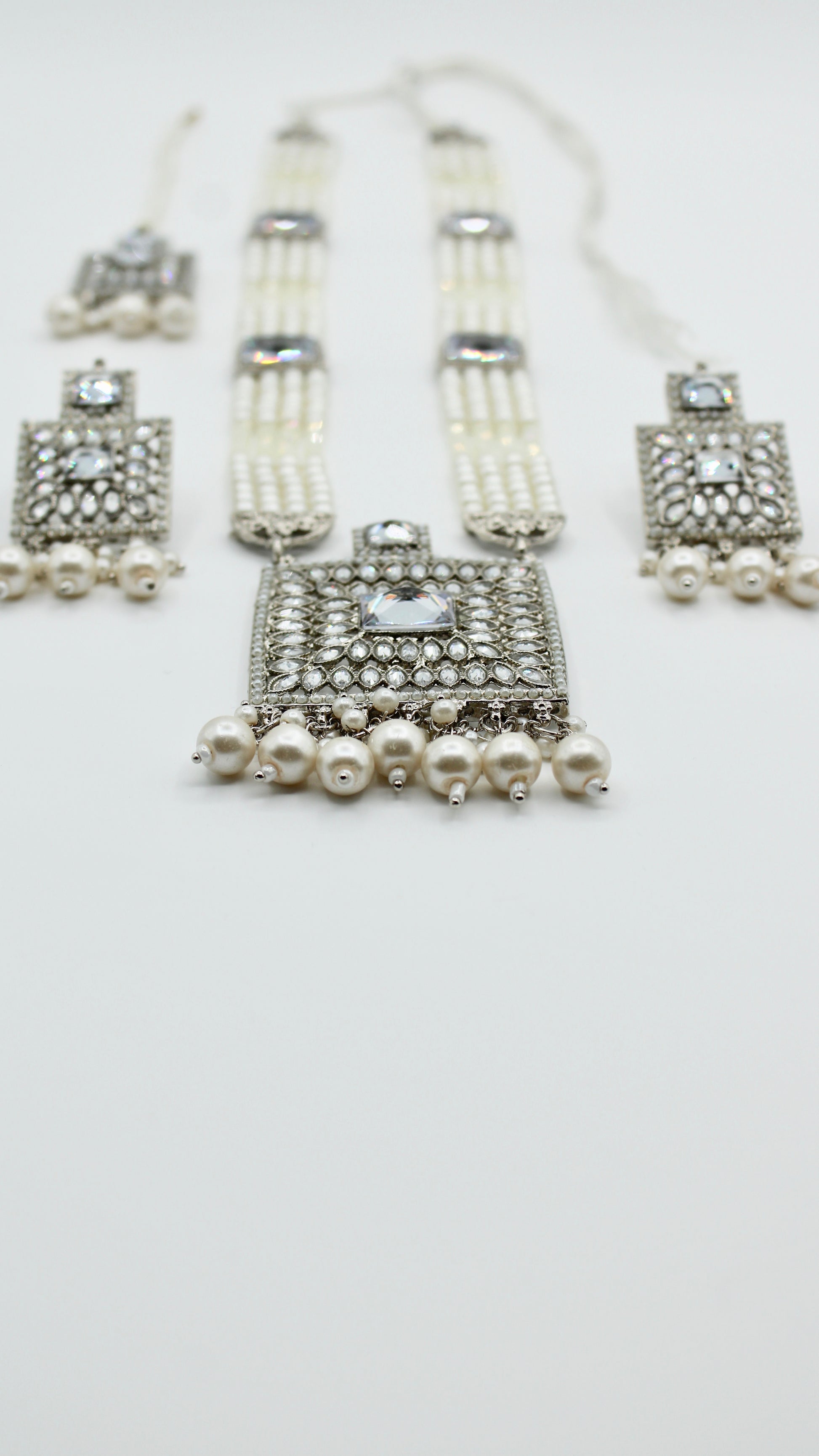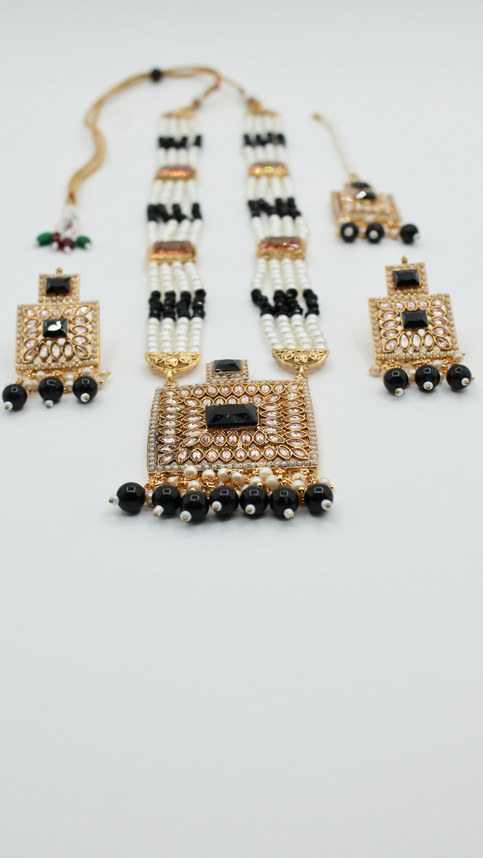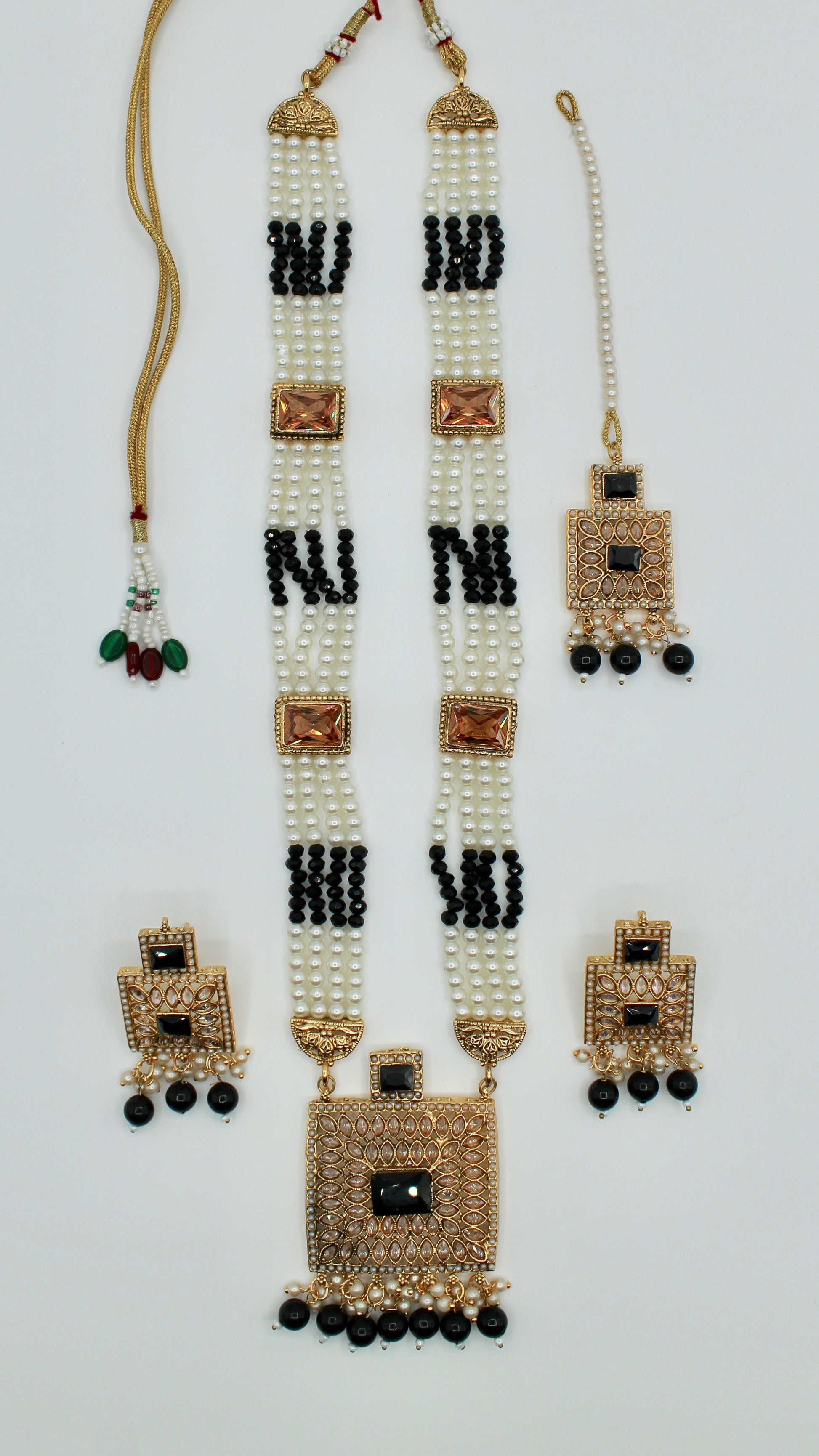 یہ شاندار مربع شکل کا لاکٹ مالا سیٹ کیوبک زرکونیا اور موتیوں سے ہاتھ سے بنایا گیا ہے۔ یہ مالا موتیوں اور کرسٹل کی تہوں کے ساتھ ہاتھ سے بنی ہوئی ہے۔ اس سیٹ میں بالیاں اور ایک ٹیکا شامل ہے۔