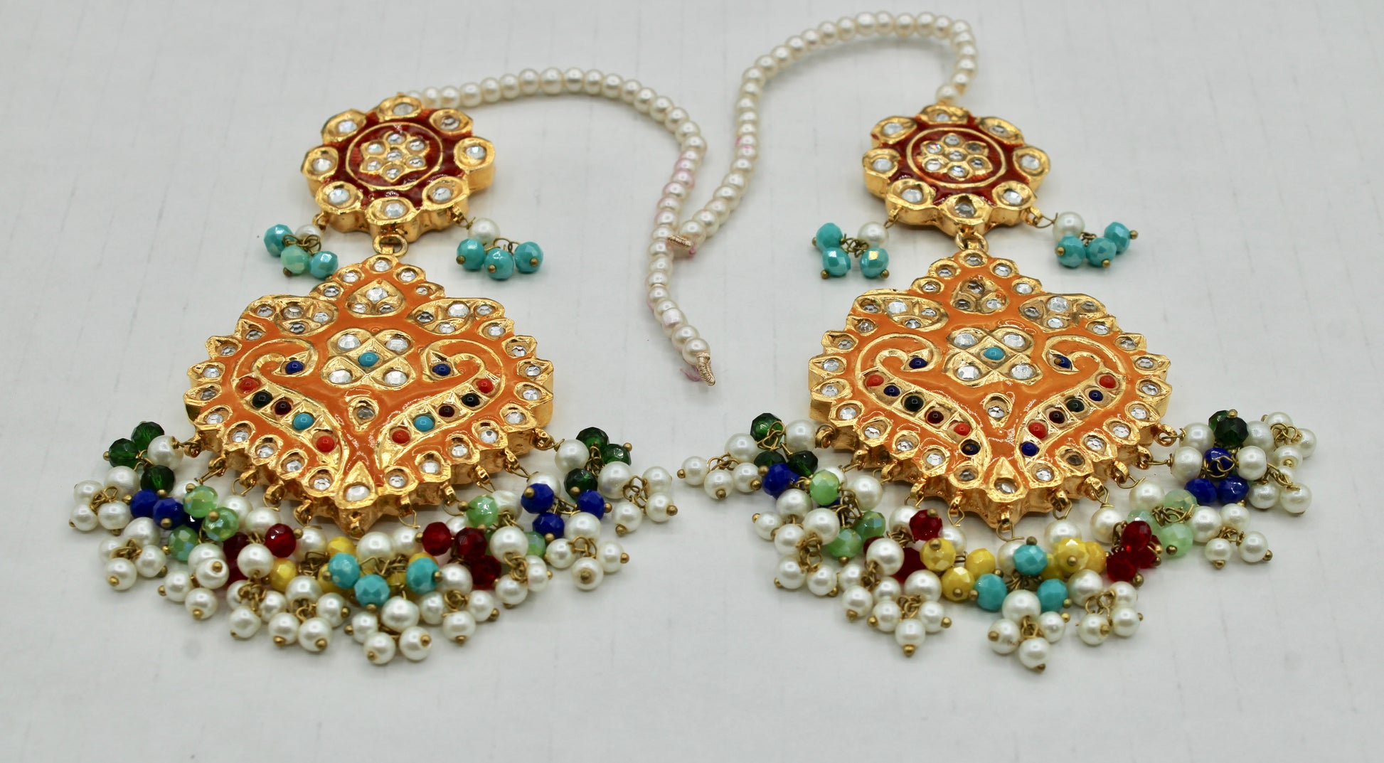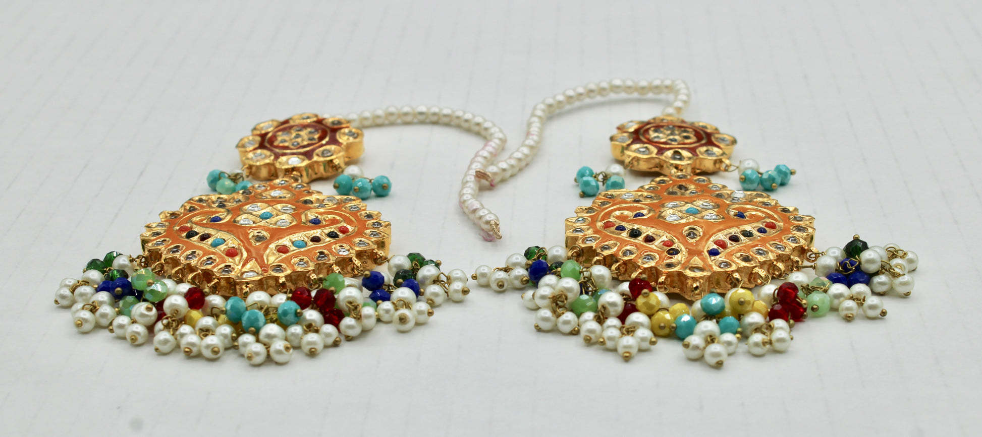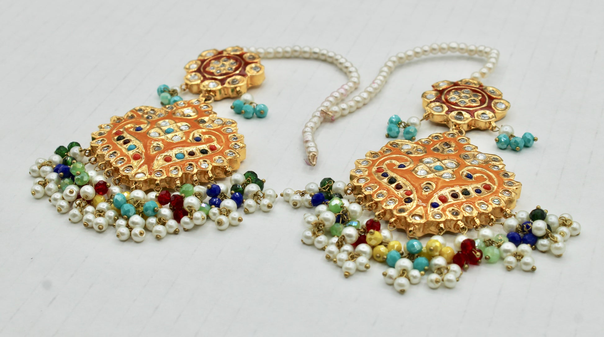 ہاتھ سے تیار کی گئی یہ بالیاں پاکستانی تھپا کندن ہیں، جو مینا کے کام، موتیوں، موتیوں اور بُنے ہوئے سہارا کی تفصیلات کے ساتھ مکمل ہیں۔ پروڈکٹ کی زندگی بھر میں اضافہ کرنے کے لیے پیتل اور 24k گولڈ چڑھایا۔