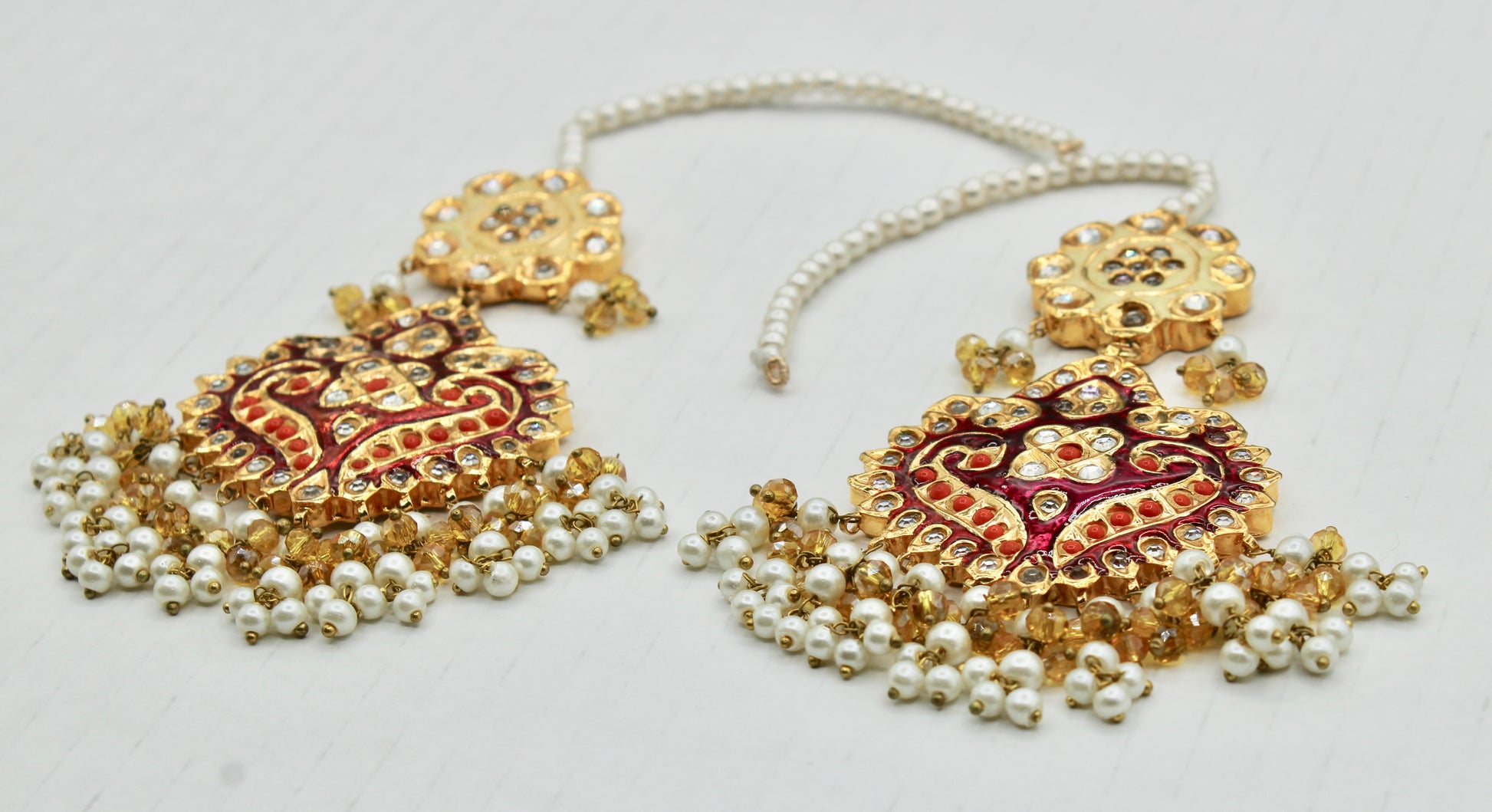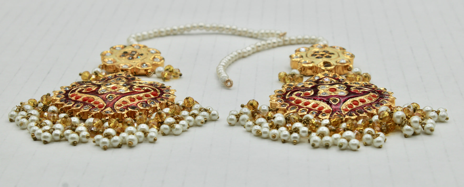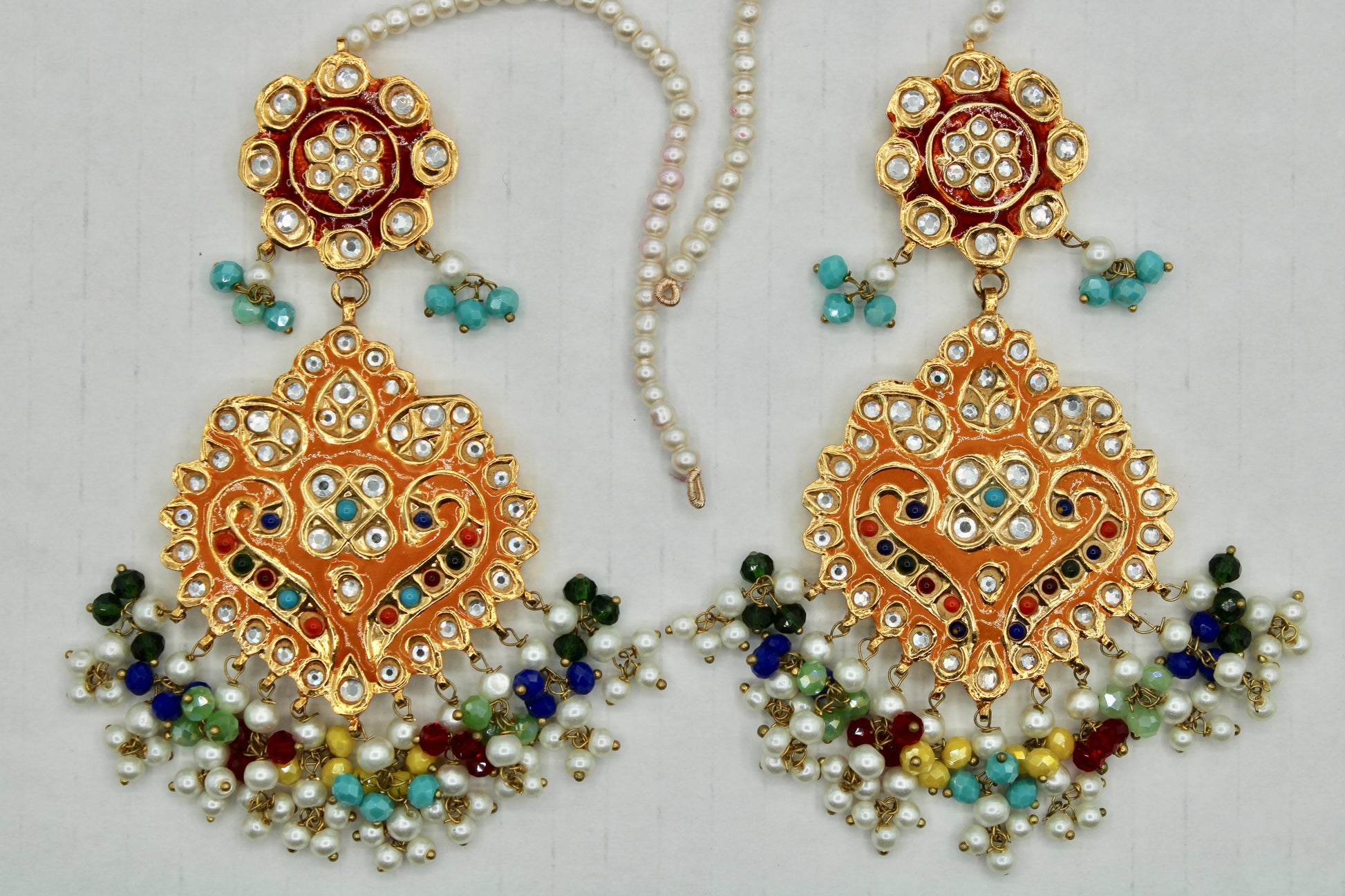 ہاتھ سے تیار کی گئی یہ بالیاں پاکستانی تھپا کندن ہیں، جو مینا کے کام، موتیوں، موتیوں اور بُنے ہوئے سہارا کی تفصیلات کے ساتھ مکمل ہیں۔ پروڈکٹ کی زندگی بھر میں اضافہ کرنے کے لیے پیتل اور 24k گولڈ چڑھایا۔