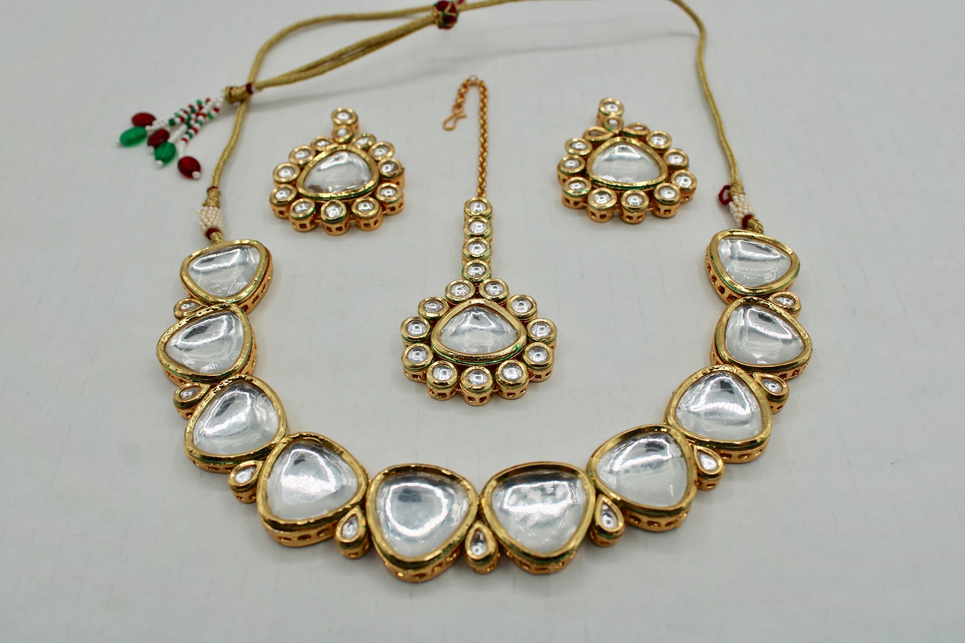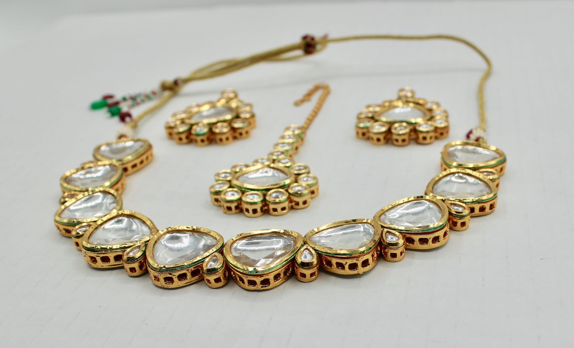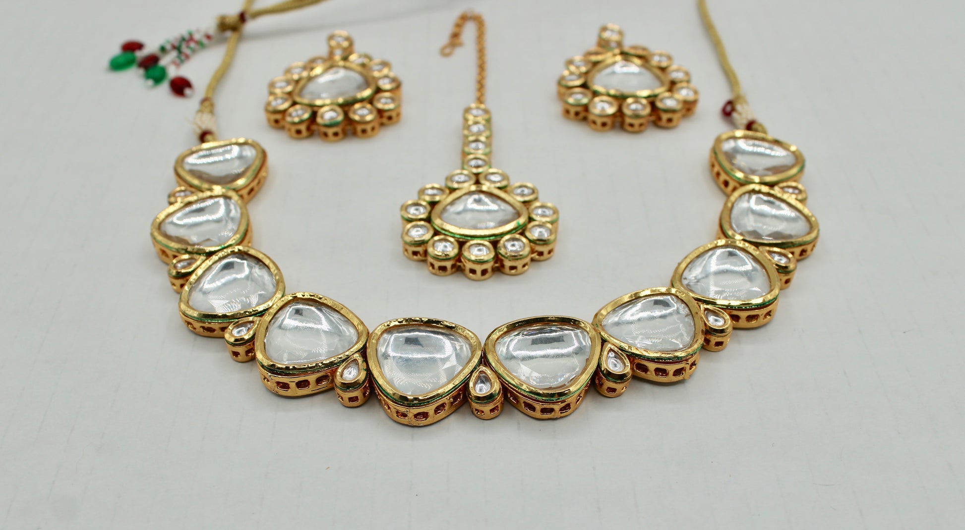 یہ ہاتھ سے بنایا ہوا کندن سیٹ بالیاں اور ٹیکا کے ساتھ آتا ہے، جس کی پشت پر مینا کاری ہوتی ہے۔ یہ سیٹ واقعی ایک قسم کا ہے۔ مصنوعات کی زندگی بھر میں اضافہ کرنے کے لیے پیتل سے بنا ہے۔
