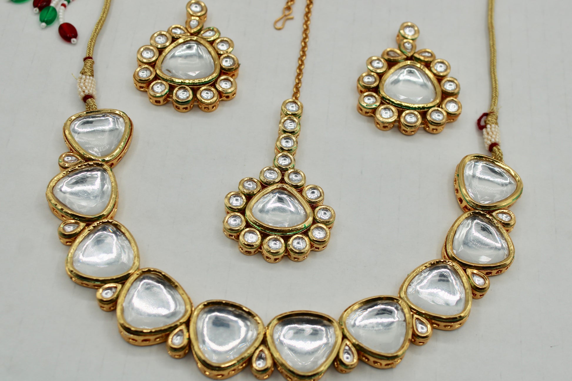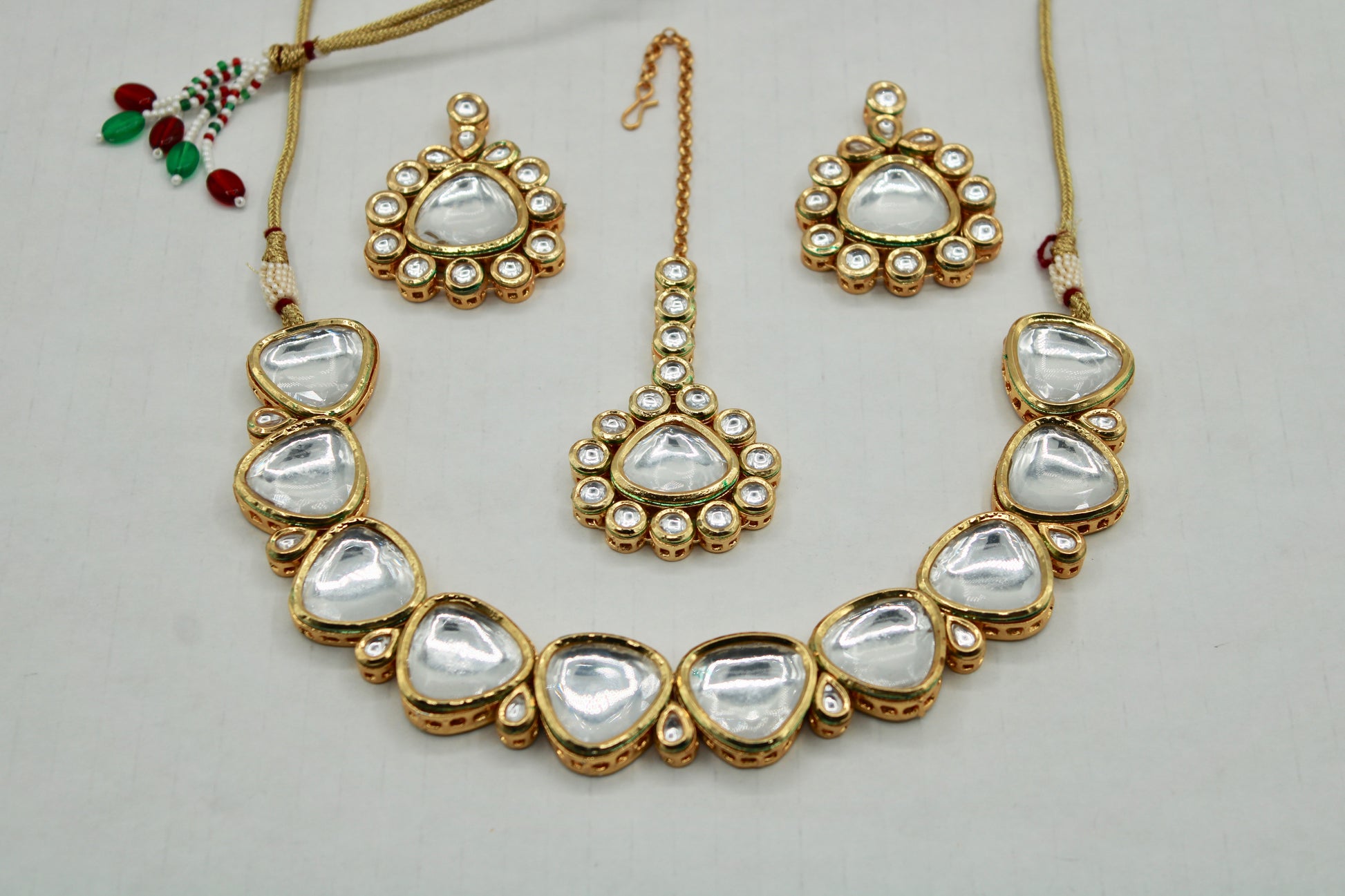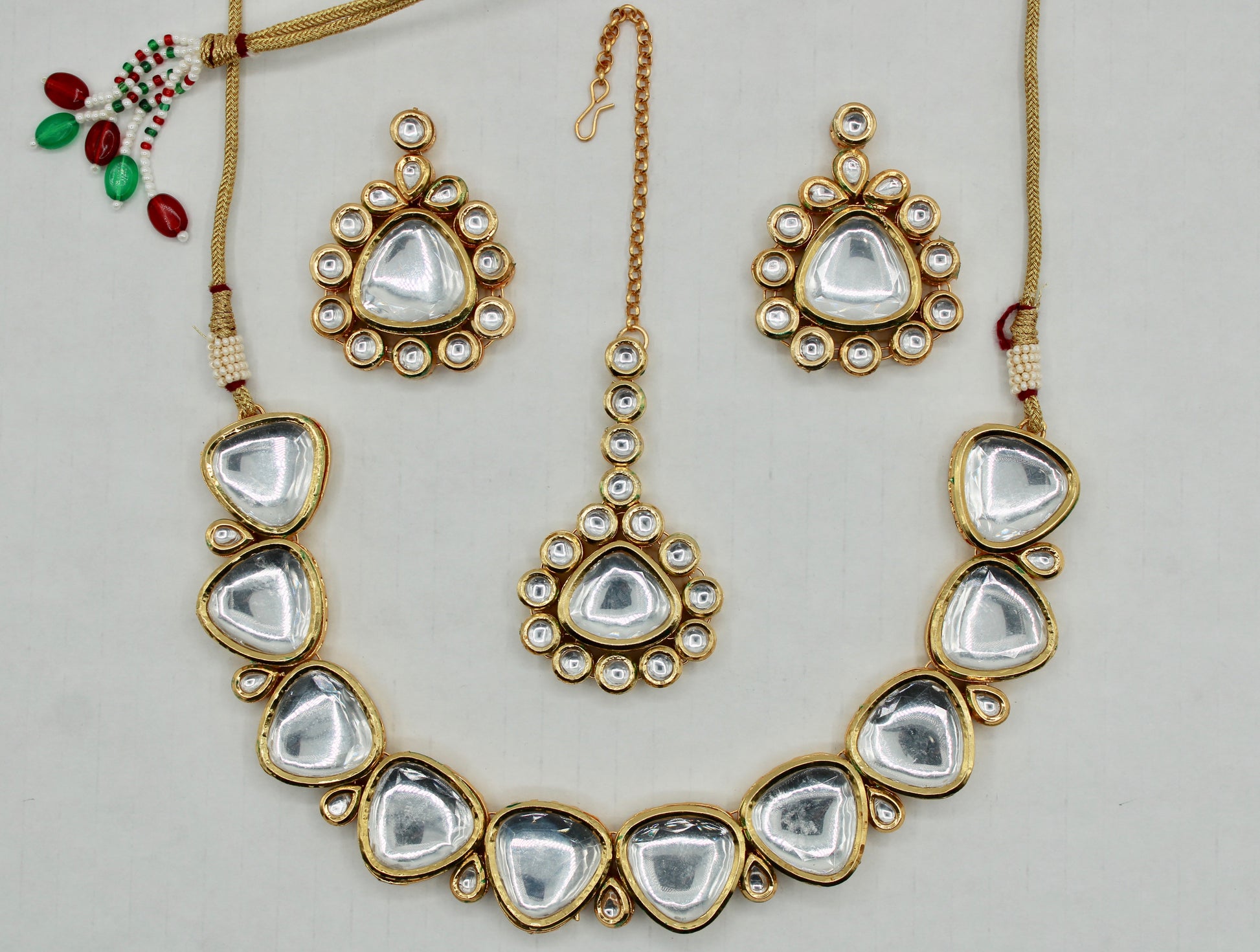 یہ ہاتھ سے بنایا ہوا کندن سیٹ بالیاں اور ٹیکا کے ساتھ آتا ہے، جس کی پشت پر مینا کاری ہوتی ہے۔ یہ سیٹ واقعی ایک قسم کا ہے۔ مصنوعات کی زندگی بھر میں اضافہ کرنے کے لیے پیتل سے بنا ہے۔