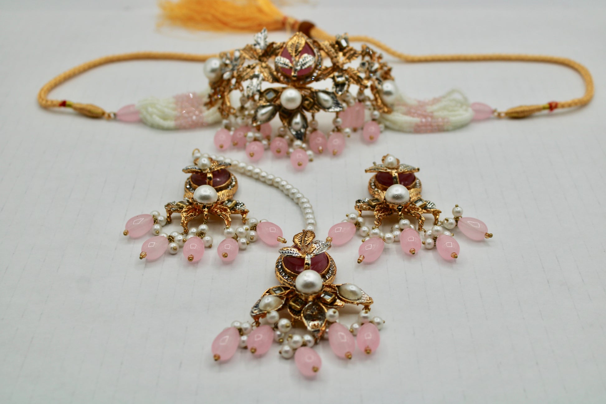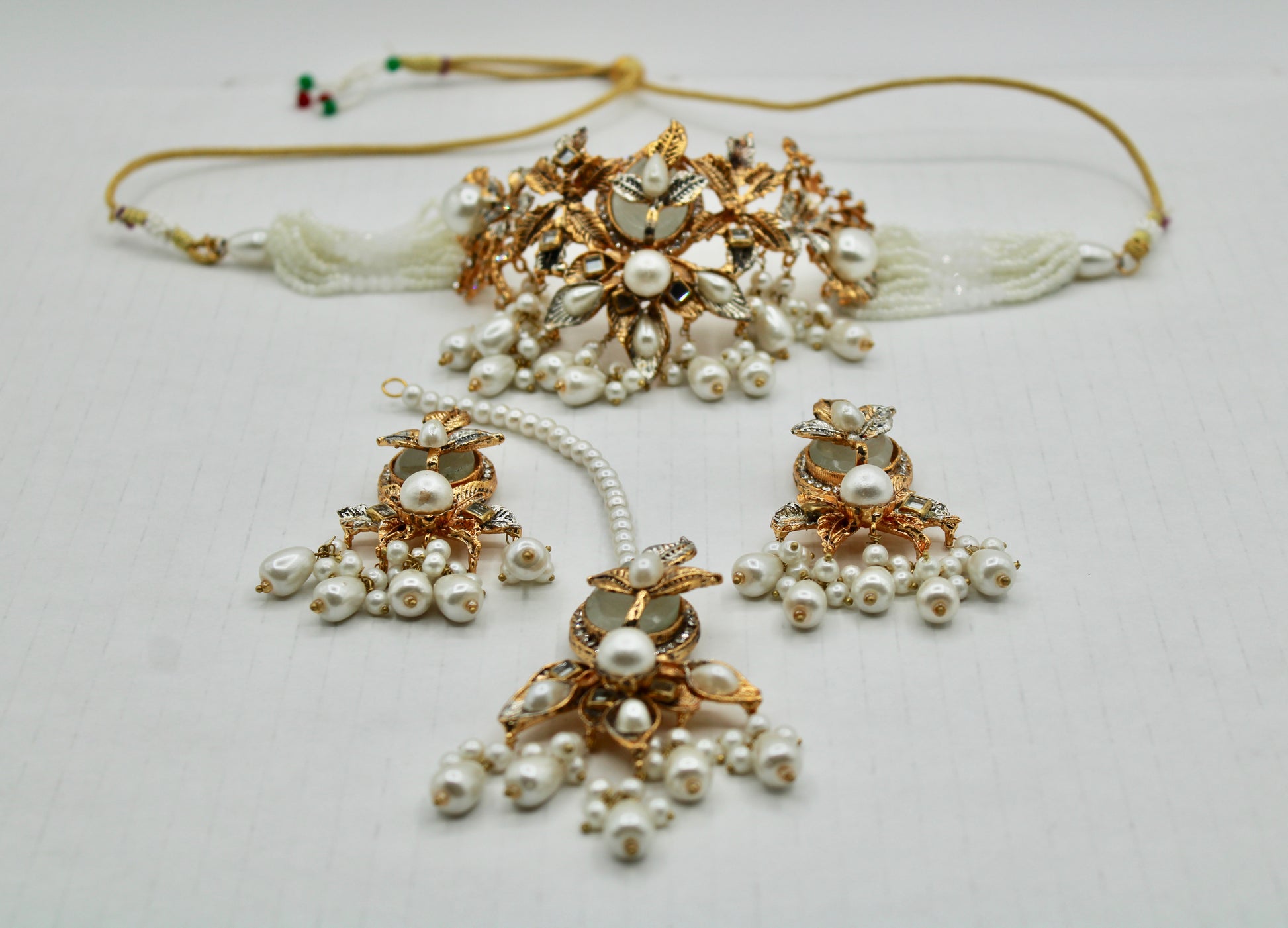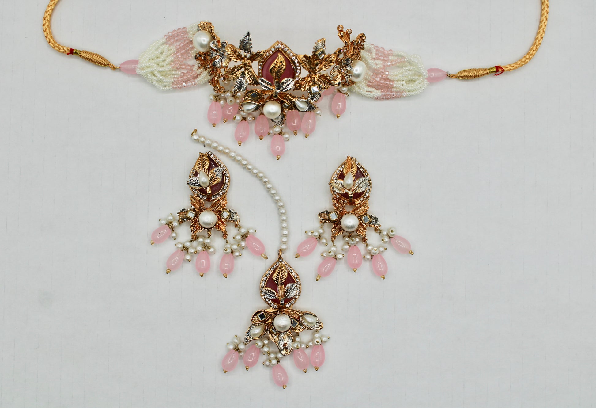 This dazzling fusion choker necklace set is complete with crushed stone, kundan, faux pearls and bead detailing. Each set includes matching earrings and a teeka. Available in two colours.
