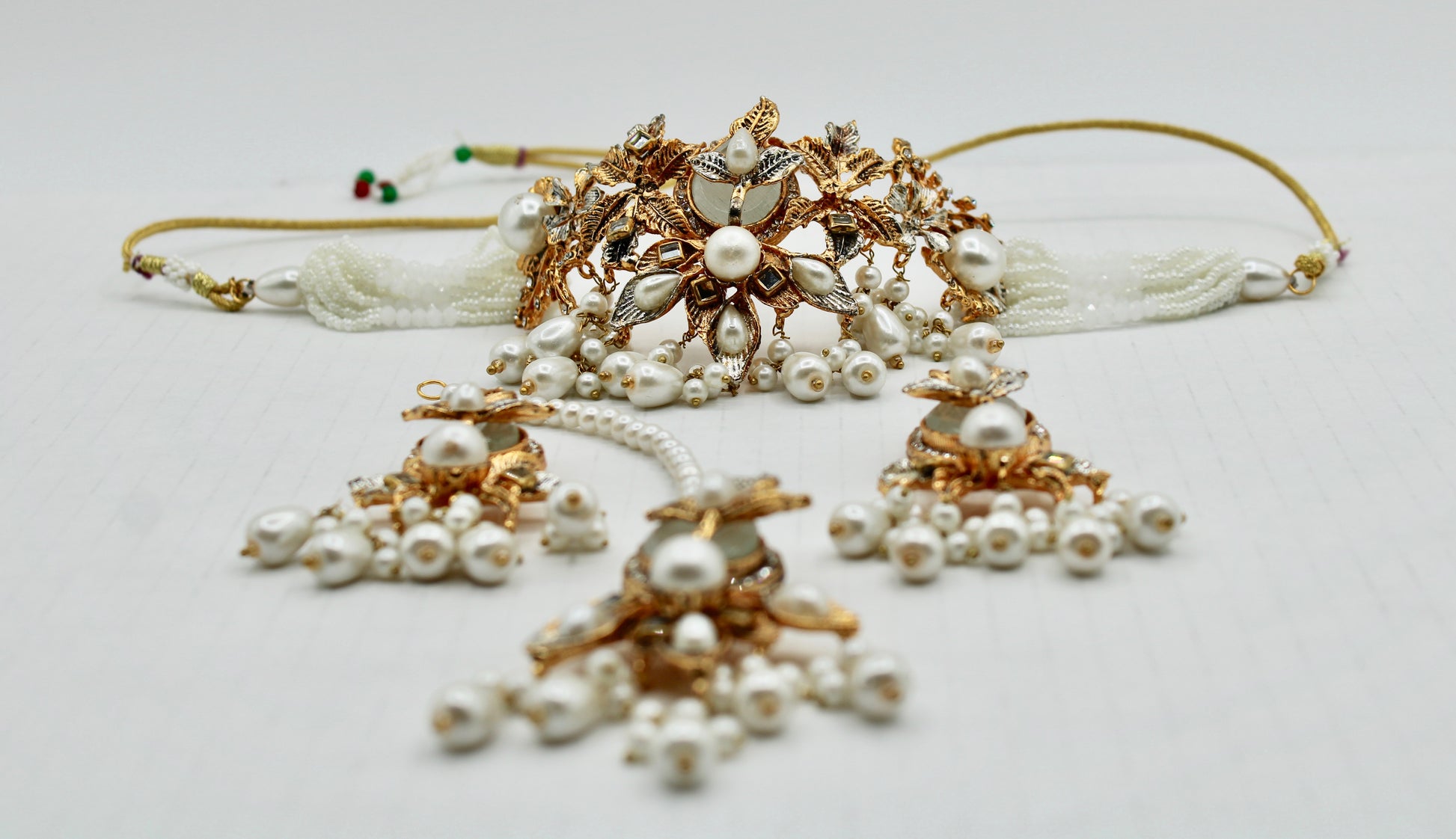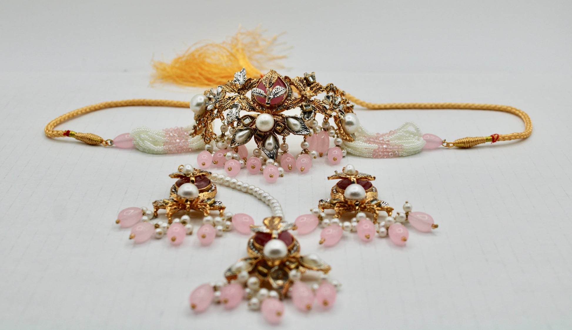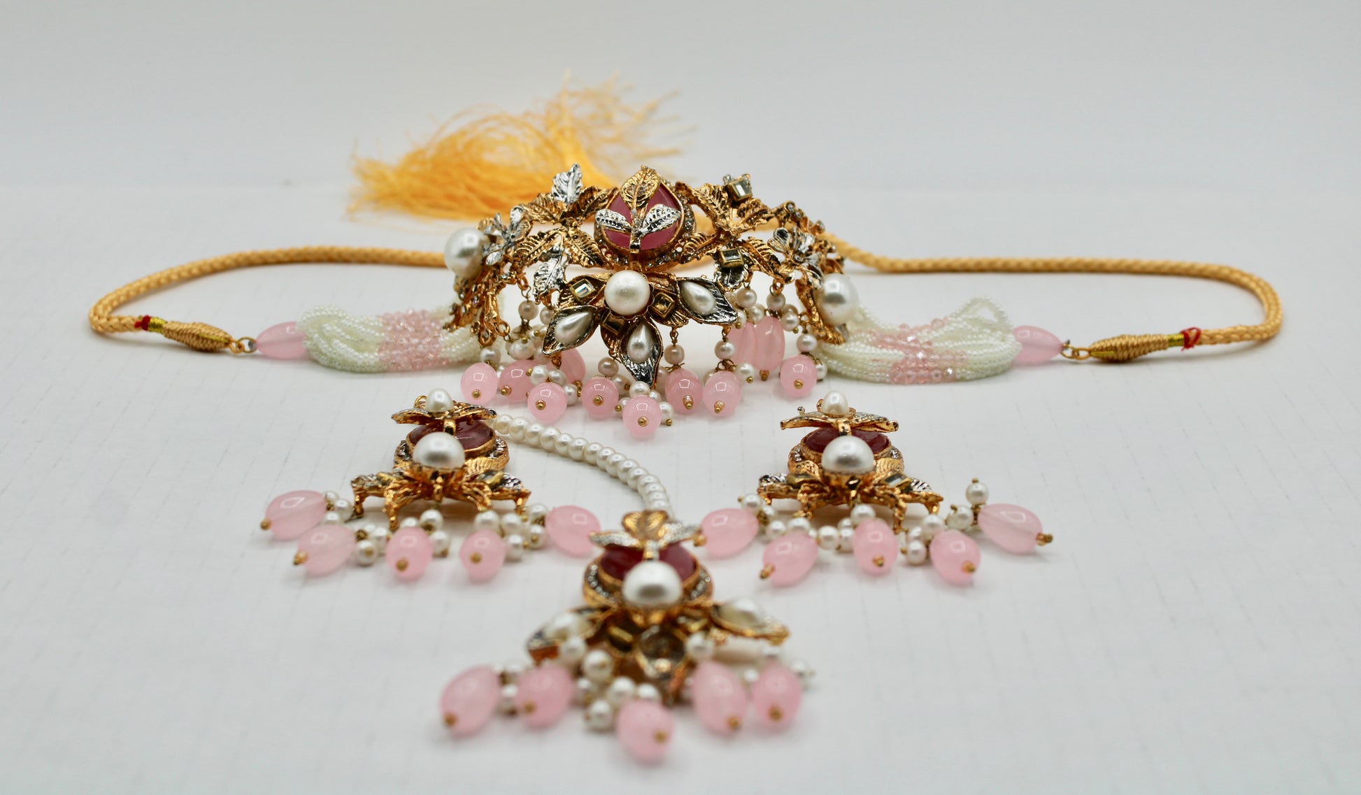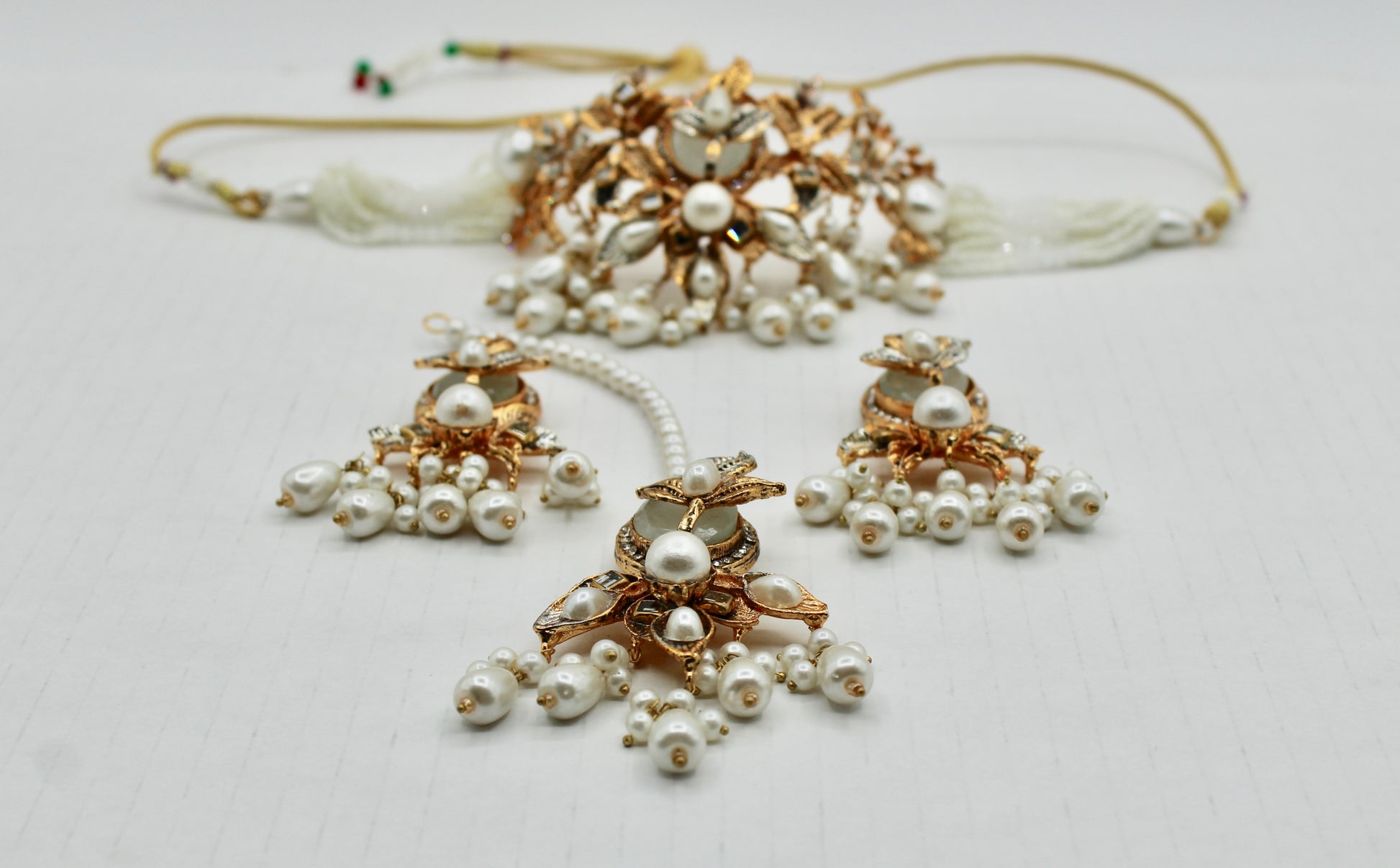 This dazzling fusion choker necklace set is complete with crushed stone, kundan, faux pearls and bead detailing. Each set includes matching earrings and a teeka. Available in two colours.