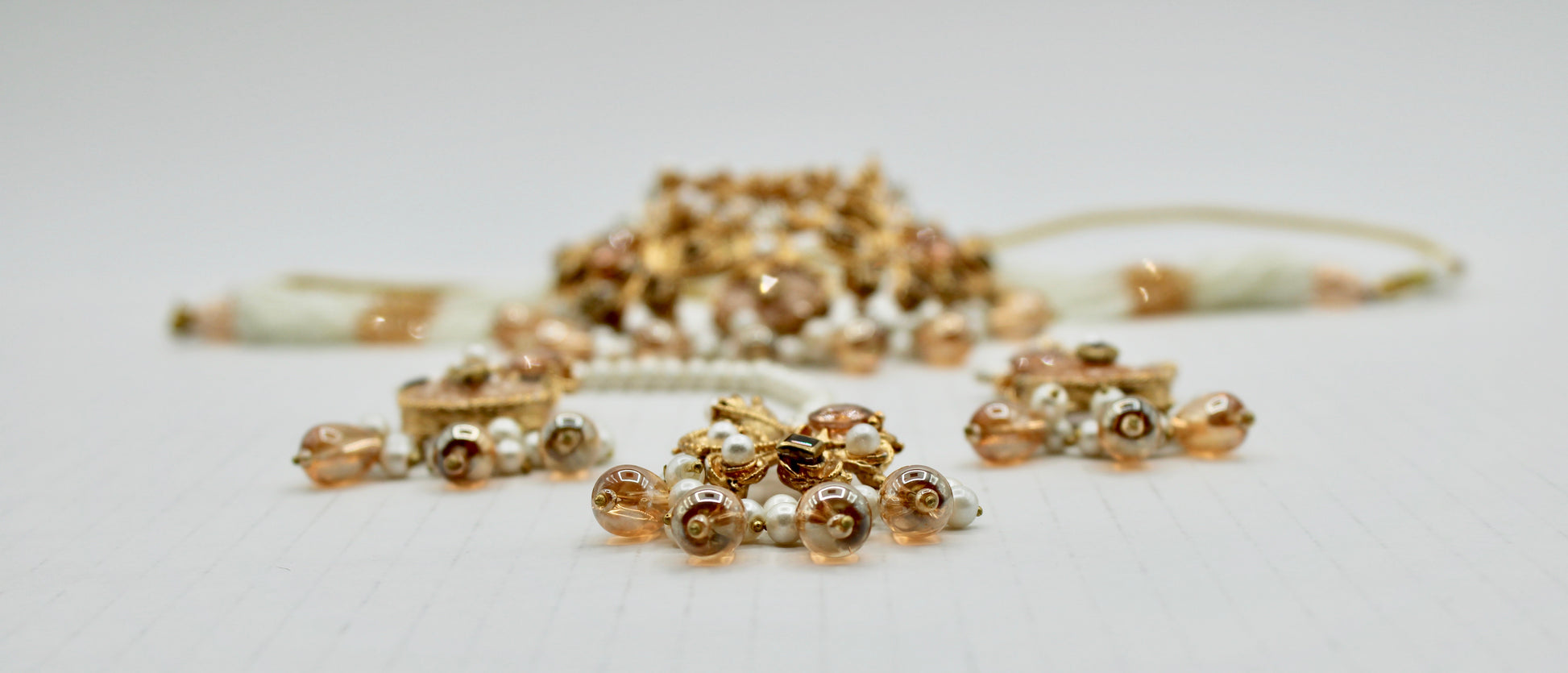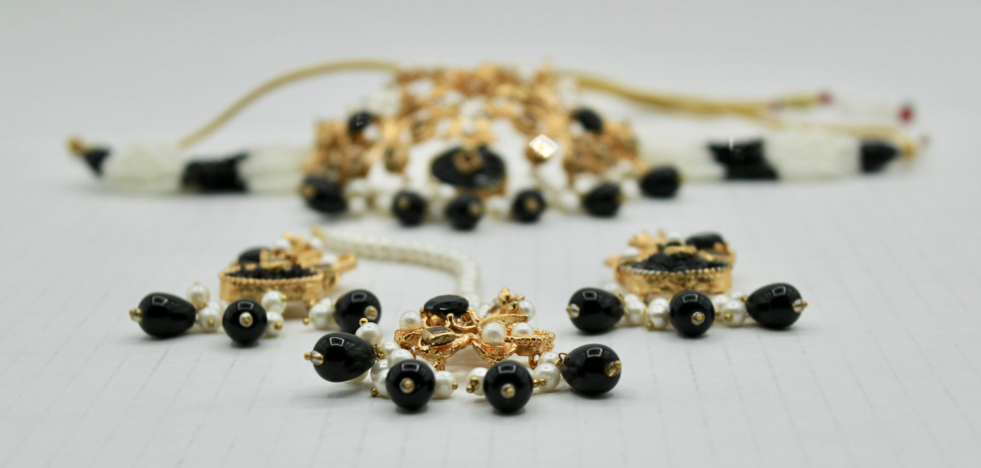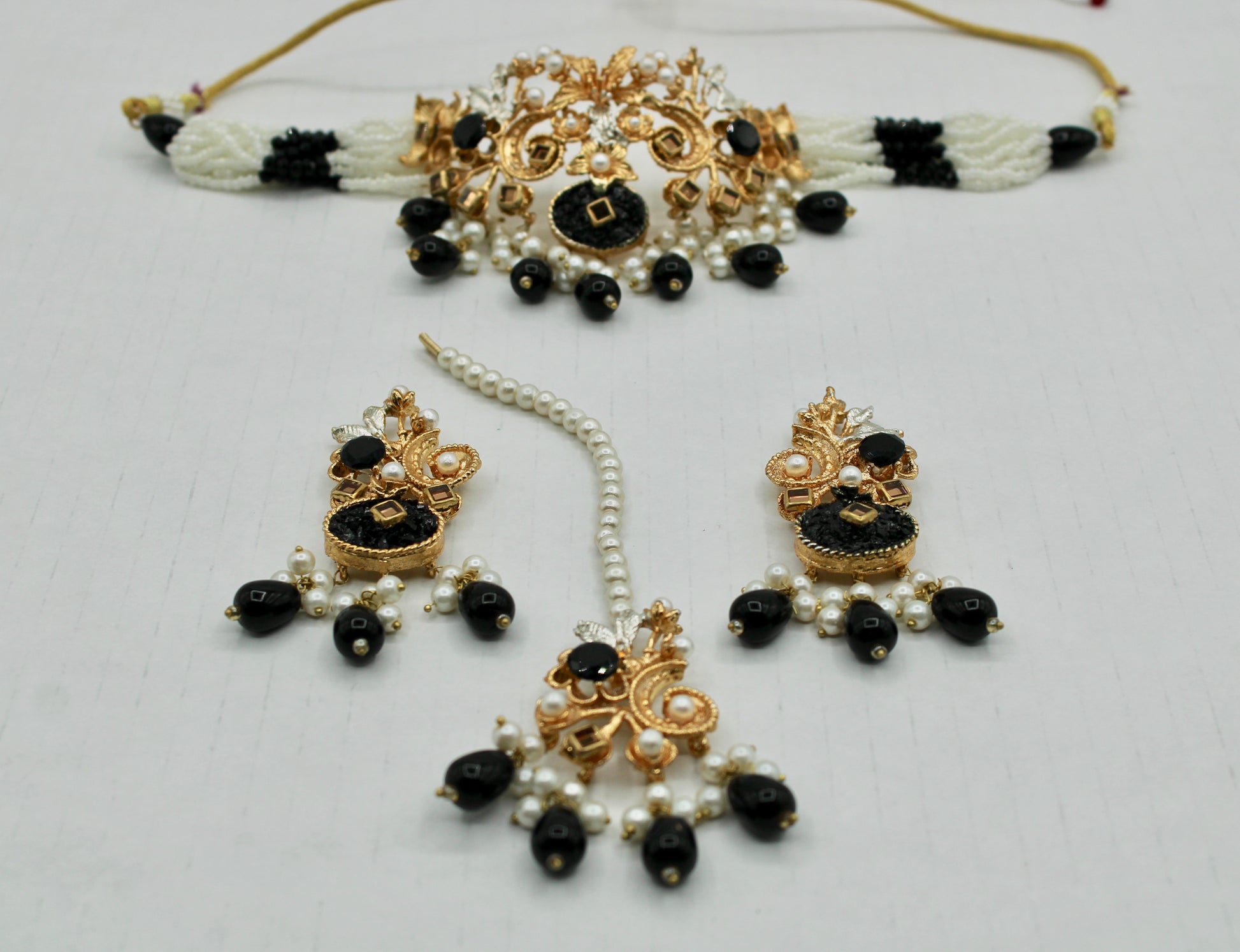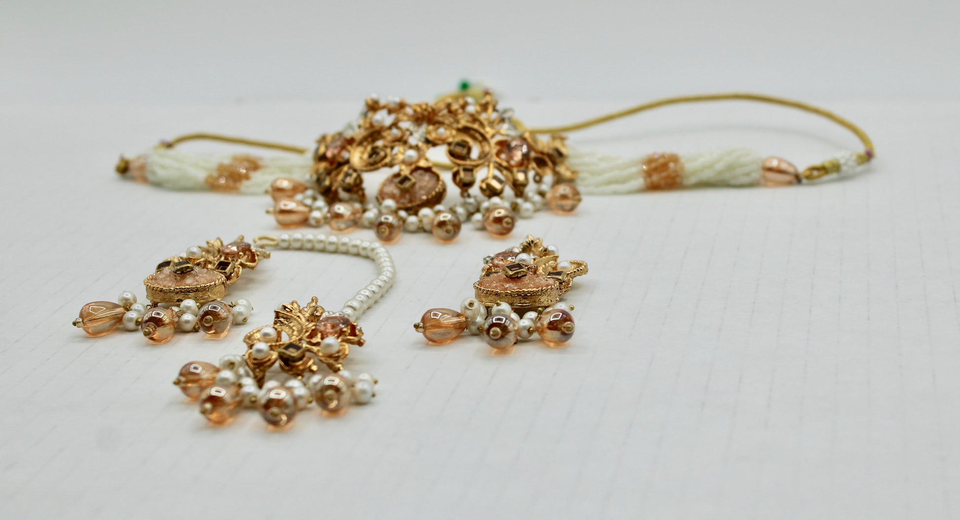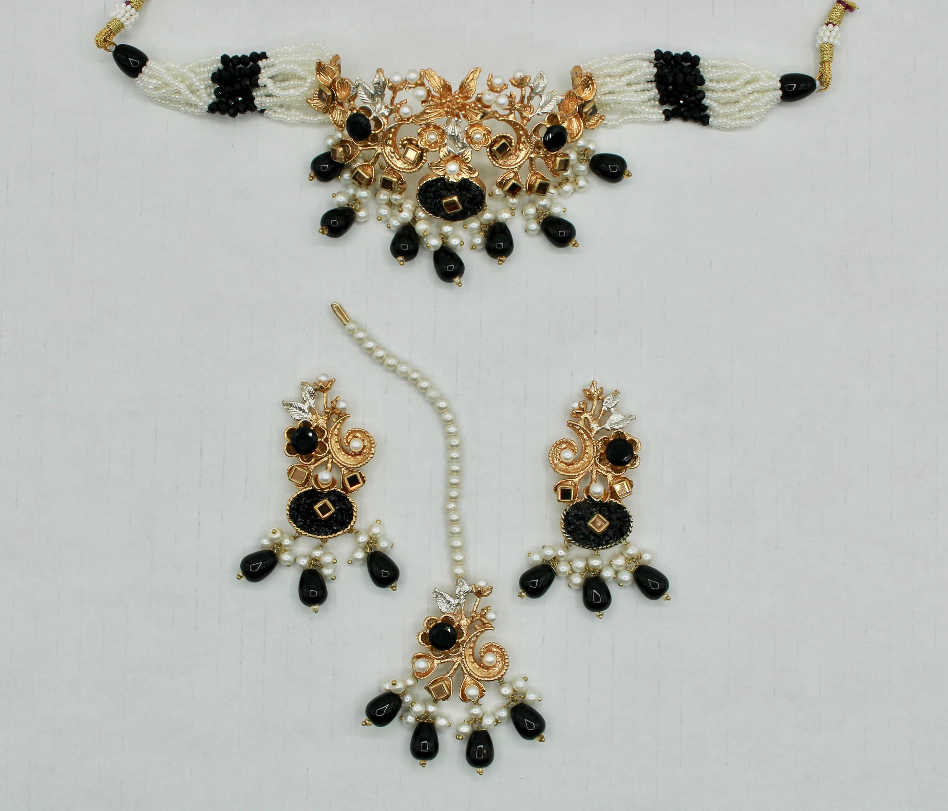 This trending fusion choker set is complete with faux pearls, crushed stone, beads, and floral detailing. The set is complete with matching earrings and a teeka. Available in two colours.